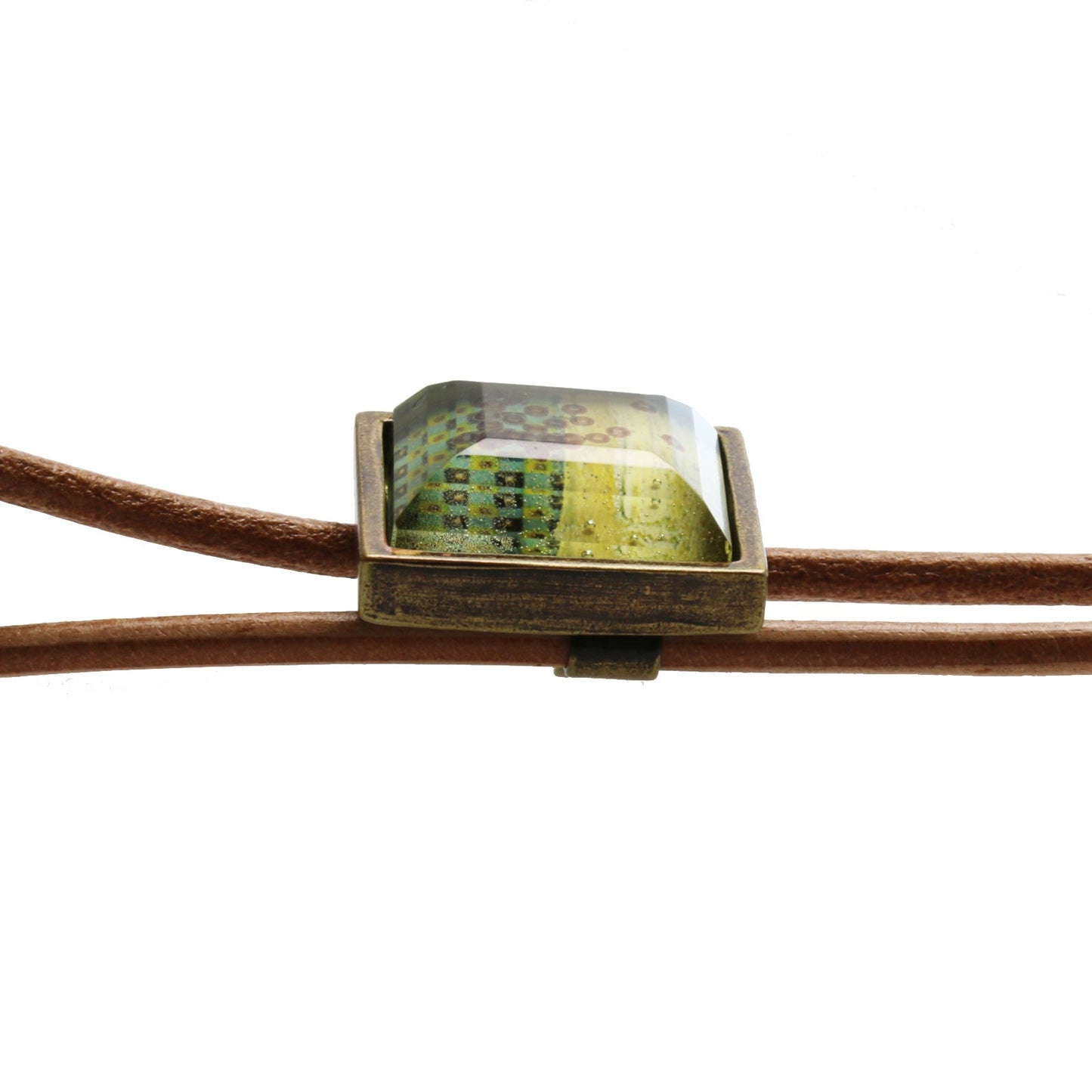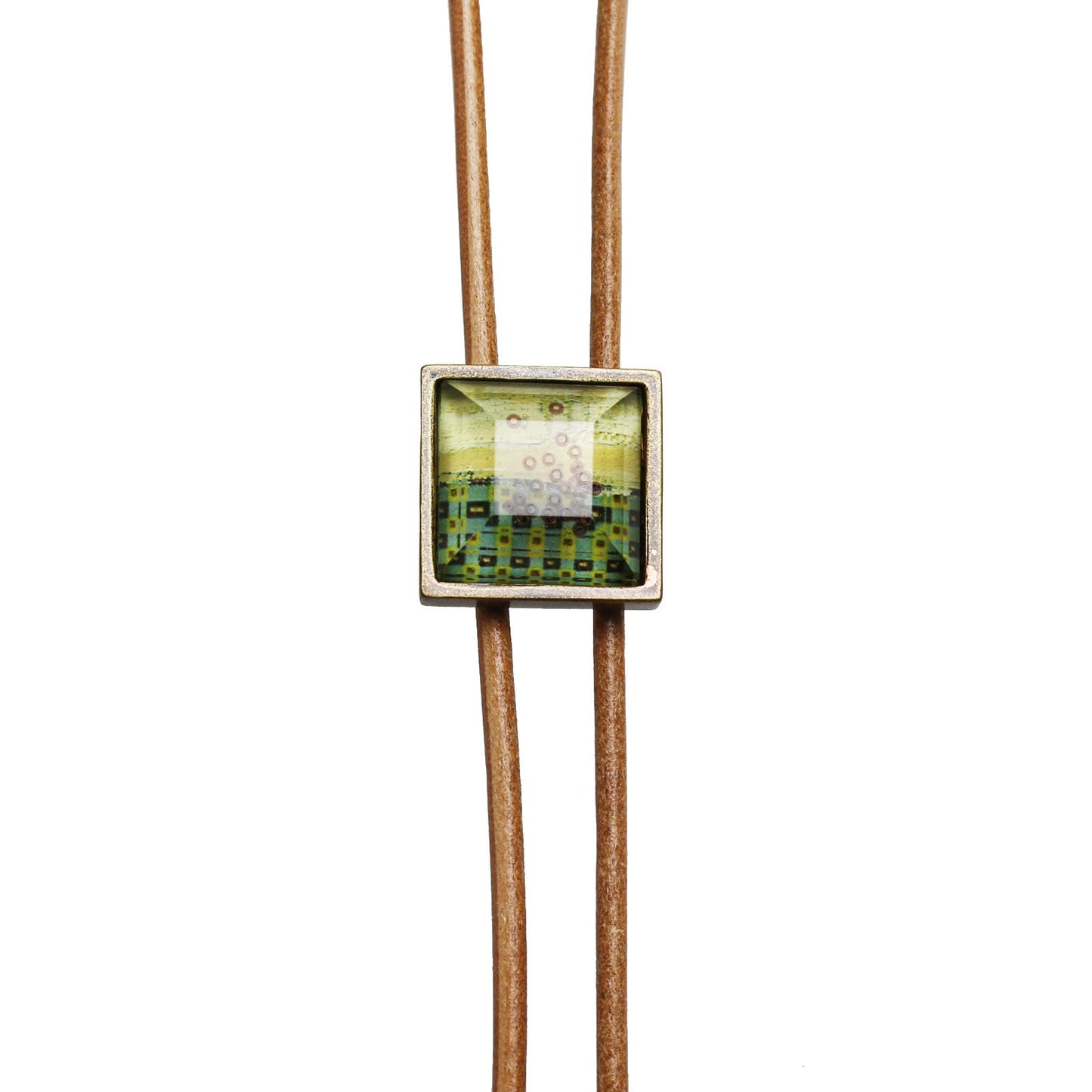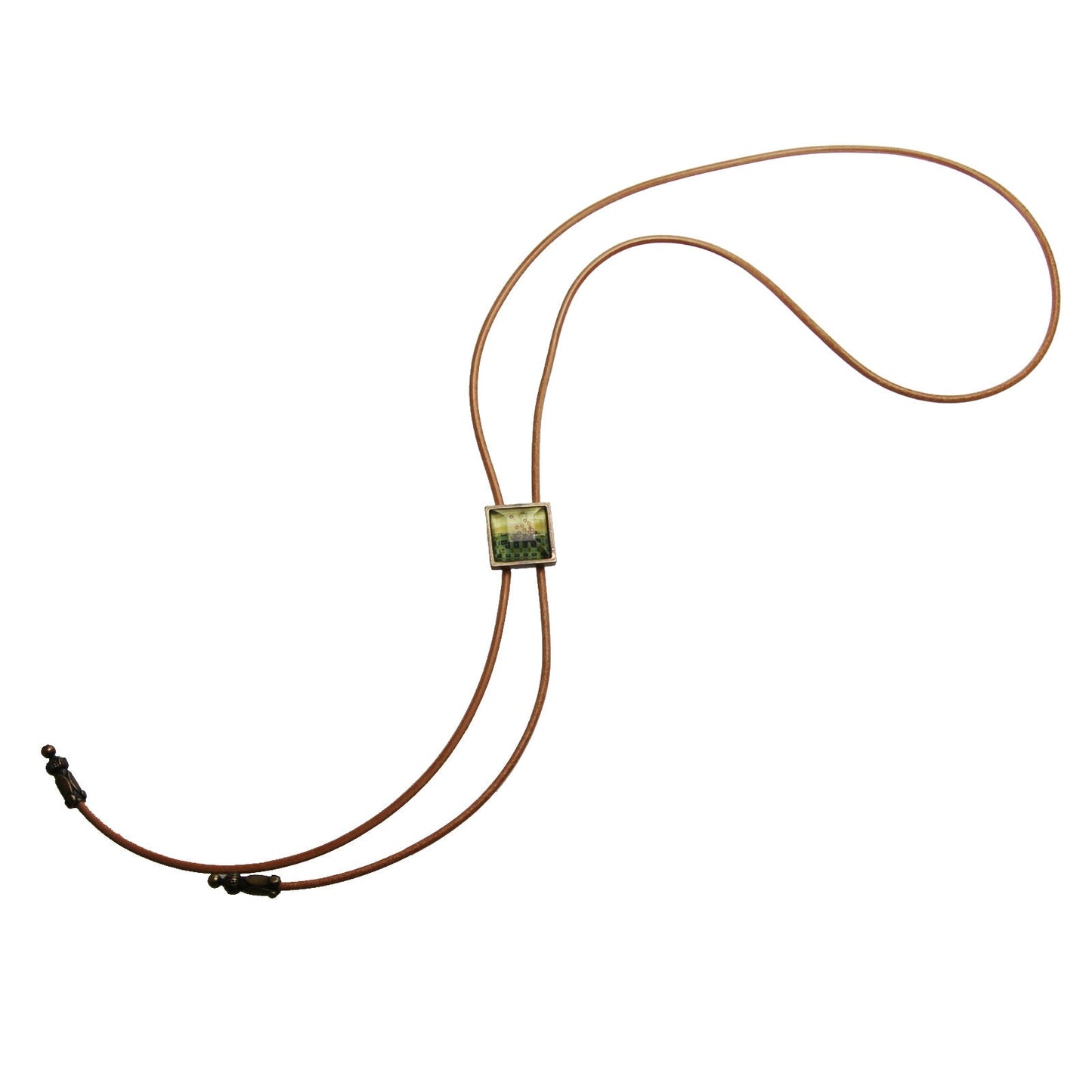 It is a leather strap bolo tie using square resin parts of "Carpet Series" (Green). It is easy to coordinate with chic shades. Pleasing to casual attire accent.