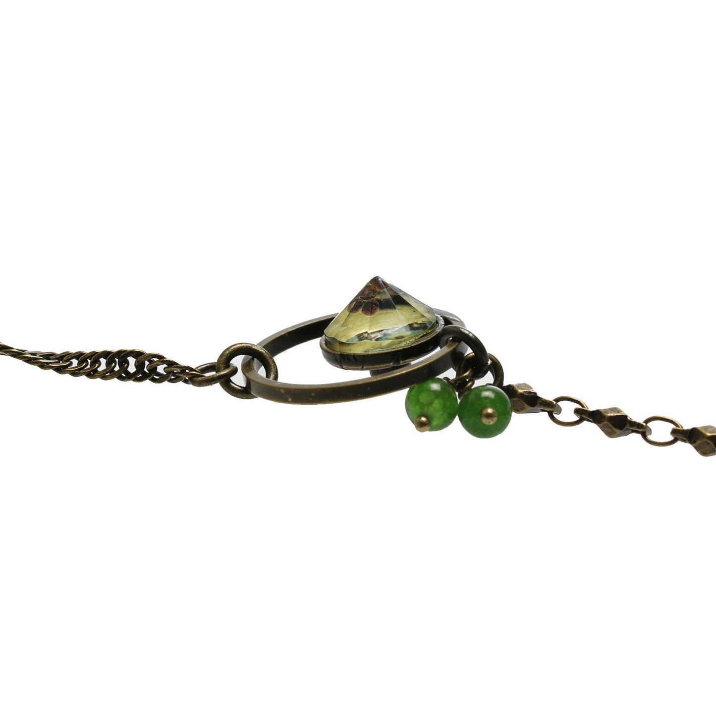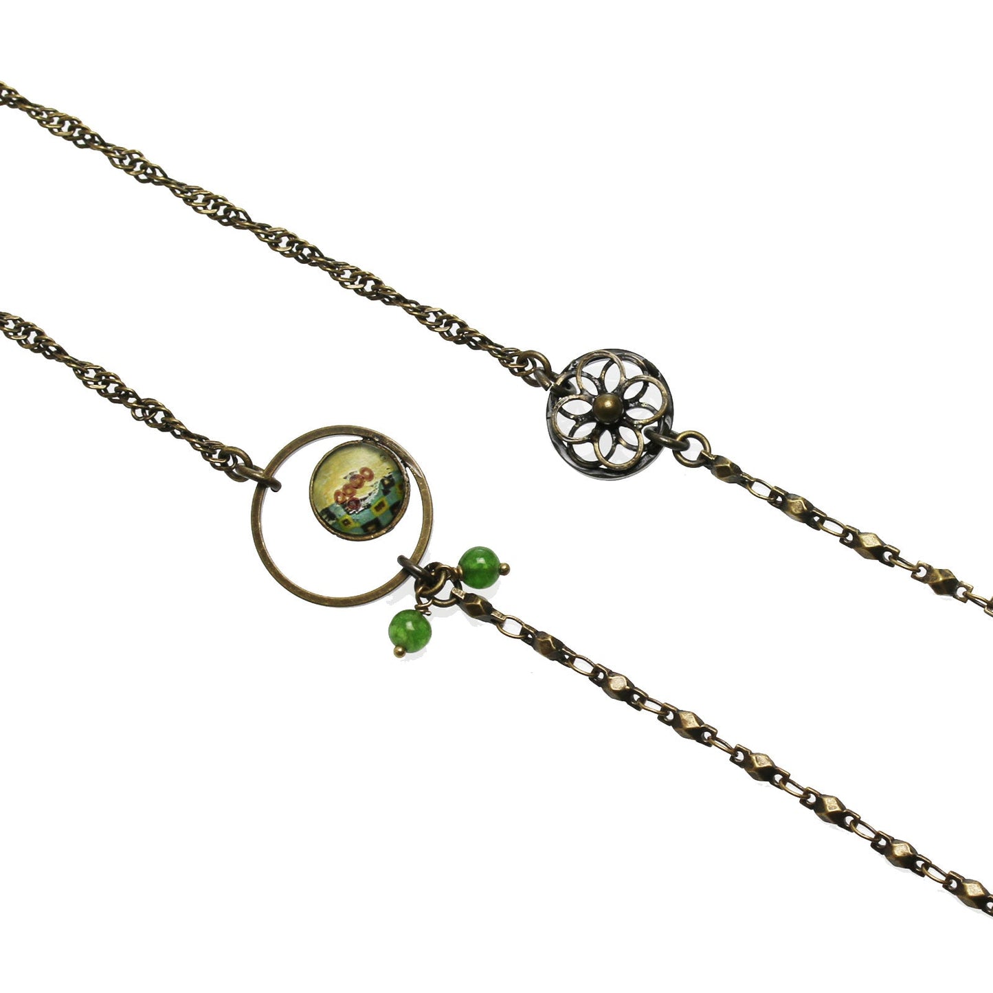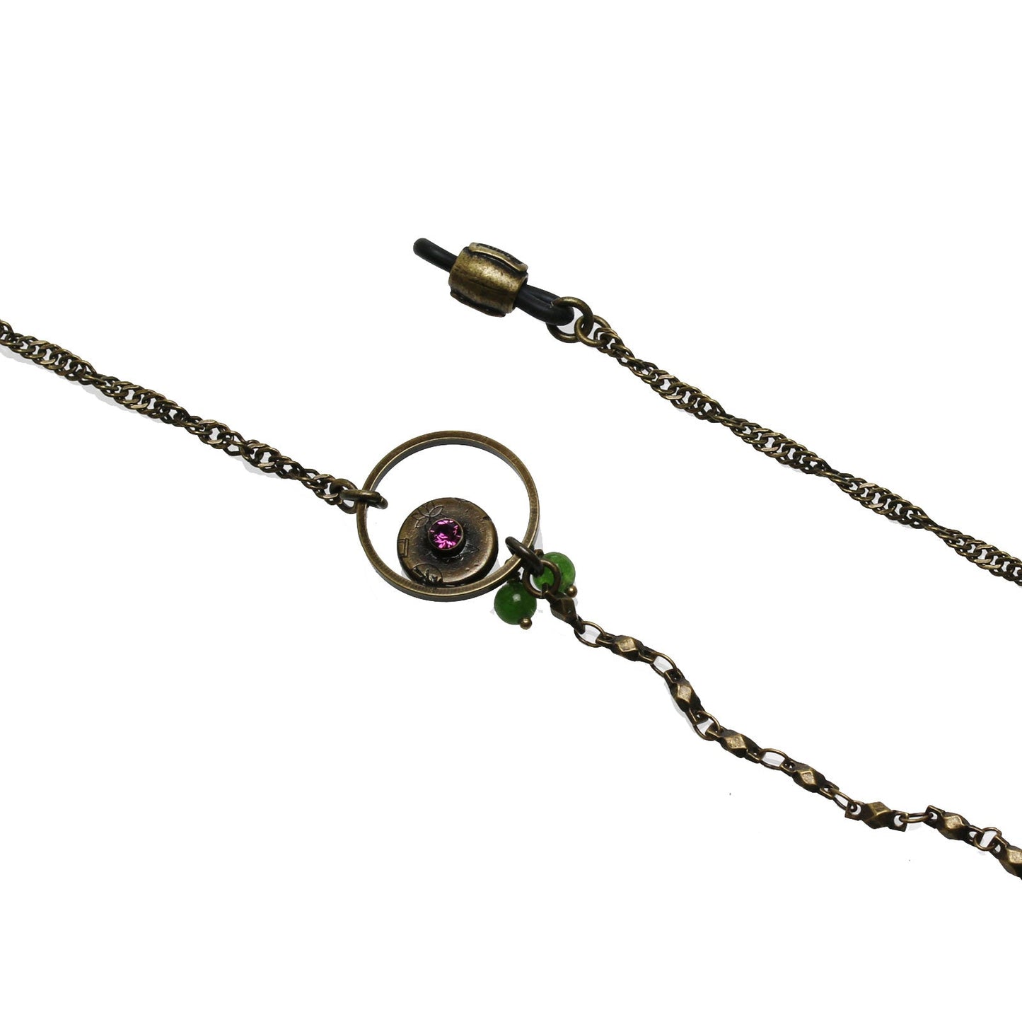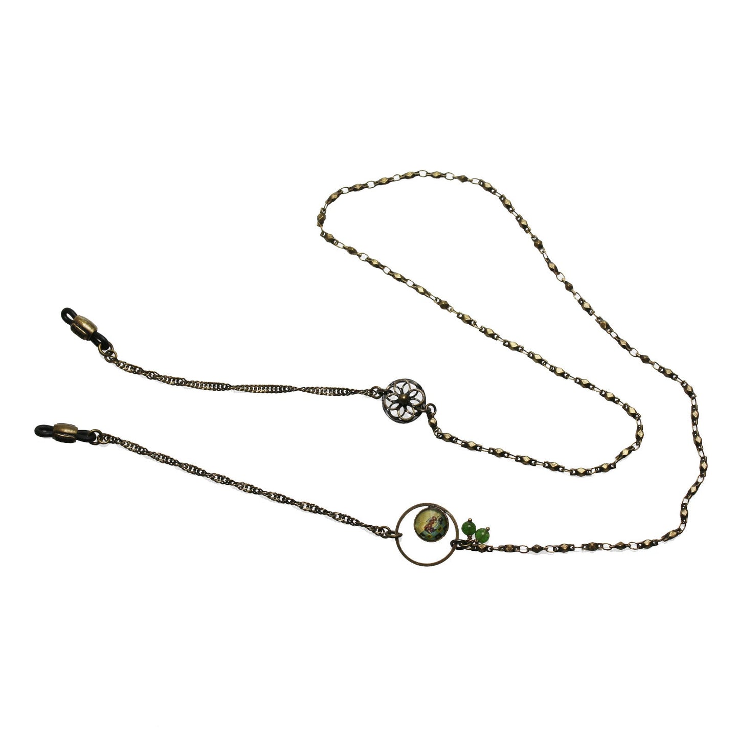 It is an eyeglass chain that uses a resin parts, from the "Carpet Series" (Green). We were hanging two green quartz under the resin. It is a asymmetrical design and using two types of chain.