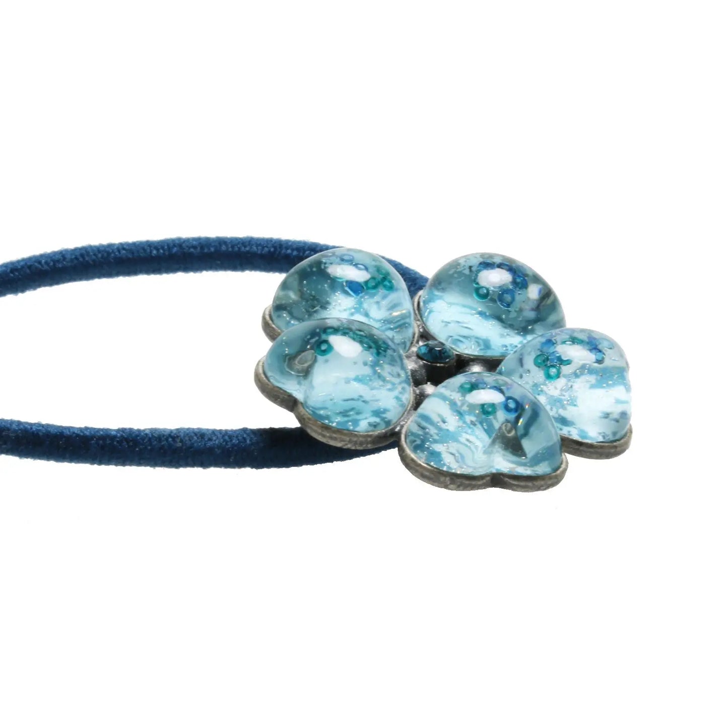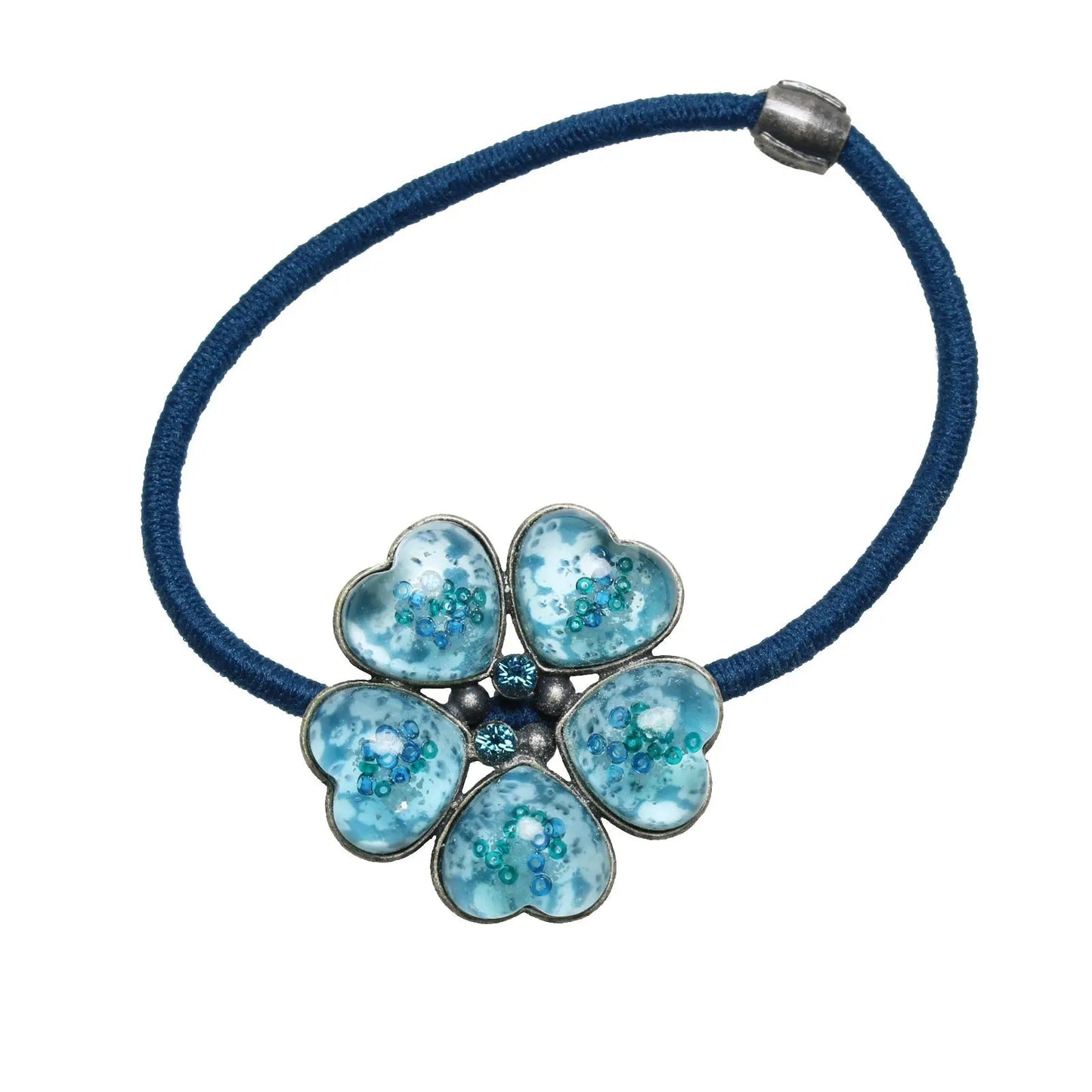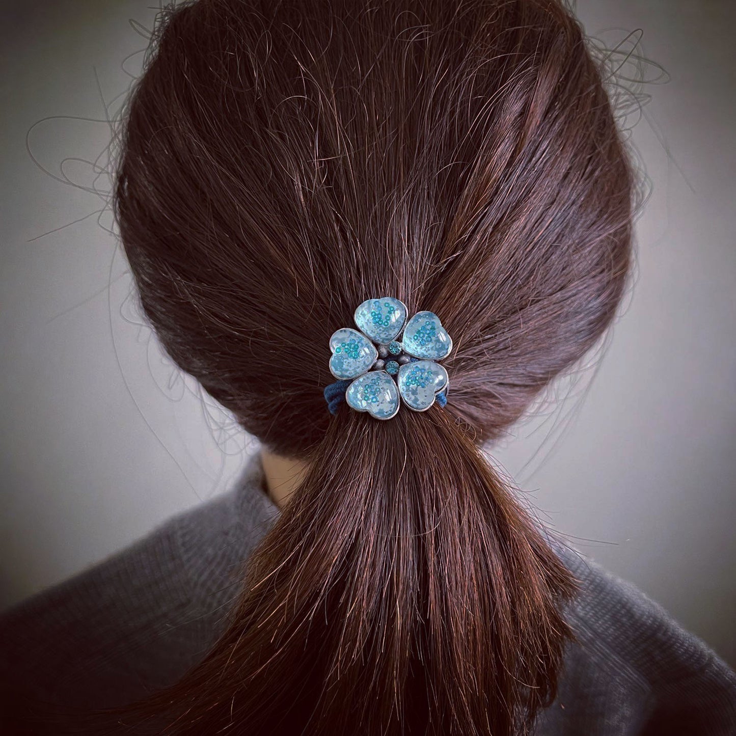 It is a flower hair elastic using the resin parts "Plum Cake Series" (Blue). The beautiful surface cut and transparency are eye-catching. The blue rhinestones at the center are flickering. If you use this, your back style brings a stylish look. Our hair elastic is an ideal gift for adults.