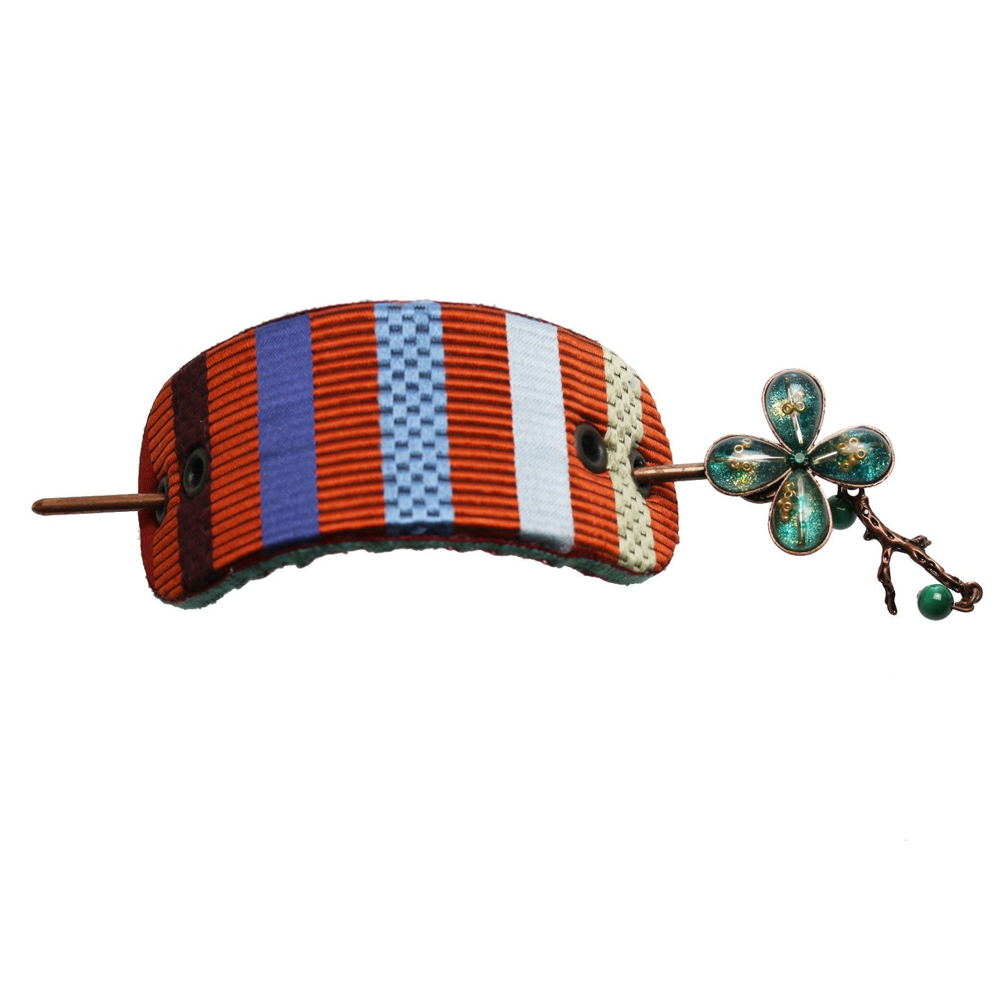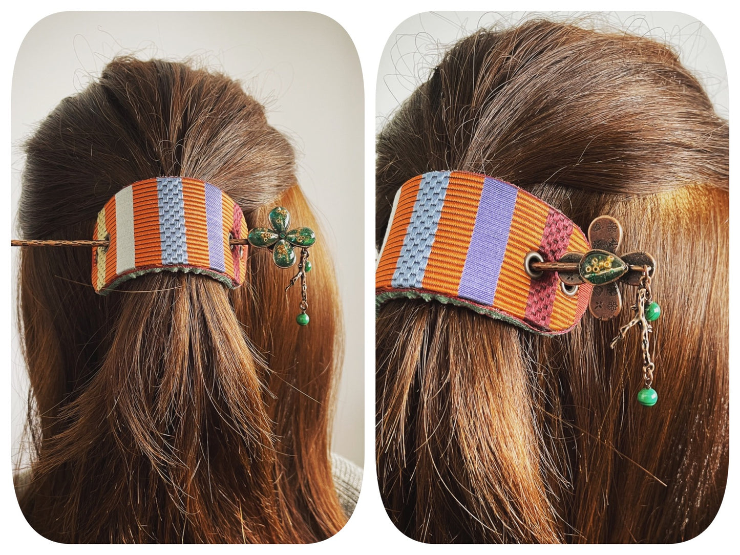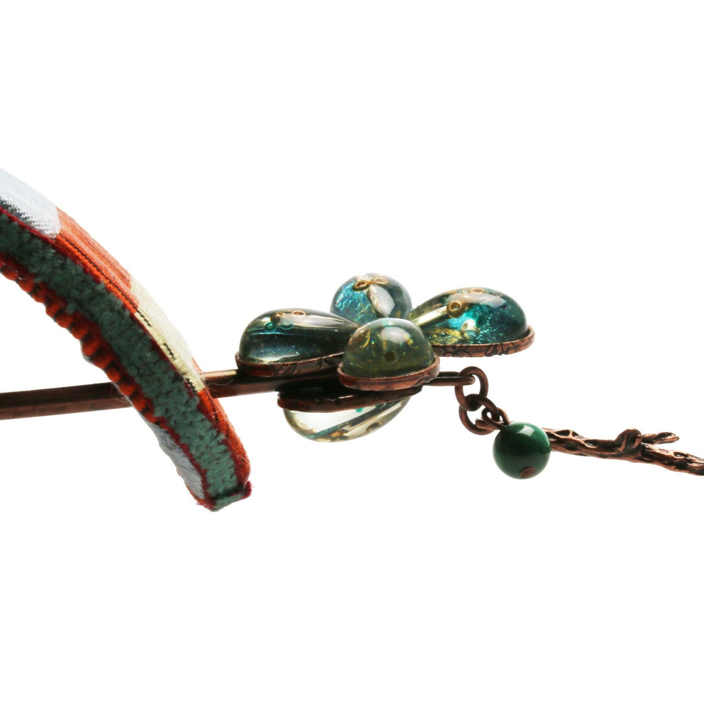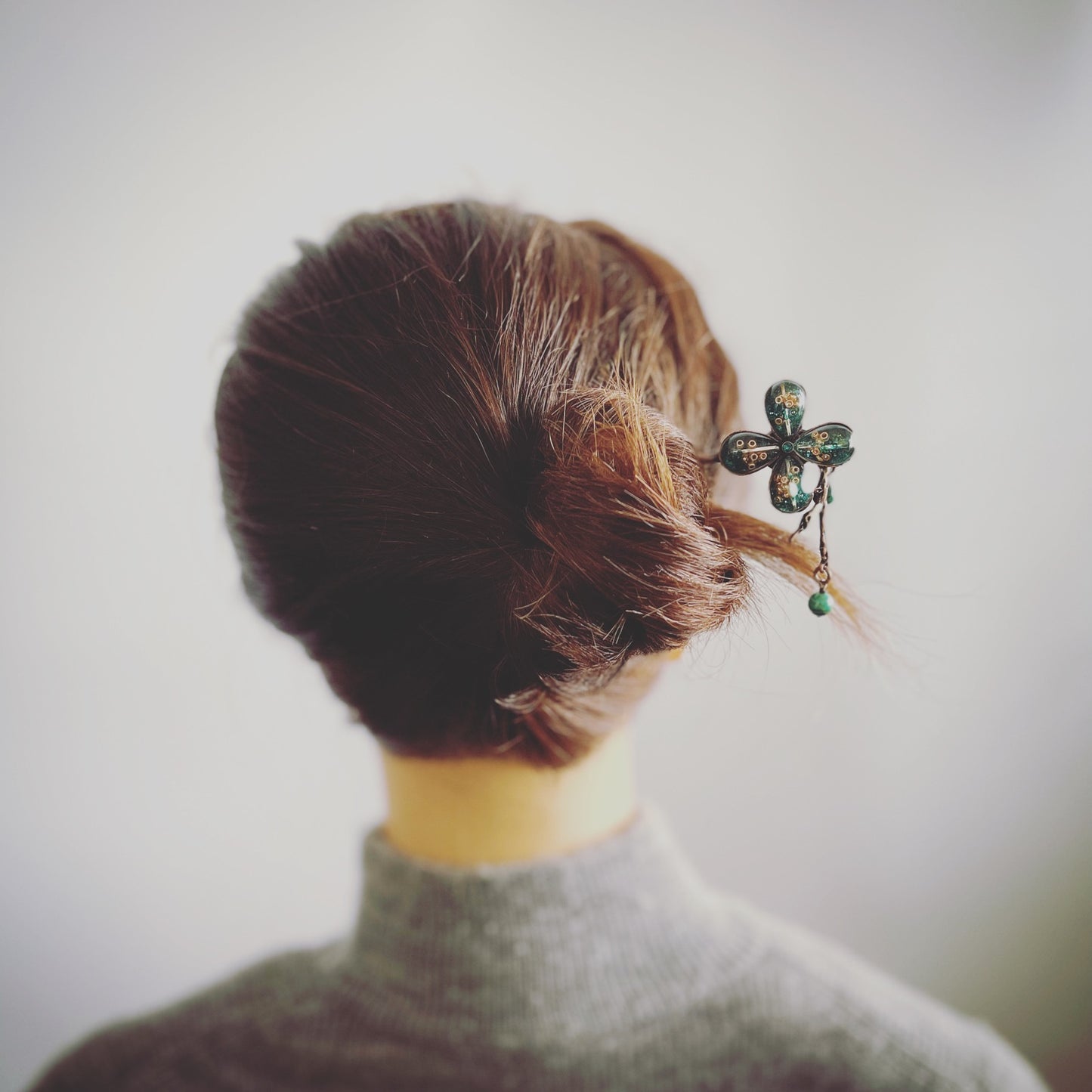 It is a hair pin barrette using resin parts of "Jewel Box Series" (Emerald). It is a hair accessory which combines parts that put silk fabric used for a tie into a felt and honed headgear. You can also use it alone. We were hanging malachite to match the hue of the resin. It is also recommended for hairstyles when wearing kimonos. Because there are four holes in the hole, you can adjust according to the amount of hair to hold.