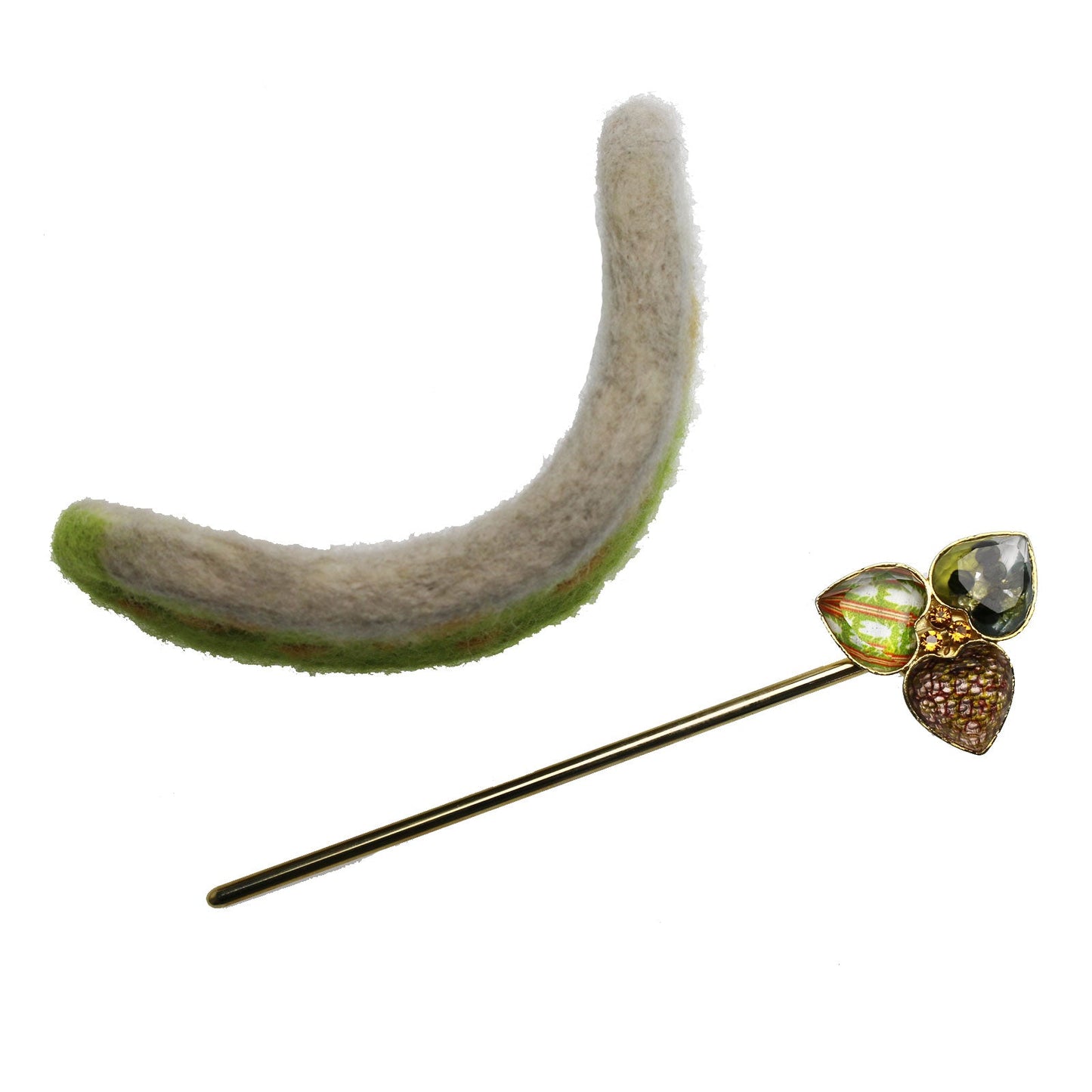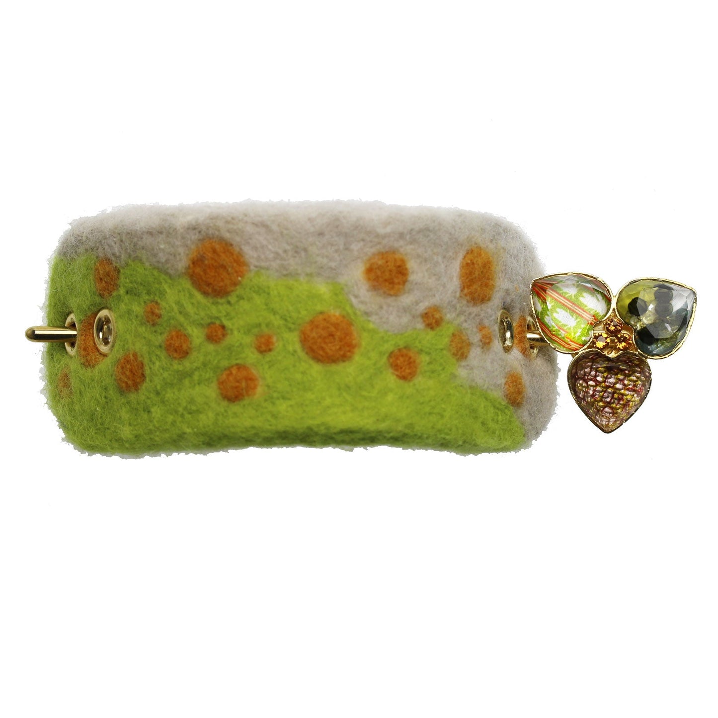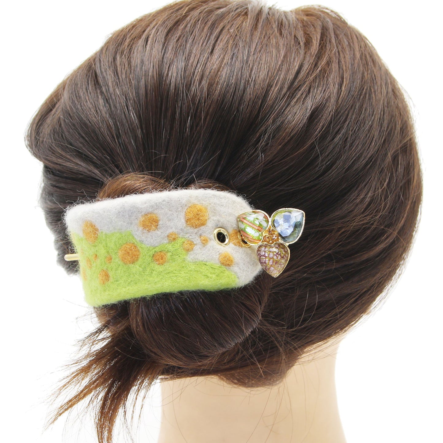 It is a barrette using resin parts of "Water Surface Series" (Pink),"Cocada Series" and "Ramune Series" (Green). Recommended for individualized fashion of the hair combined. Hairpin Barrette in the shape such as barrette, the stick part is 2way type also become hairpin. To use it insert the bar in the hole opened in the felt and fasten the hair. As a part of the stick, you can make your hair in one. Based on the compressed felt, felting was done with raw wool. It is very warm design.