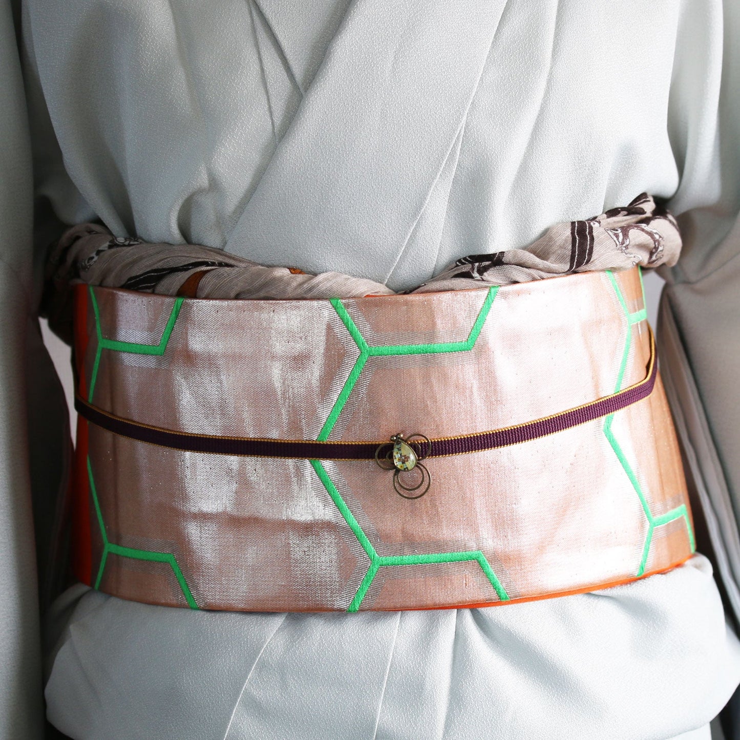 It is an Obidome using resin parts of "Carpet Series(Green)". Half of the green is plaid and unique plastic parts with purple glass beads floating. It is recommended for casual cute accent of the belt. It is a design with movement that seems to be flying to lean a bit if you wear it. It is also cute and round. Recommended for gifts with any age design. *Japanese Kimono accessories "Obidome" refers to an accessory passed through 'Obijime'(a string tied around the waist to fix obi).