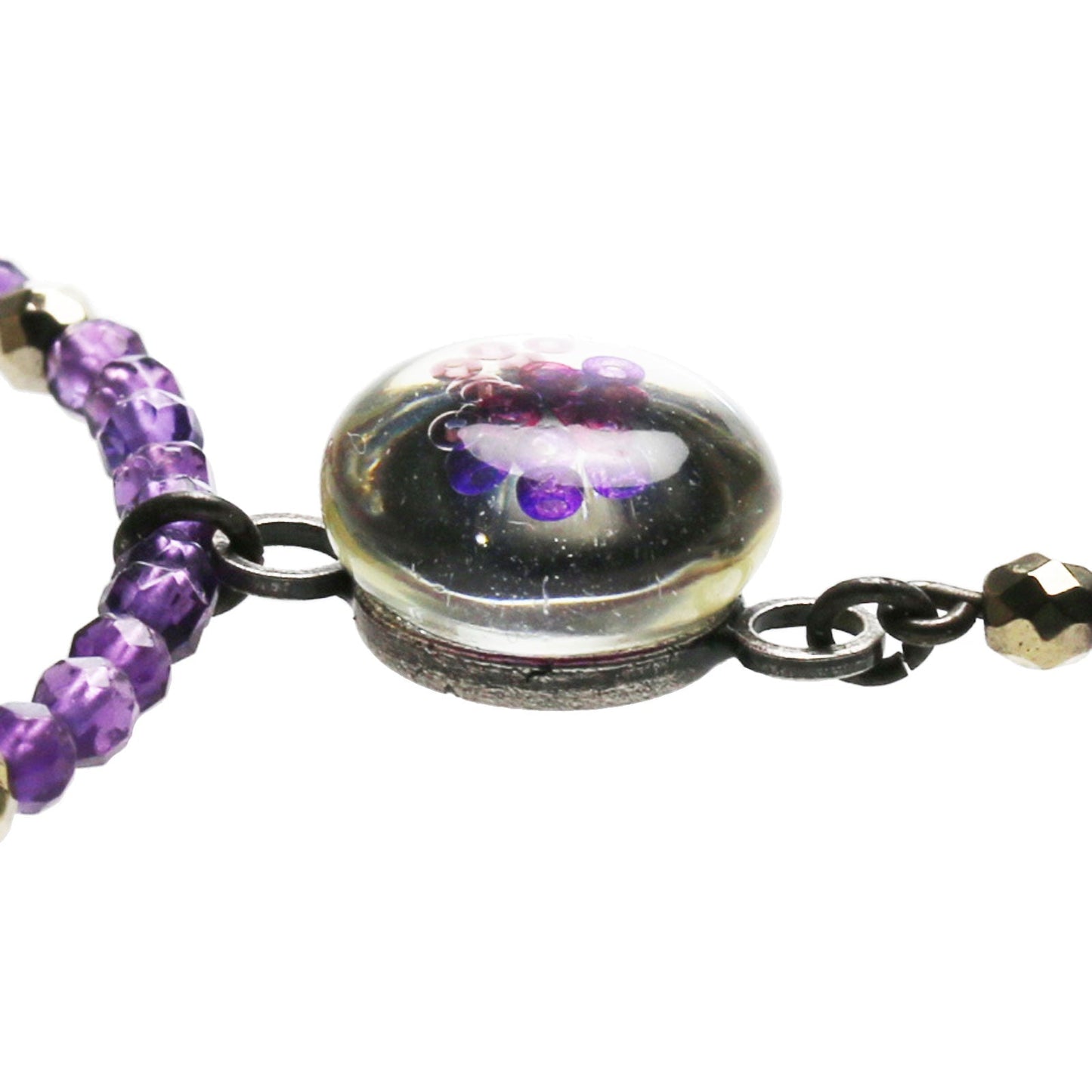 It is an anklet using resin parts of "Plum Cake Series" (Purple). We combined Amethyst according to the color of the resin. The stone in the adjuster is blue lace. Recommended for gorgeous accent of your feet.