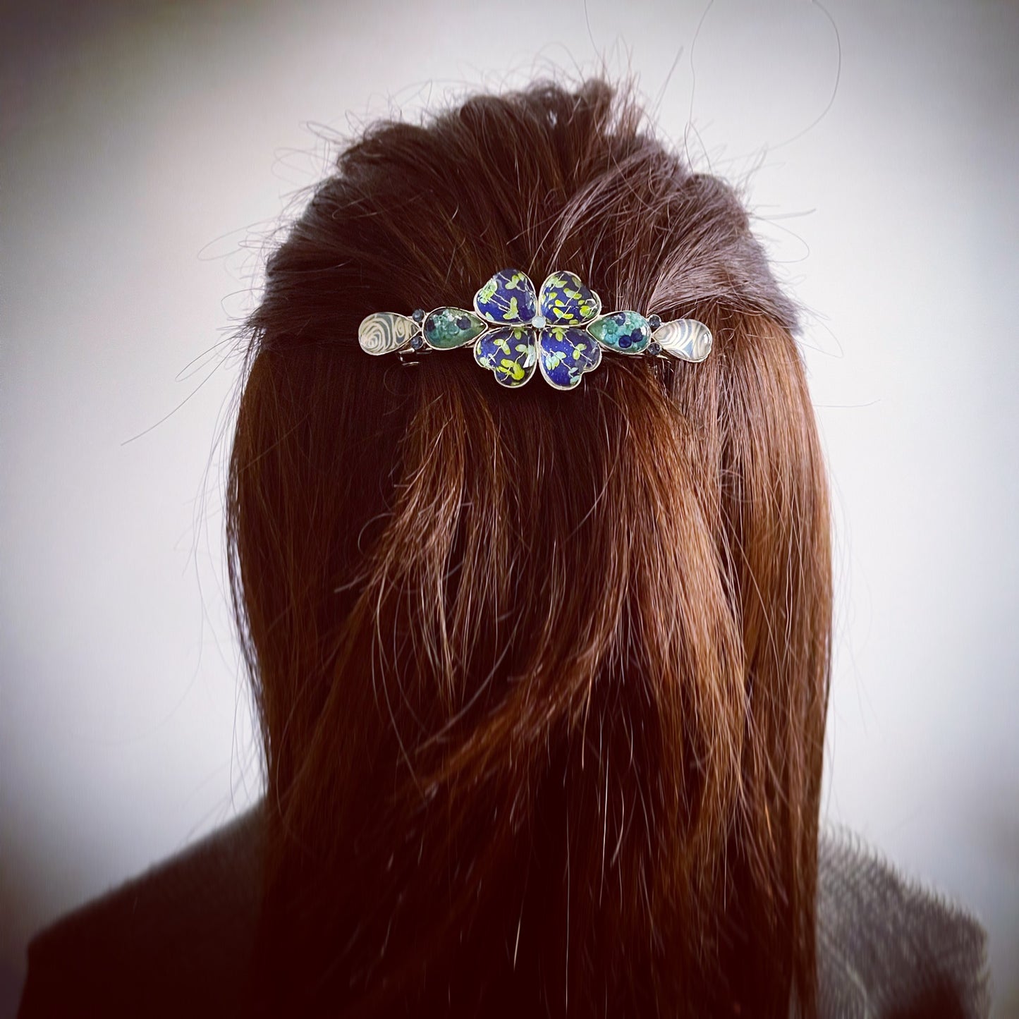 It is a barrette using the resin parts from the "Vine Series" (Blue), "Vortex Series" (Blue), and "Ramune Series" (Blue). It has a flower shape accent and a uniquely cute design with blue gradation, just the size for a half-up hairdo. It is an ideal gift for adults and comes with a flower box.