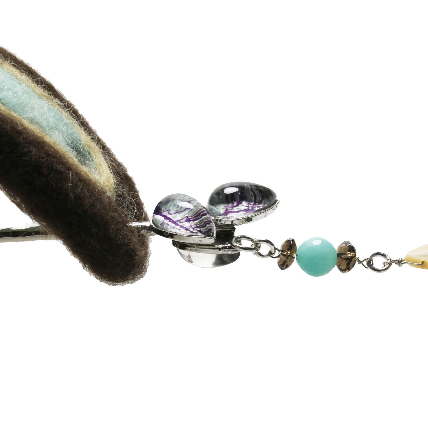 - Wool, Smoky quartz, Amazonite, Mother of pearl