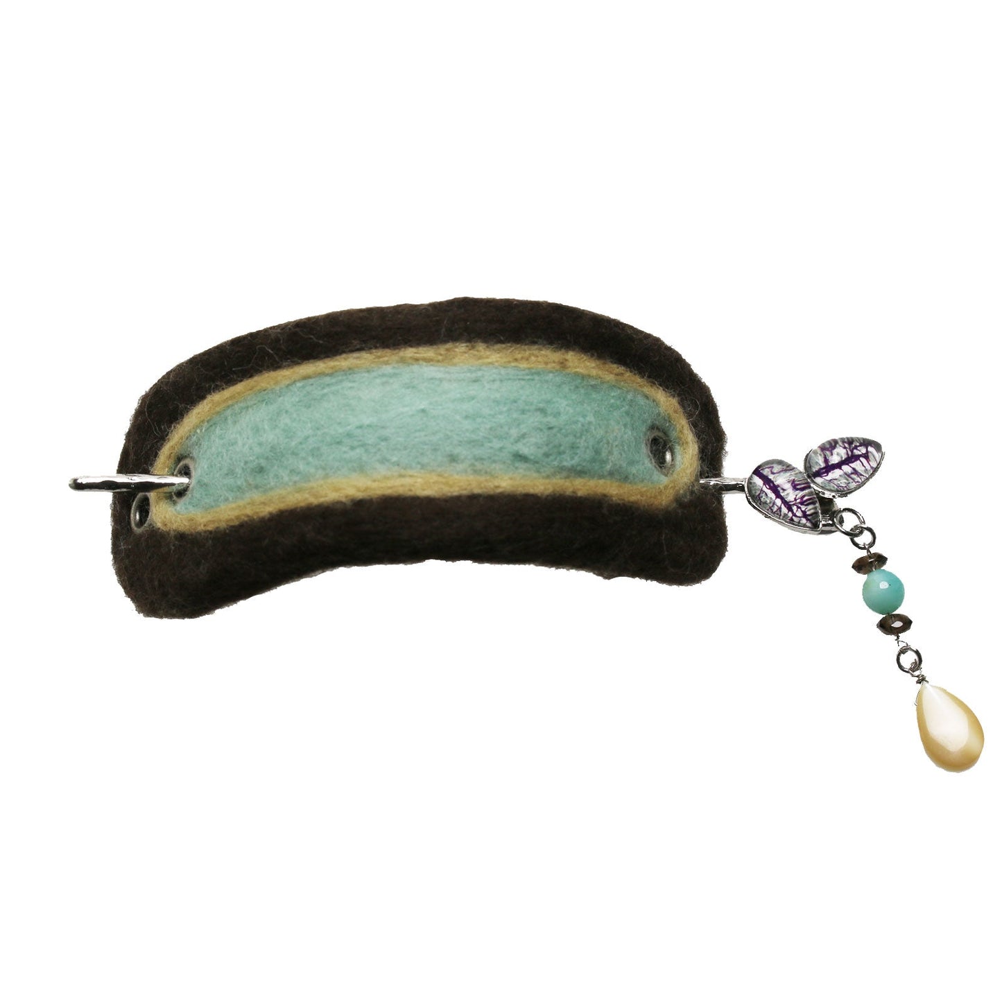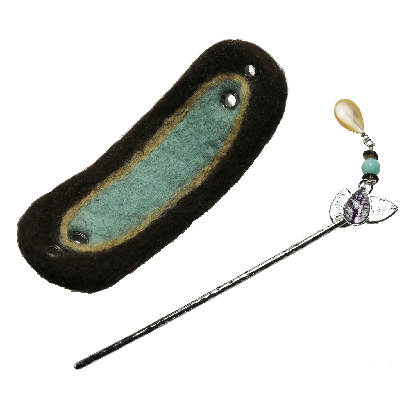 It is a hair stick barrette from the "Forest Series" (Purple) made of resin. It is felted to the compressed felt using a needle with blue, brown, and beige wool. The hair stick has a fashionable design with a hanging mother of pearl, amazonite, and smoky quartz. You can coordinate it with your kimono.
