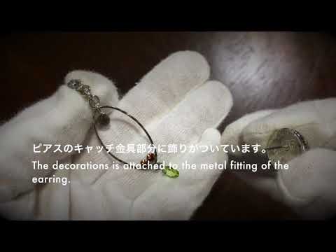 It is a pierced earring made from resin parts of "Vine Series" (White). We hung an elliptical hoop in the catch part. It was a combination of smoky quartz and peridot to match the hue of the resin. The position of the left and right stones is different. Since the decoration is attached to the catch part, it can also be worn simply by replacing it with a catch with nothing attached. Resin parts and metal parts are handmade.