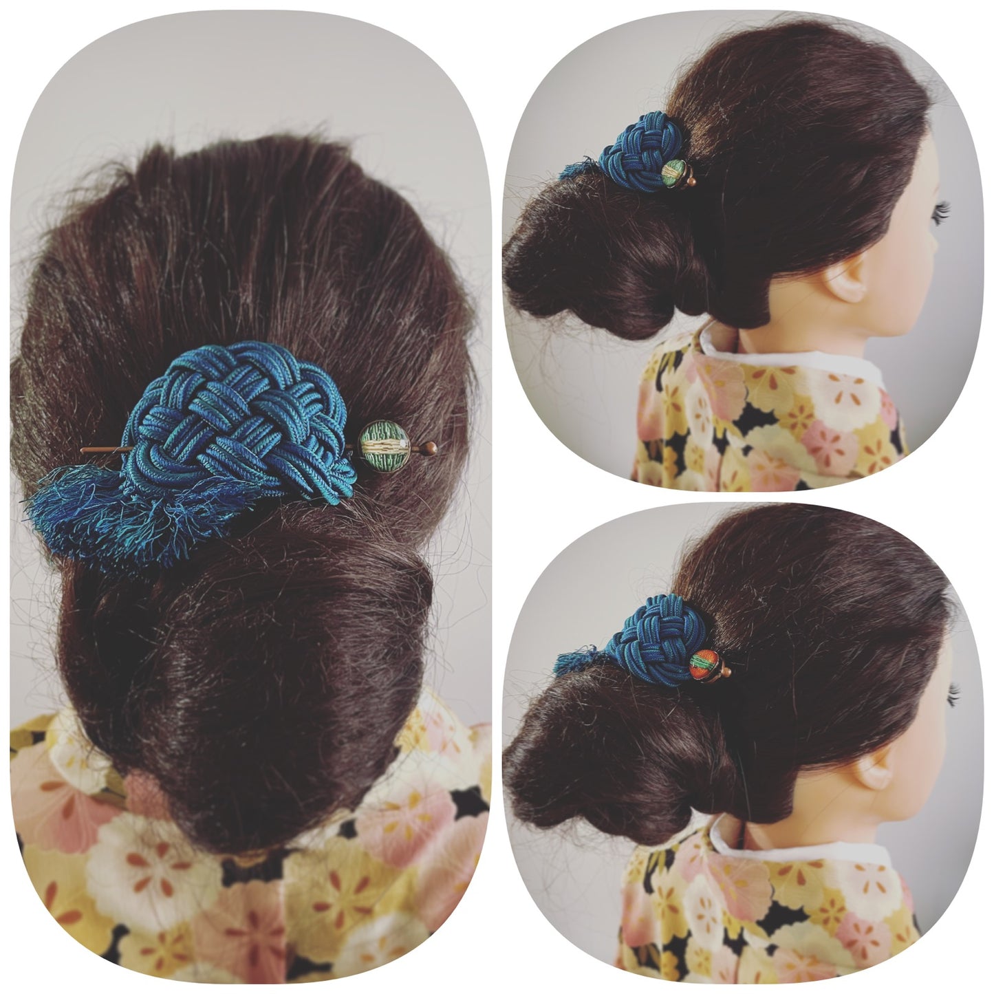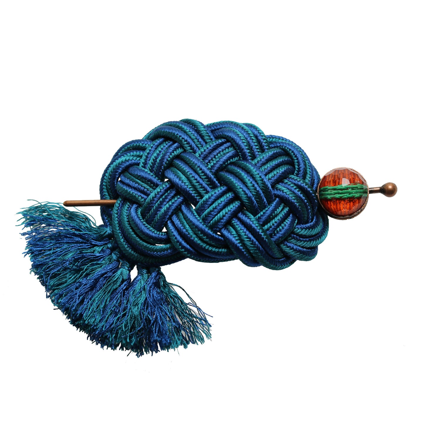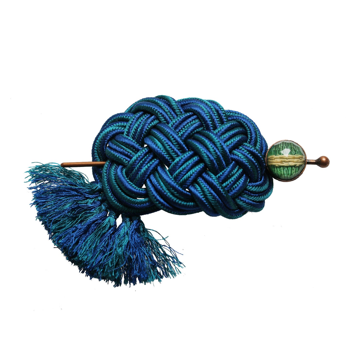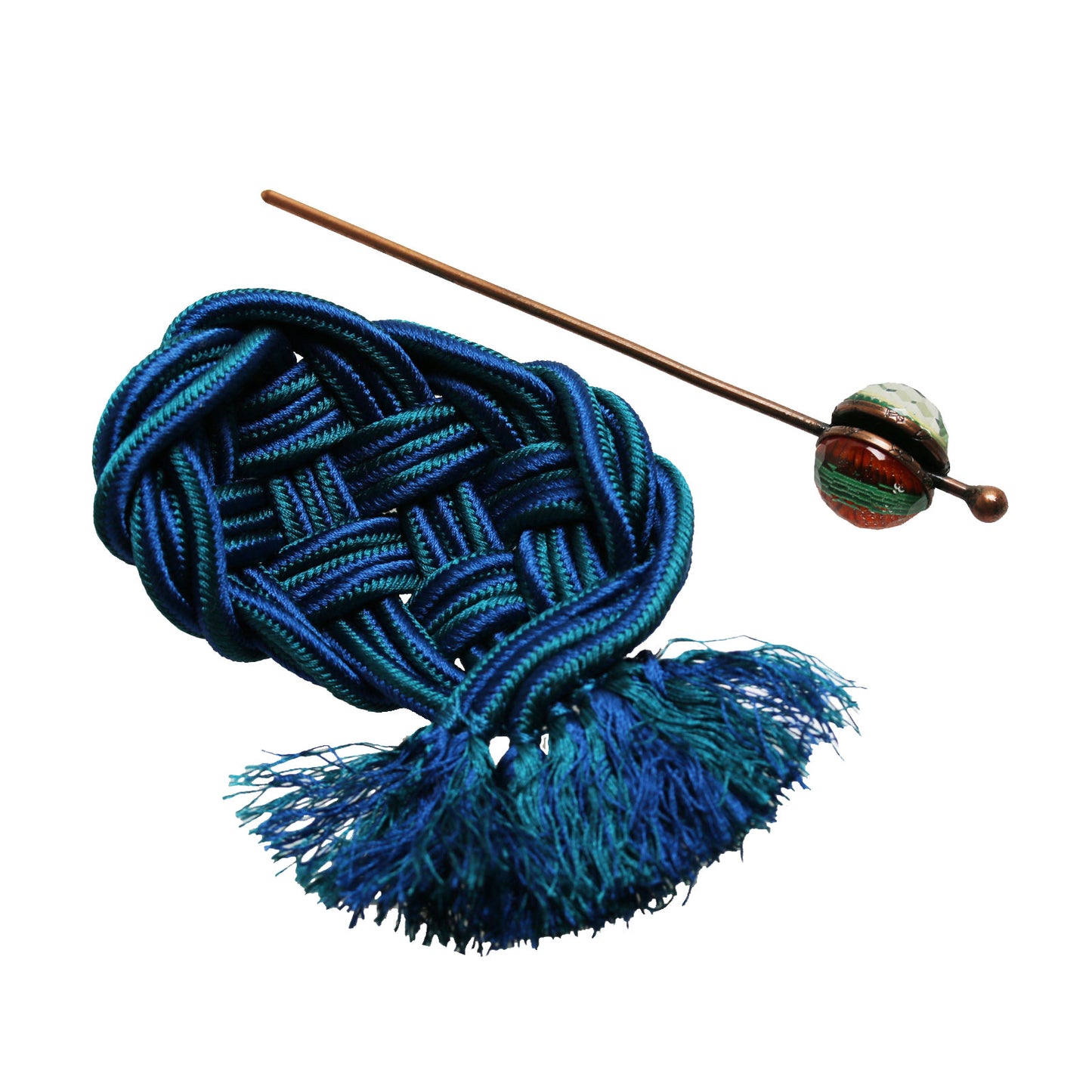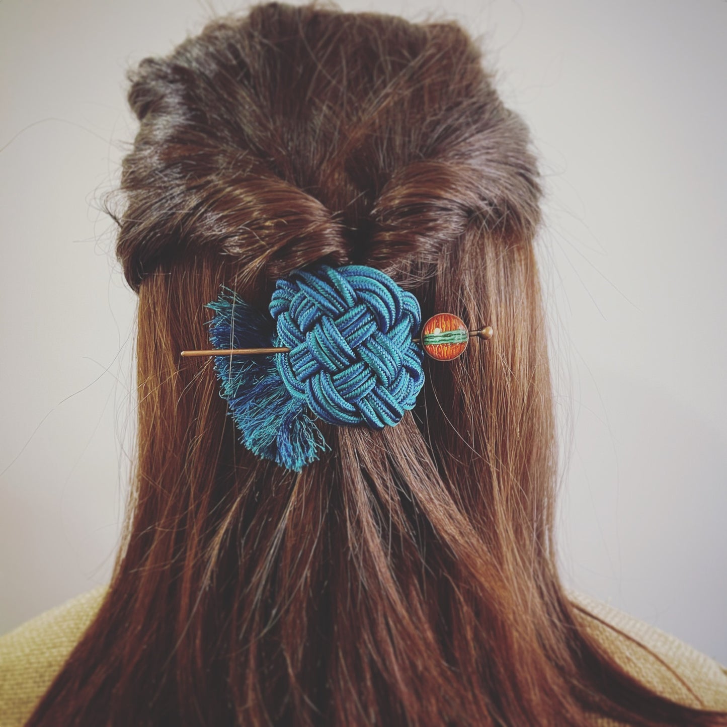 It is a hair stick barrette using two different colors of the resin parts from the "Mizuhiki Series." The silk braid is specially ordered from the Kyoto craftsmen. The gradation of blue and peacock blue is beautiful that has stunning featured fringe design. It goes well, especially with kimonos. It si also ideal gift for loved ones.