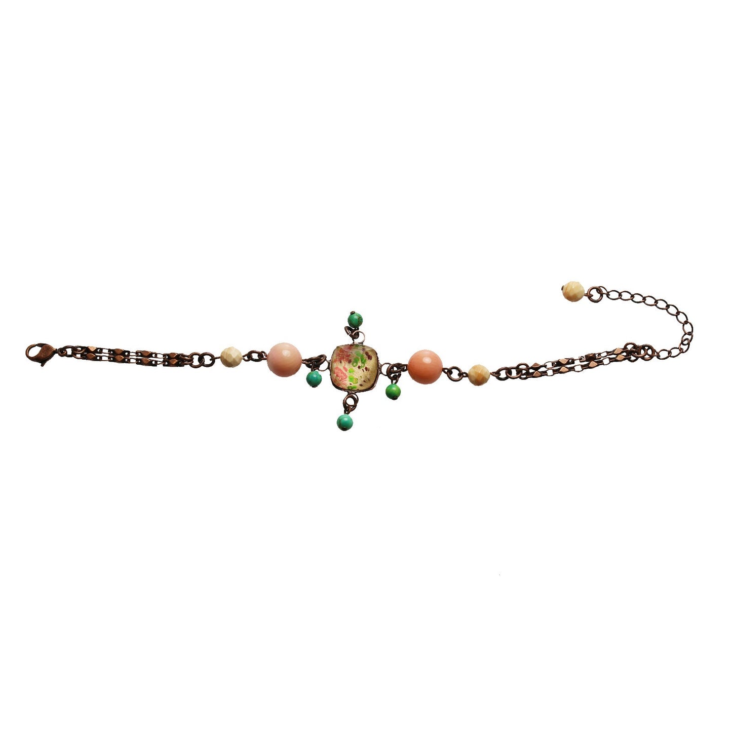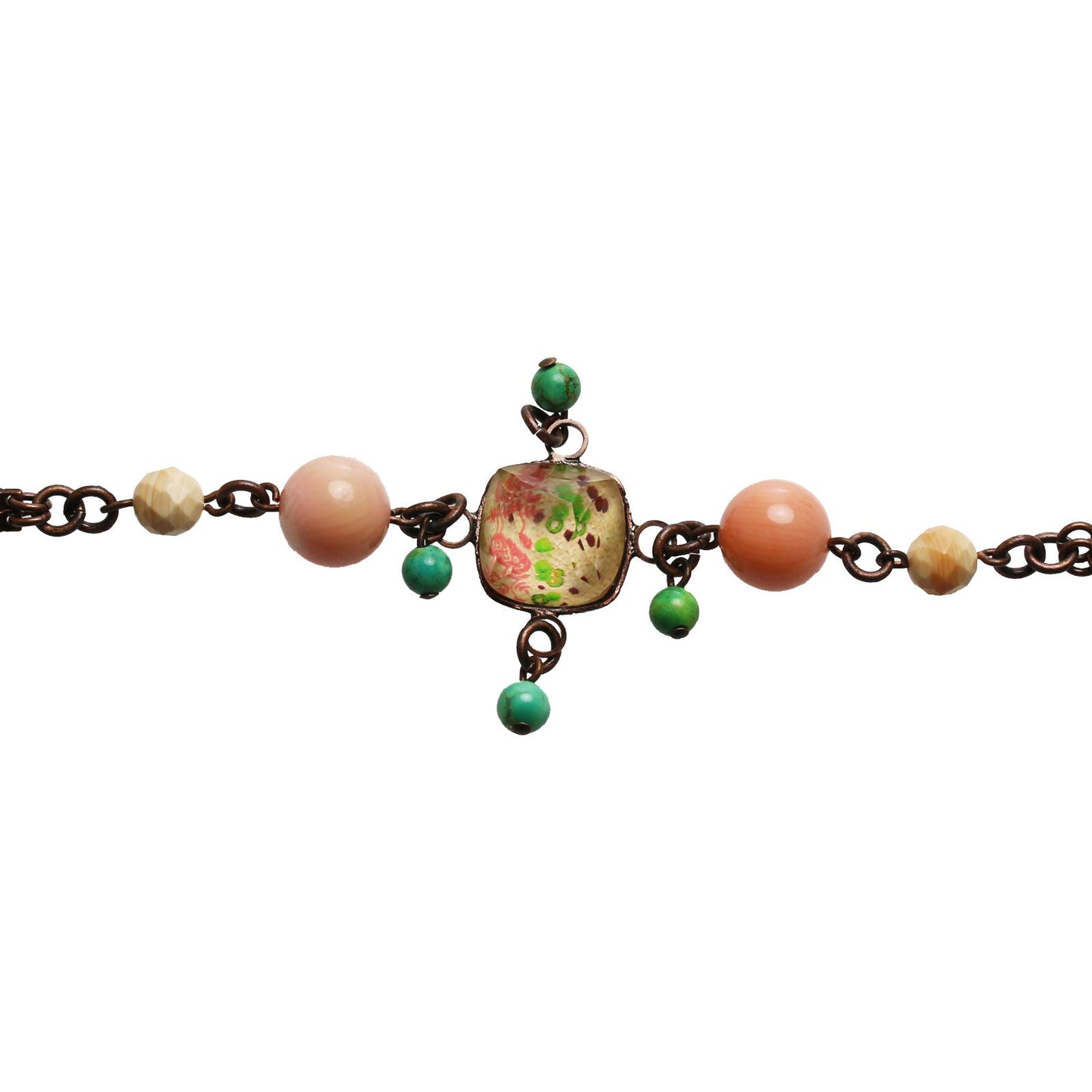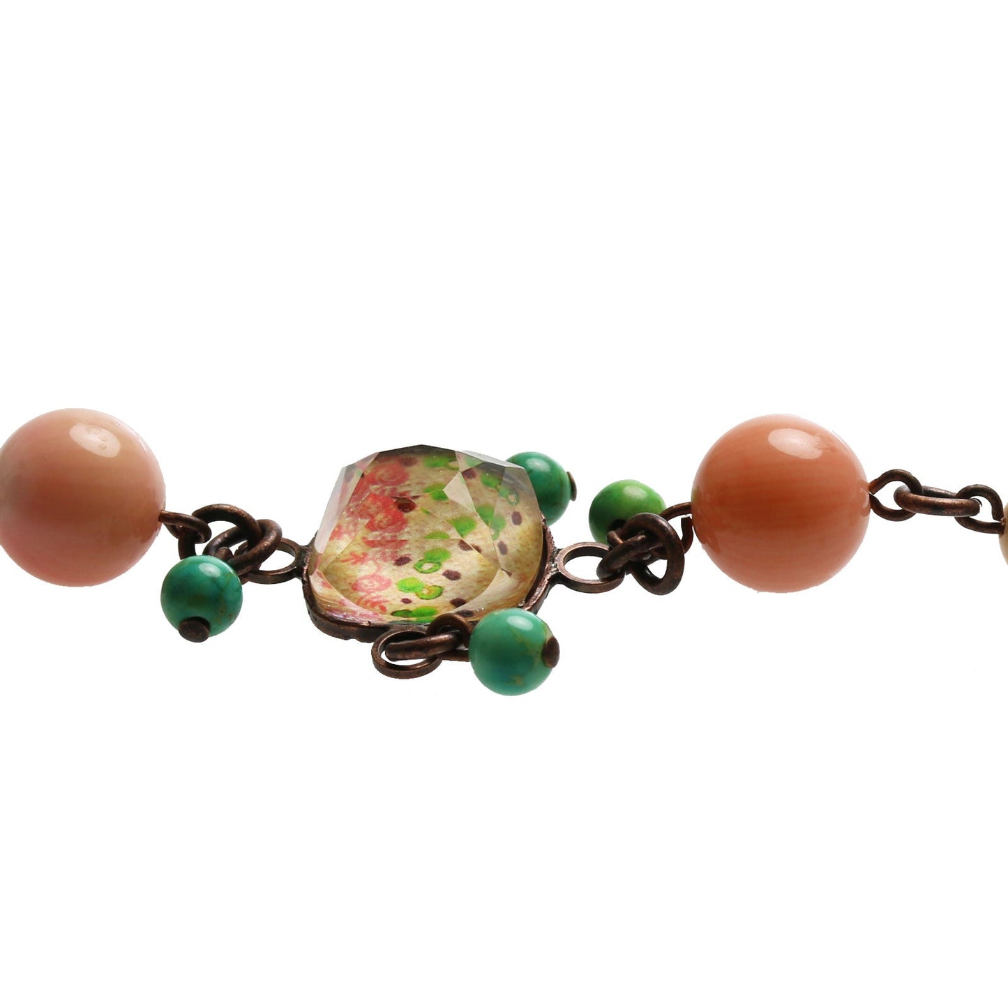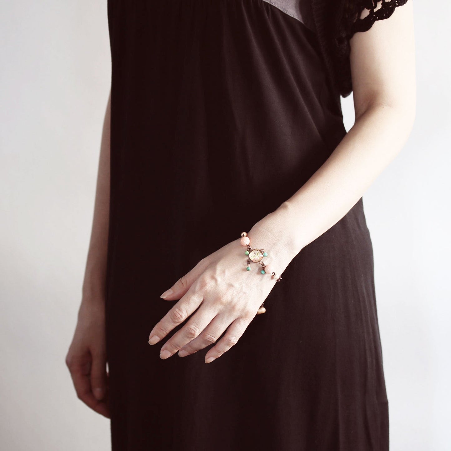 It is a bracelet using resin parts of "Rose Tree Series" (Beige). The combination of salmon pink coral and green turquoise that matches the color of the resin is a cute fashionable design. To the accent of casually gorgeous hand at an exquisite size too small not too small decoration part. It is also recommended for those who are looking for somewhat unlikely things.