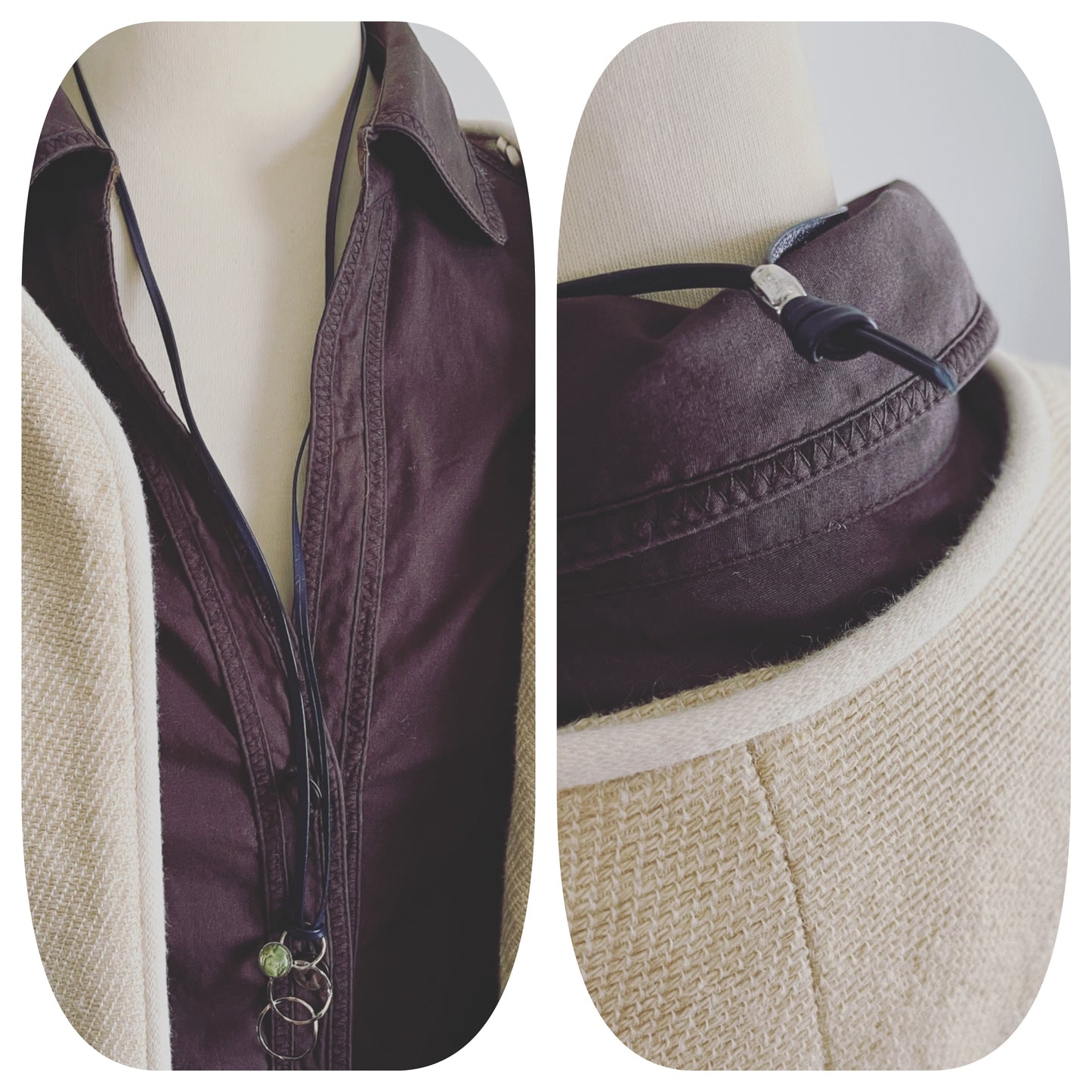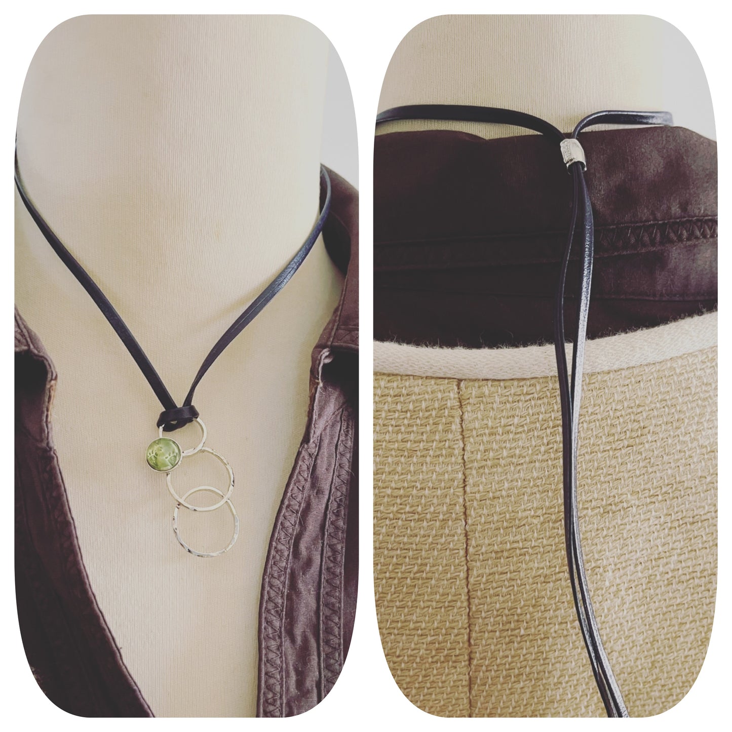 It is a leather eyeglass holder from "Glaze Series" (Blue) made of resin-shaped apollo. The unique pointy cut and its transparency are attractive. It is a combination of big and small rings. You can hook your eyeglasses or sunglasses into its ring. The metal part behind the leather can slide up down, so the length can be adjusted. It is a 2-way type eyeglass holder that you can also wear as an ordinary necklace. It is recommended as a gift. It is designed for both men and women. It corresponds to the width of temple (arm part of glasses) 1.5 cm or less.