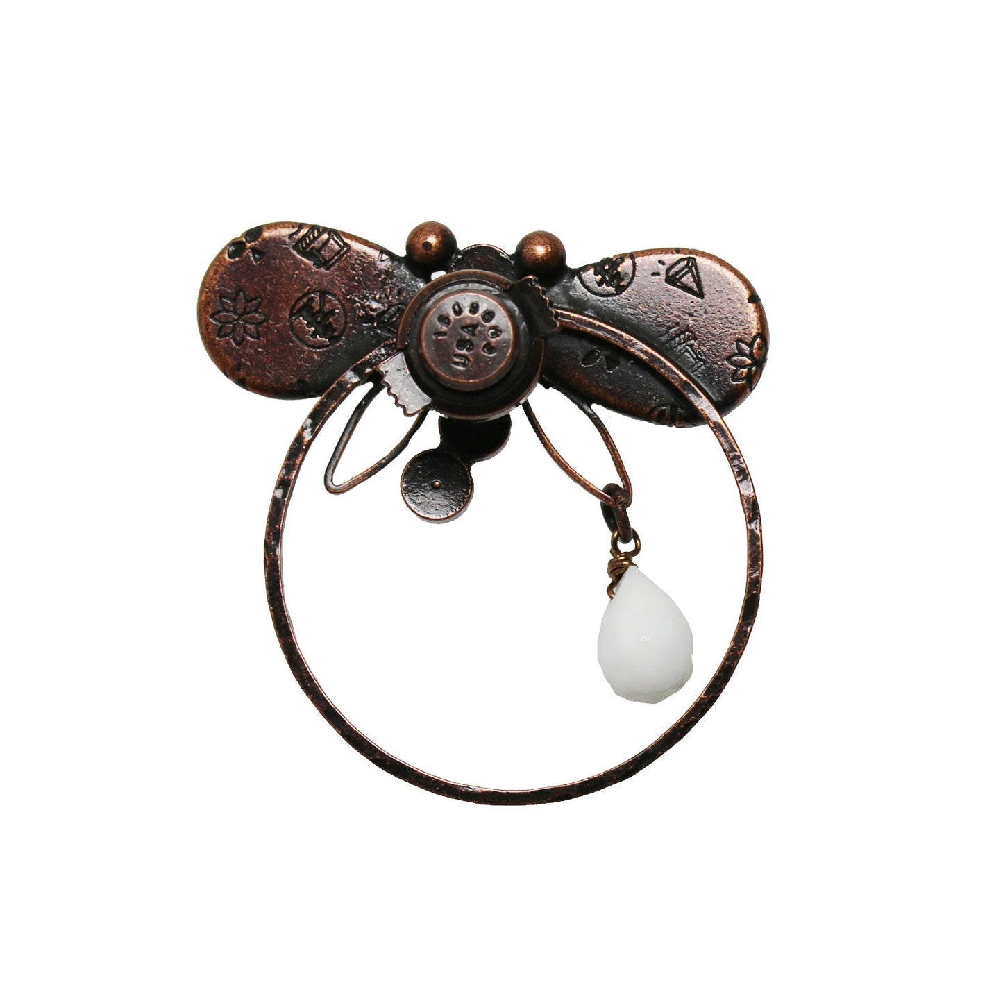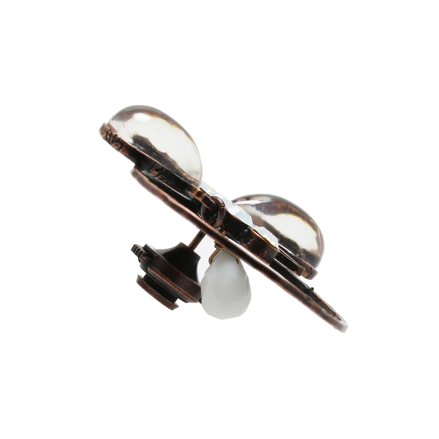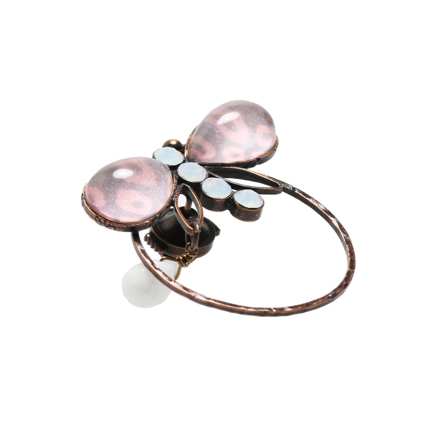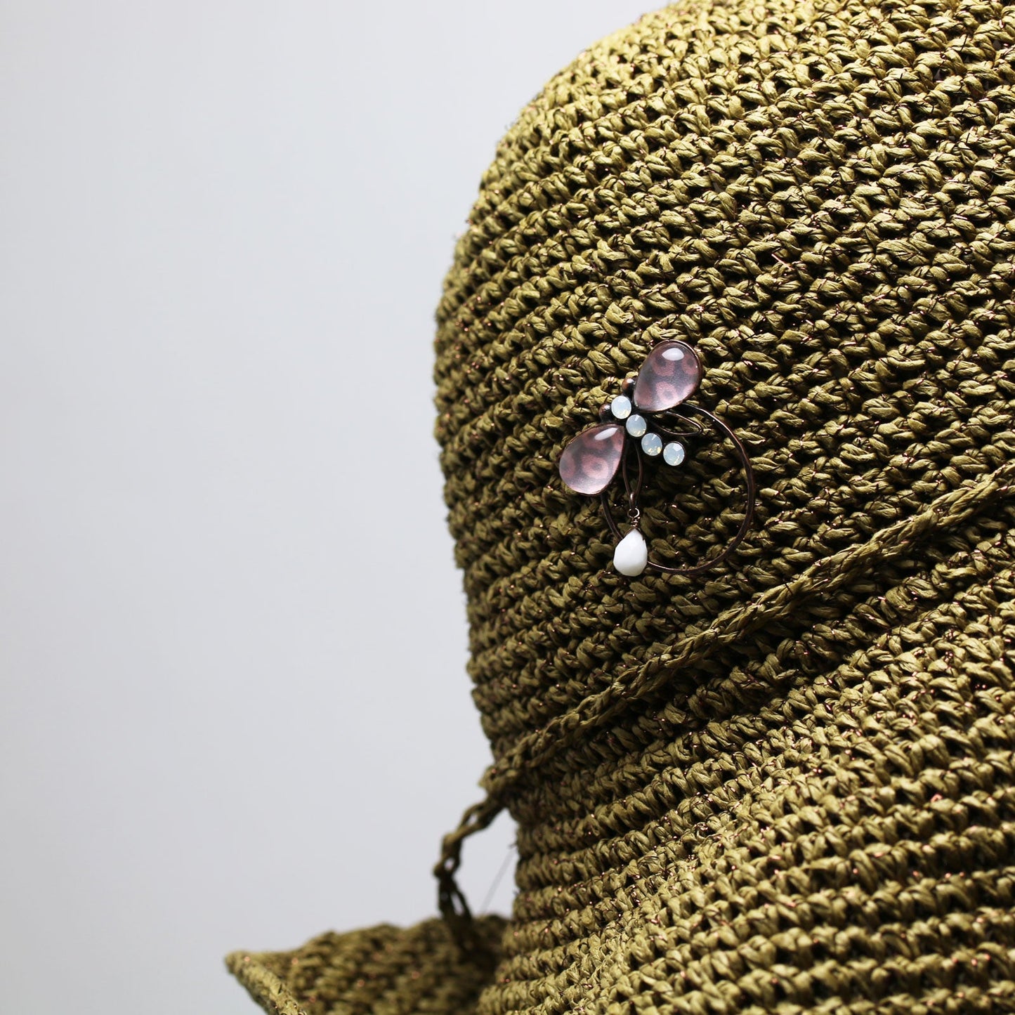 It is a eyeglass holder pin brooch from "Fawn Series" (Pink) made from resin. The shape of a dragonfly is a unique design. You can use it as a glasses holder hanging on the ring part. The hanging white onyx serves an accent. You can also use it as an ordinary brooch. The width of the glasses temple is up to 2.7cm.