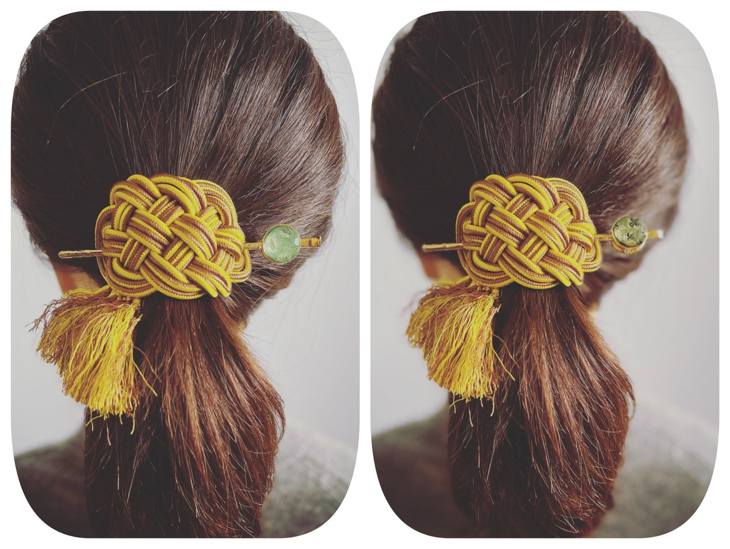It is a barrette using the resin parts from the "Graze Series" (Blue). and "Graze Series" (Green). The silk braid with yellow and brown thread is specially ordered from Kyoto craftsmen. The elegant luster of silk is perfect for a great hairstyle. Try it because it goes well with kimono. The hairpin part can also be used separately.