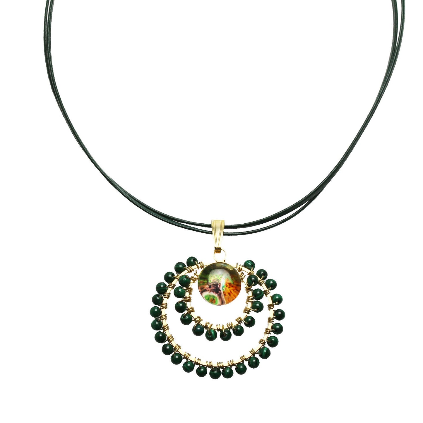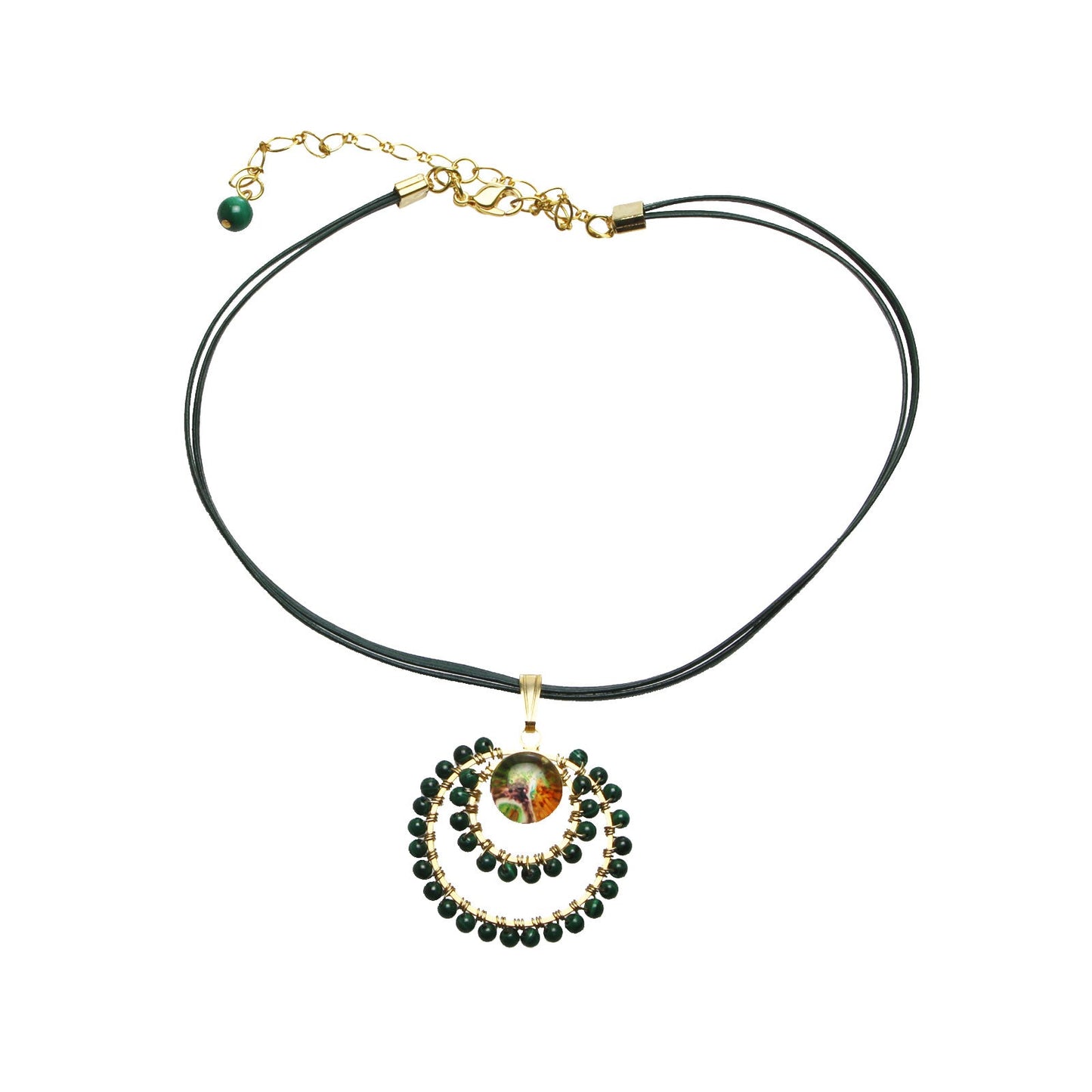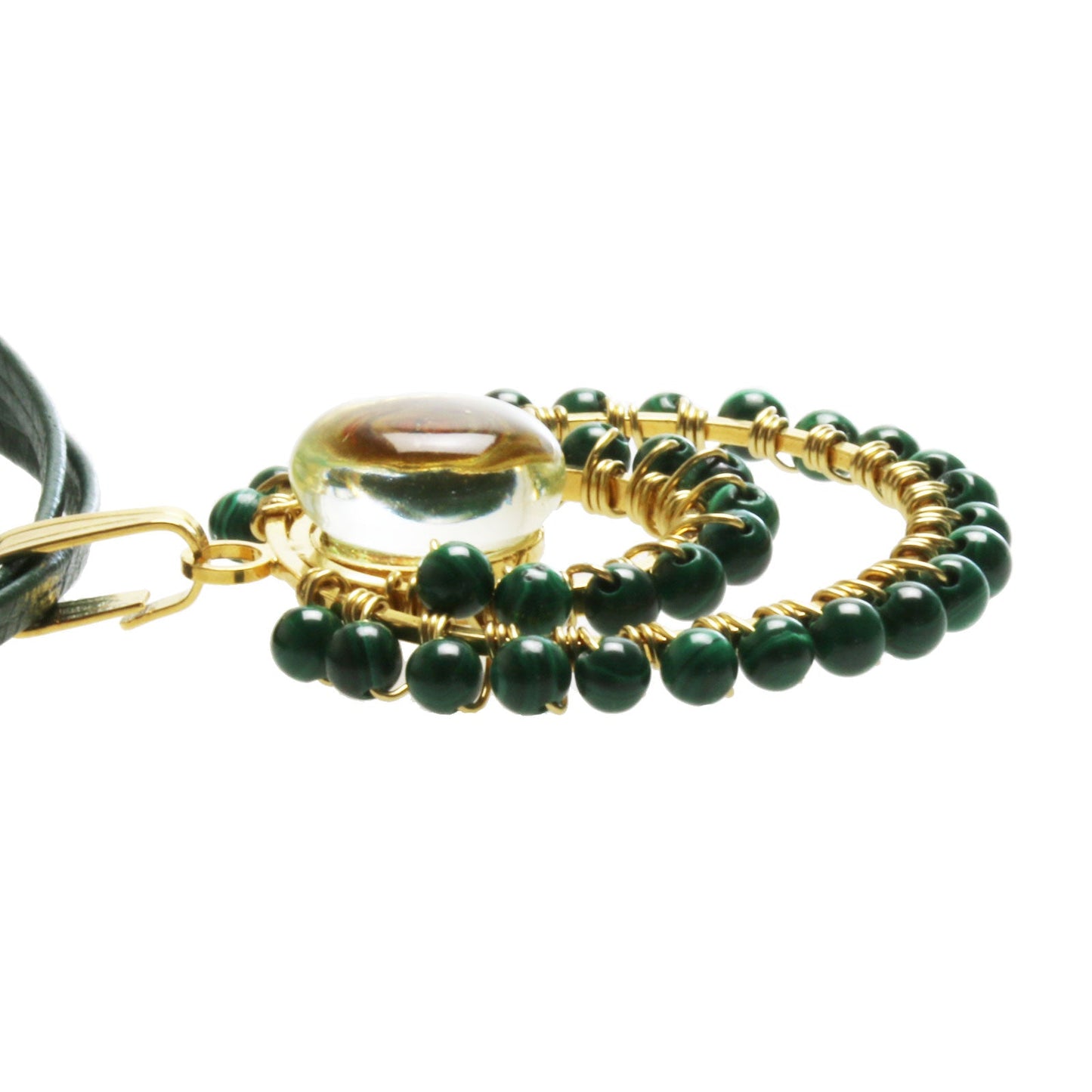 It is a choker combined with resin parts of the "Pansy Series" (Green) and parts and leather straps knitted with malachite around it. Recommended for gorgeous accent of the chest with unique shades.