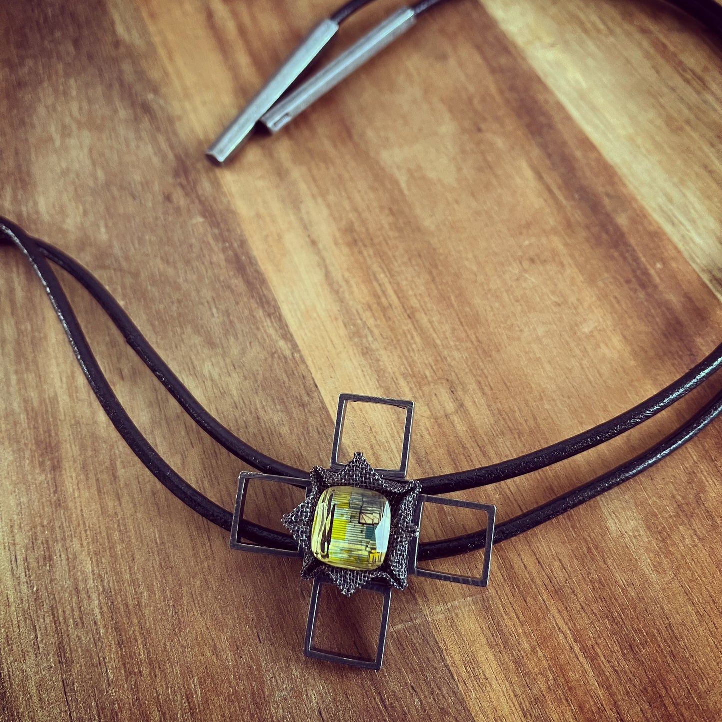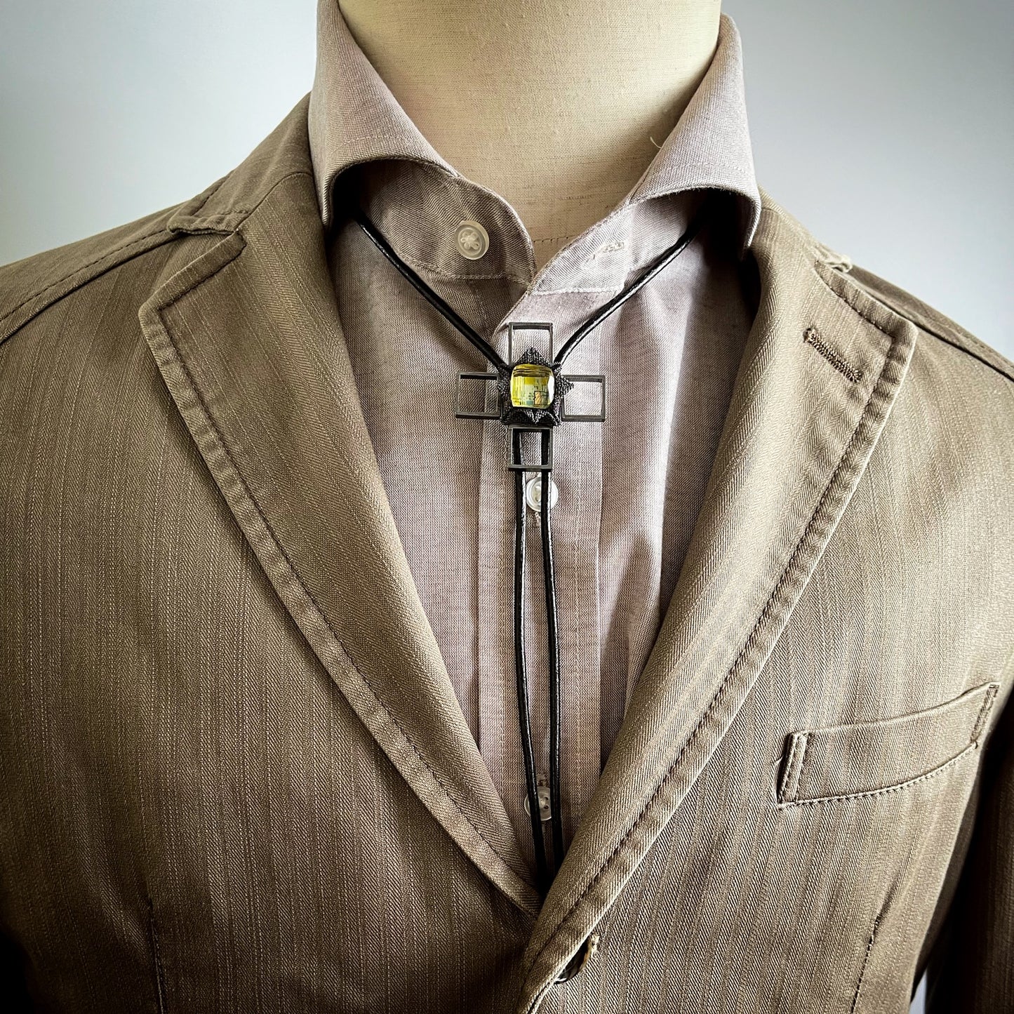 It is a leather strap bolo tie using square resin parts of "Architecture Series" (Blue). It is a unique design wrapped in plastic parts with mesh parts. Pleasing to casual attire accents.