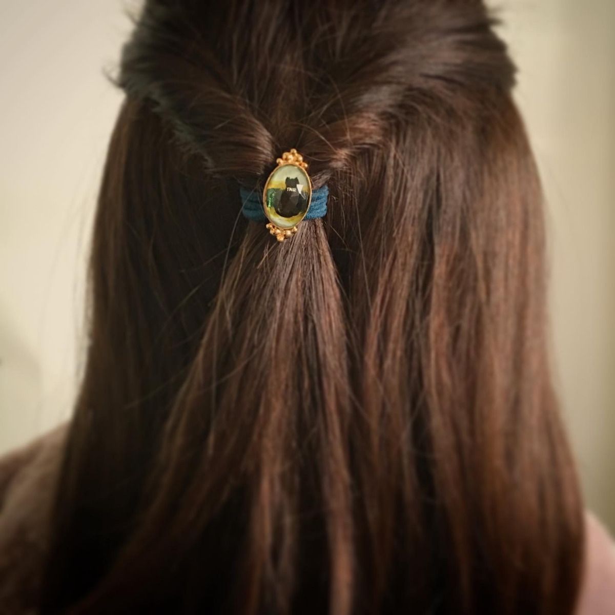 It is a simple hair elastic with a TNR cat design inside the resin. It is small but because the metal part is golden color it shines on your hair. It is recommended for casual hair accents. About TNR (Trap Neuter Return): It is the only humane and effective approach for community cat management. We encourage everyone to support.