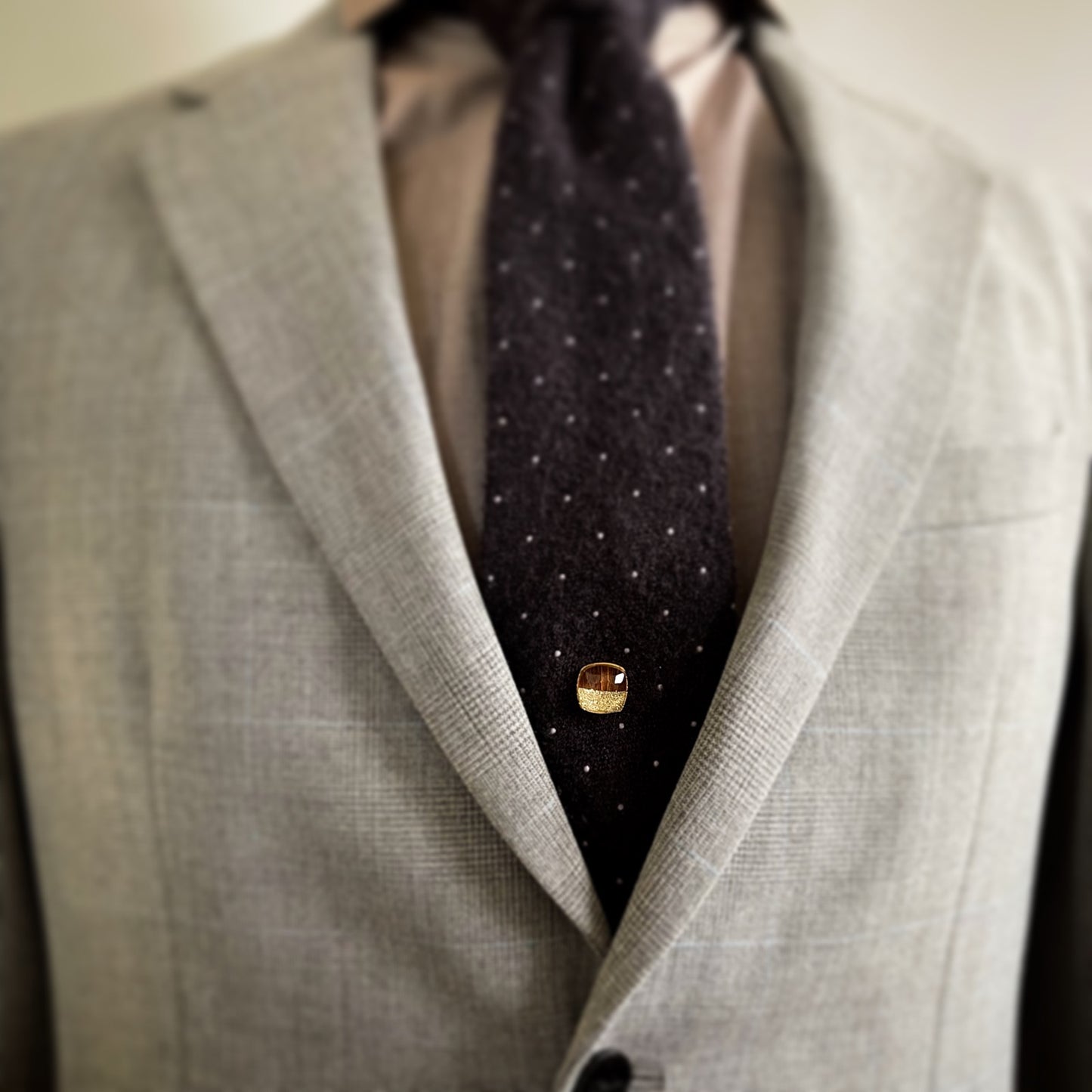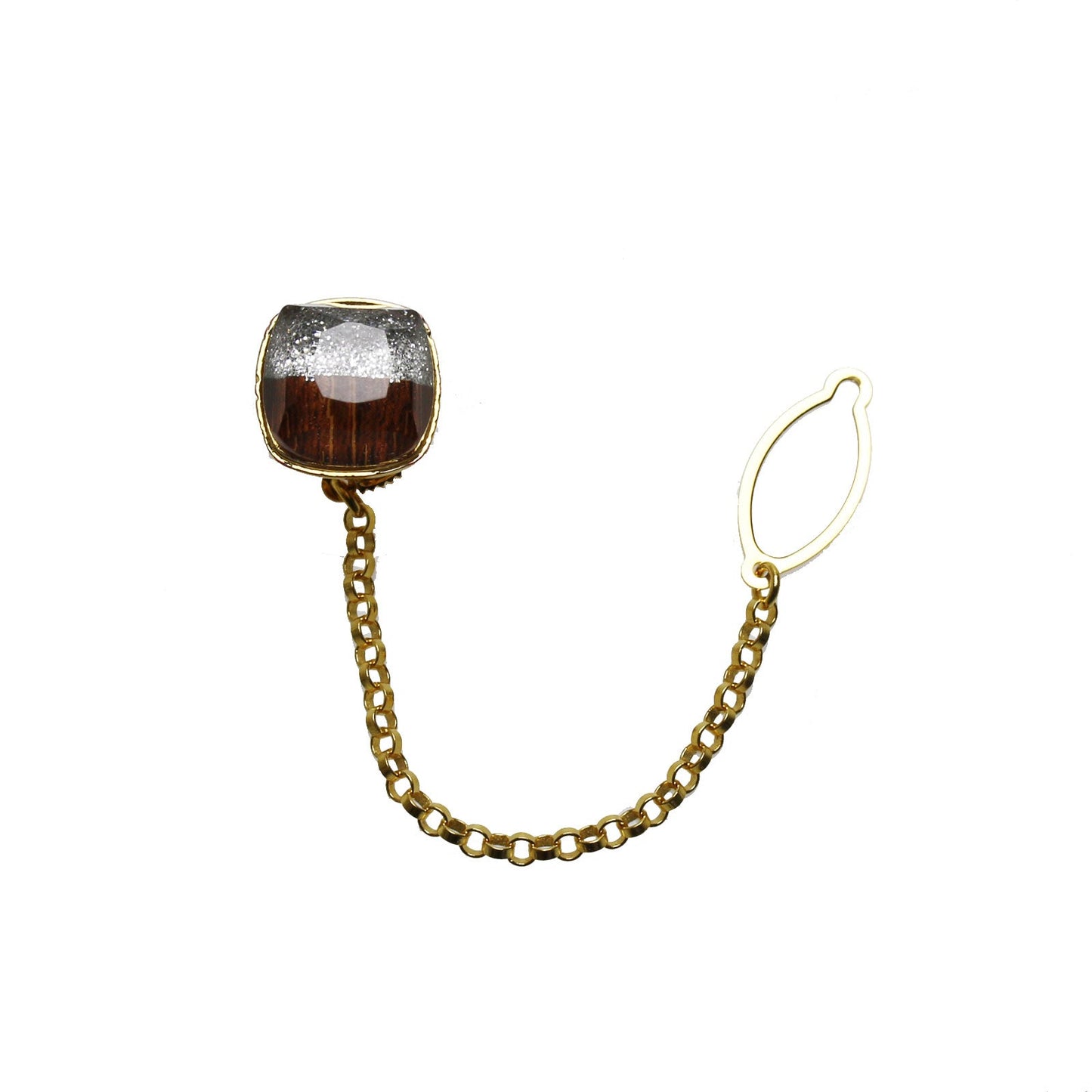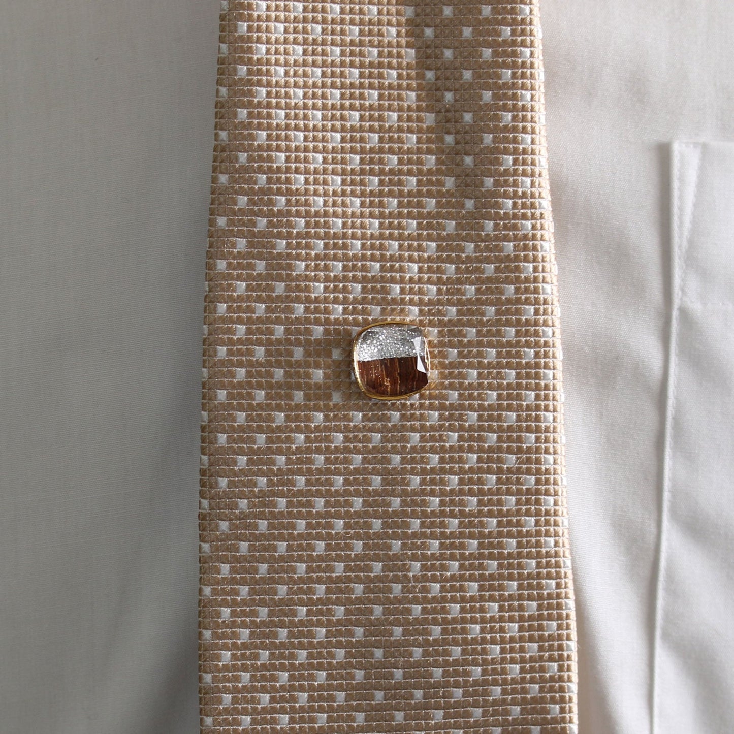 It is a tie tack using resin parts of "Wood & Lame Series". Unique patterns of wood grain and silver lame will pull the eye. It is recommended for one point accent of necktie.