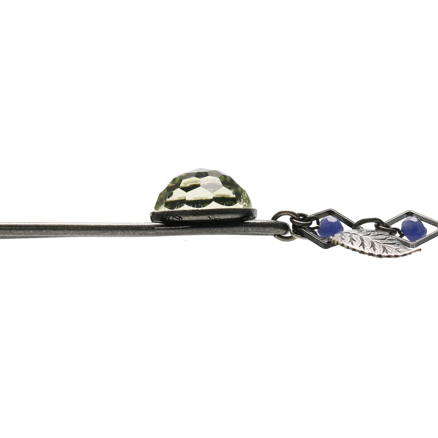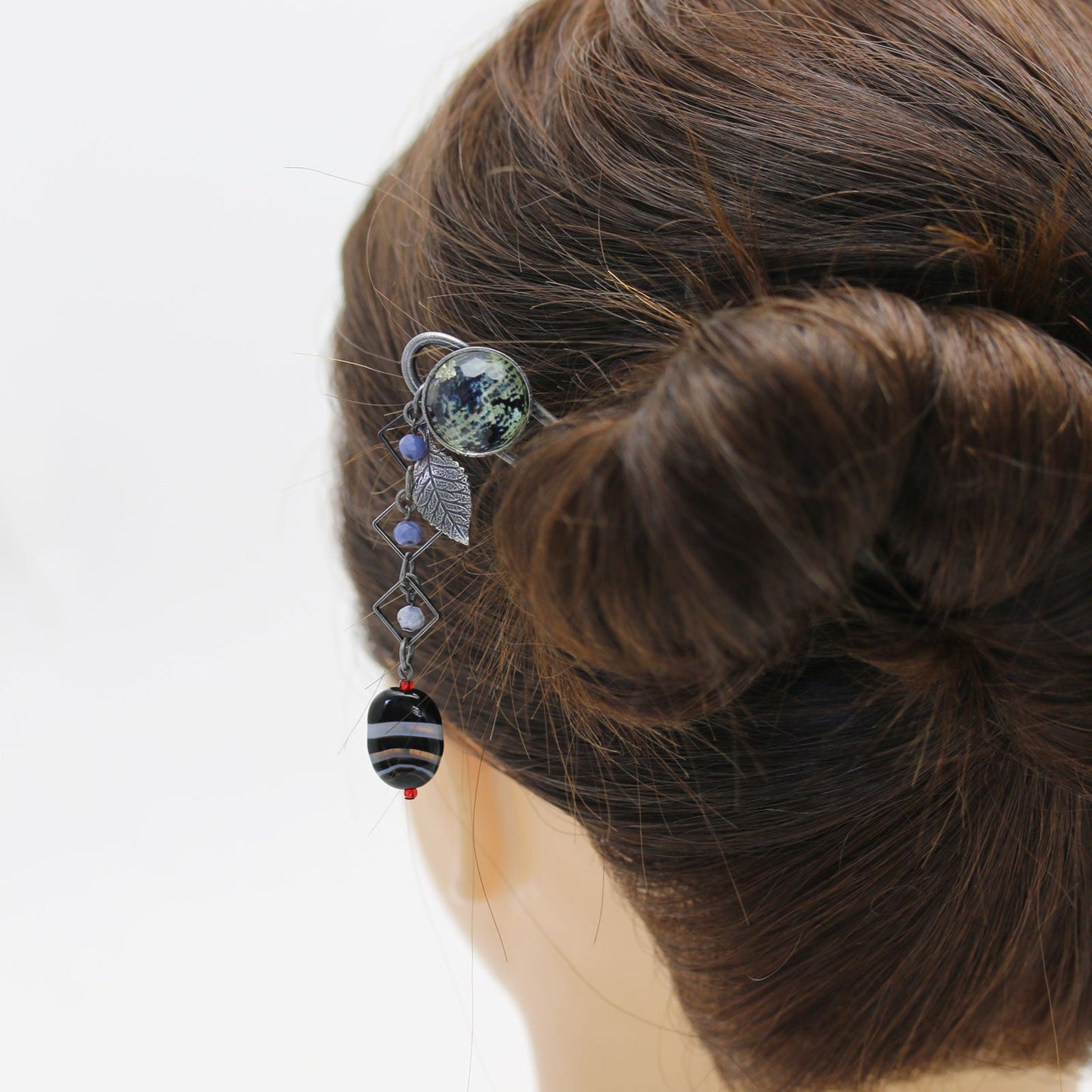 It is a double prong hair stick combining round resin parts of "Dinosaur Series" (Navy Blue) with Tibetan agate and sodalite. It is easy to wear in a chic hue.