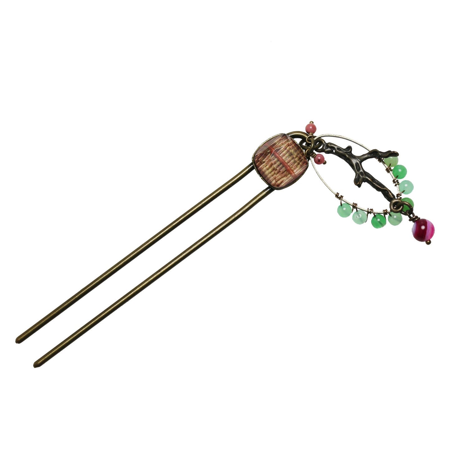 It is a two-prong short pink hair stick from the "Mizuhiki Series" made of resin. It is wrapped with chrysoprase around an oval ring and arranged rhodonite, agate, and a shape of coral motif. You can put it on your hair either as bun style or as half-up style. It goes well with daily use as well as on formal occasions, for example, wearing a kimono. Because it is chic, it is so easy to coordinate. It is a classy hair accessory best for adults.