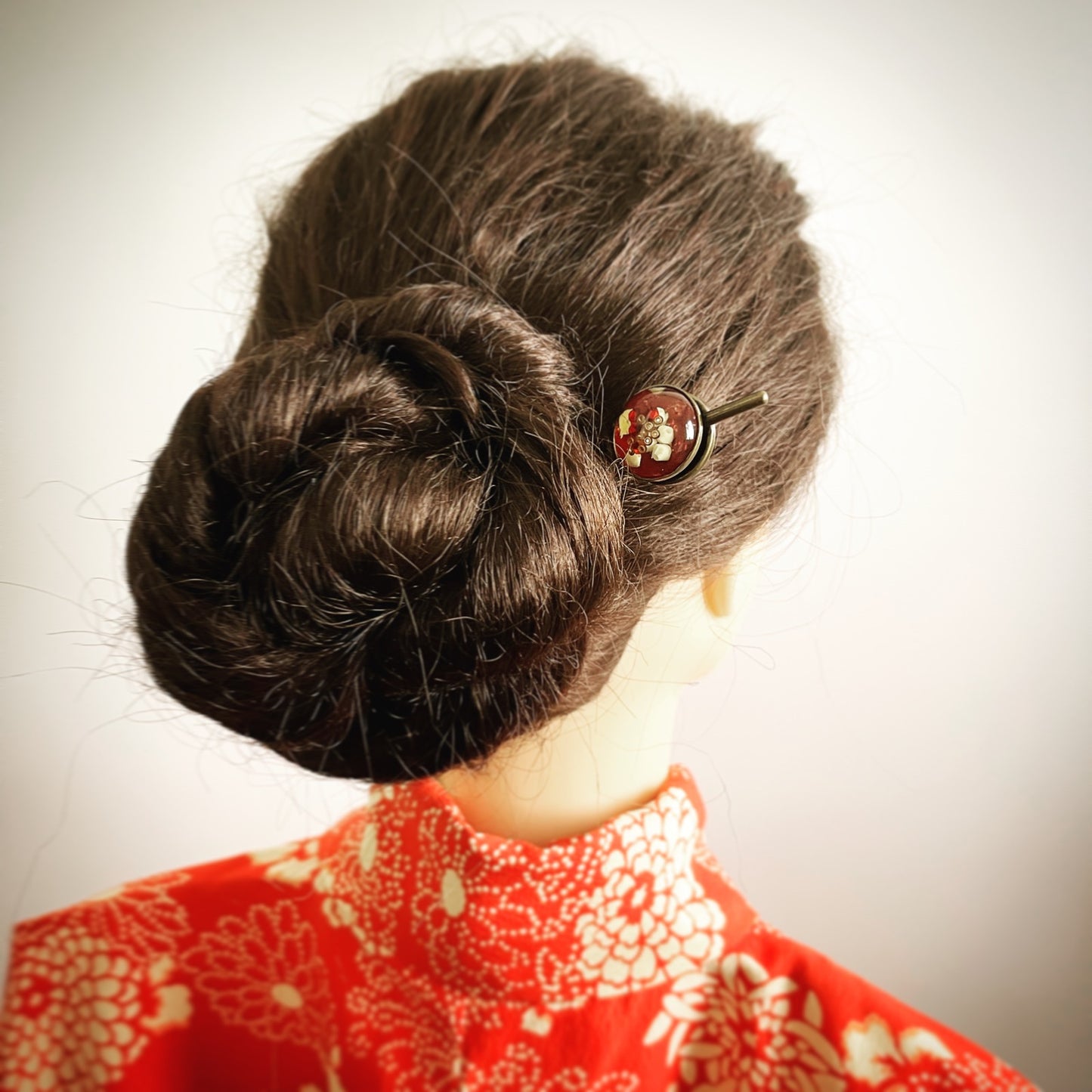 It is a short hair stick using the resin parts from the "New Candy Series" (Red) with a round shape. Because it has a double-side type, it looks beautiful from any angle. The chic and subdued red color completes the daily use hairstyle.