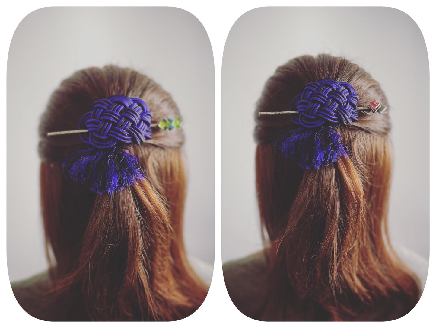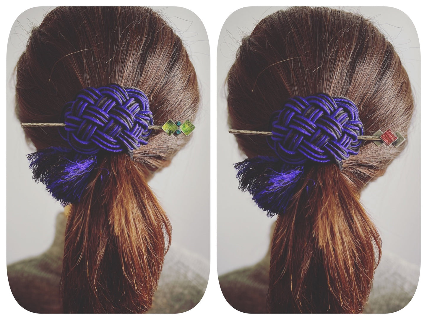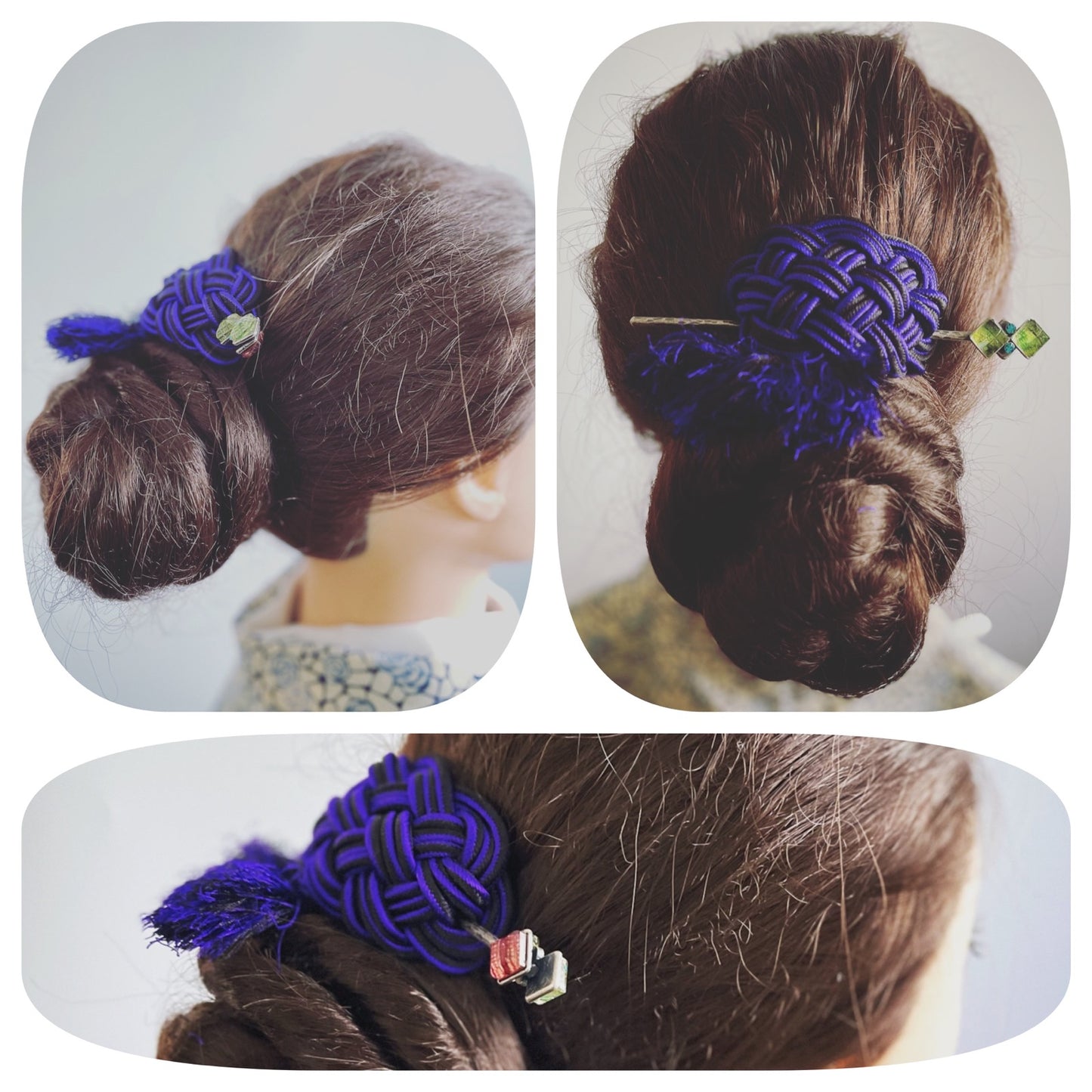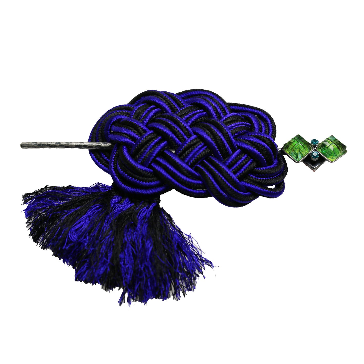 It is a hairpin barrette using the resin parts from the "Lily Series" (Yellow Green) and "Mizuhiki Series." The silk braid with blue and black thread is specially ordered from Kyoto craftsmen. These three braided cords are futher braided into an elaborate design with fringes. You can also use the hairpin part separately. It goes well, especially with kimonos. It is also an ideal gift for loved ones.