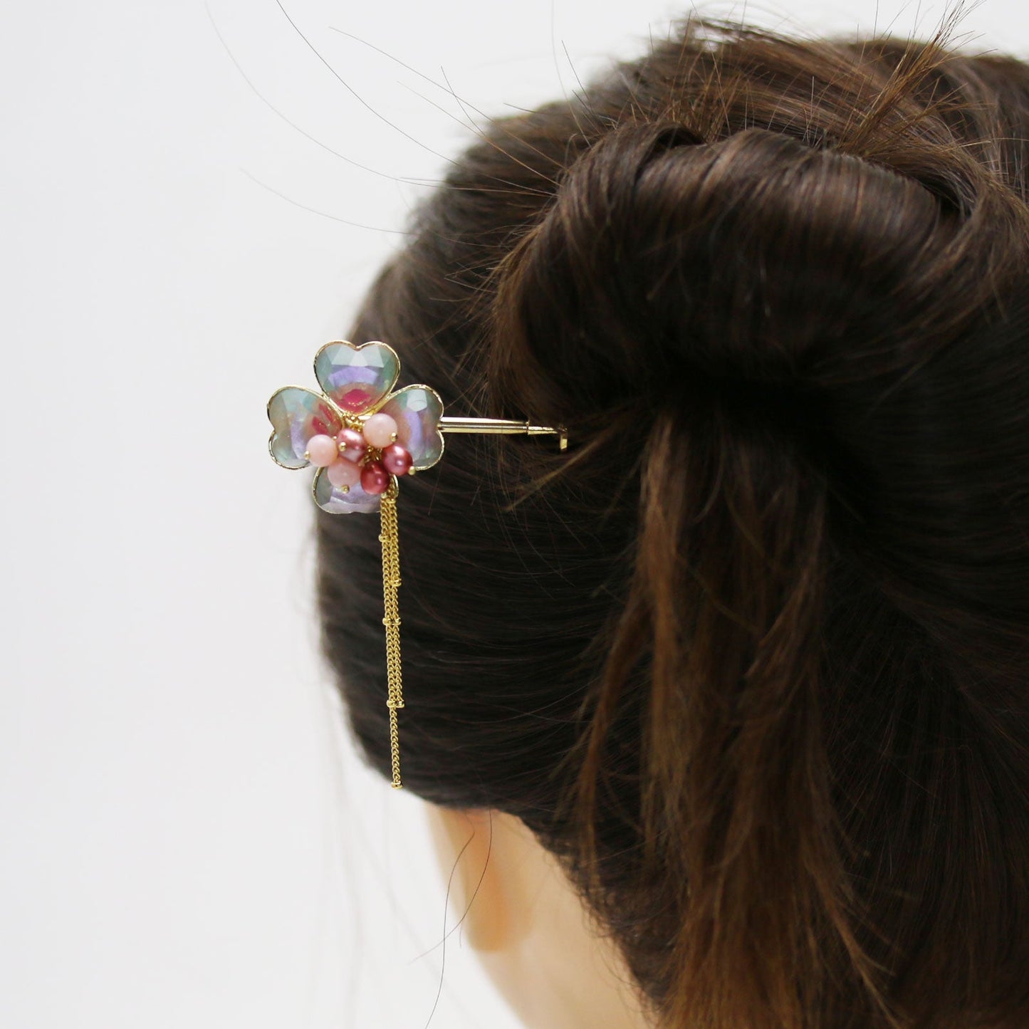 It is a changeable ornament hairpin using the resin parts, from the "Flame Series" (Blue). We were hanging freshwater pearl and pink common opal to match the hue of the resin.