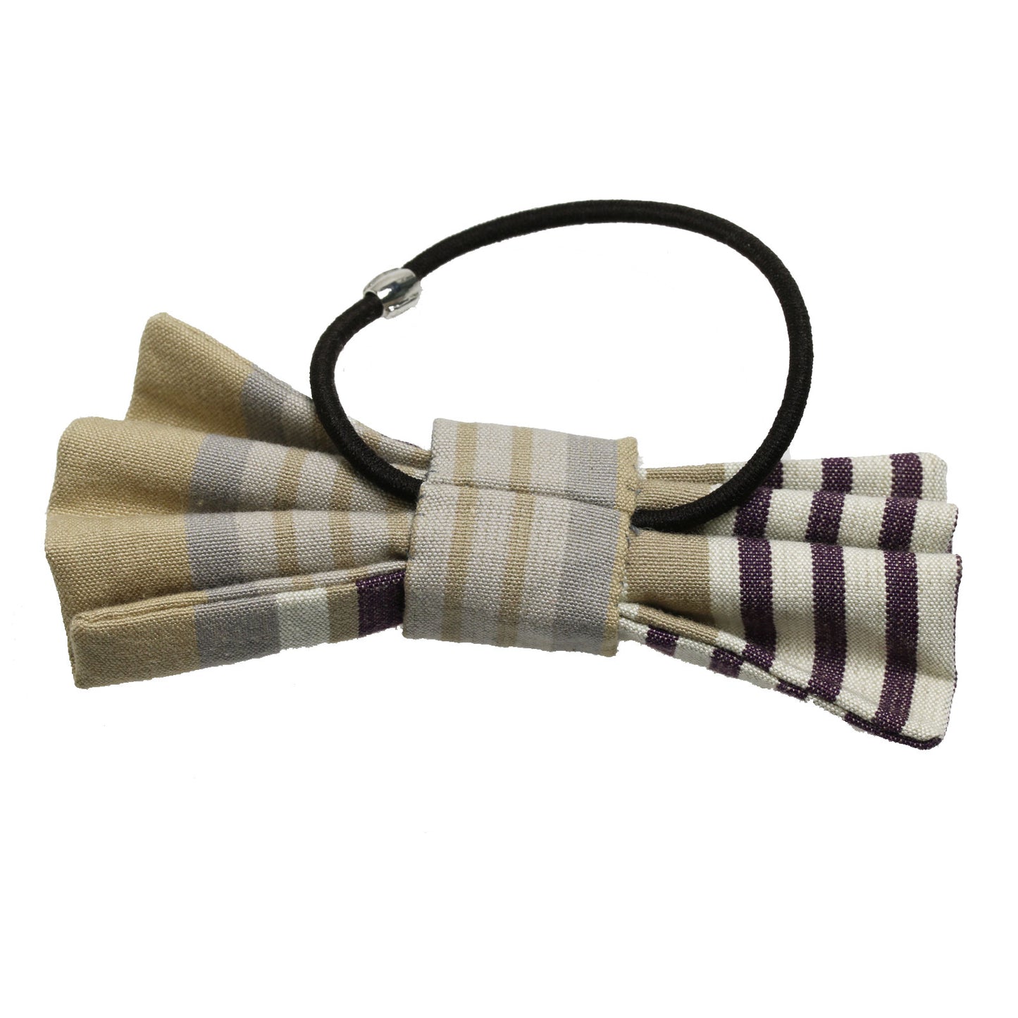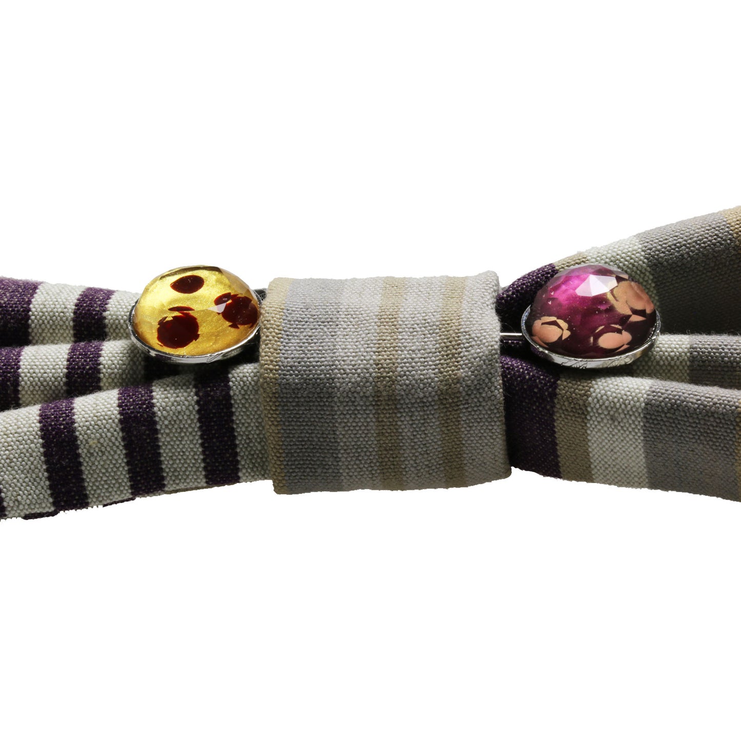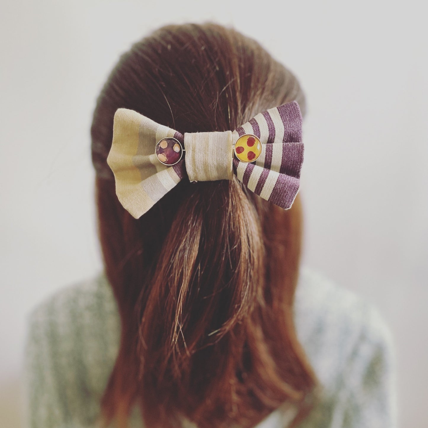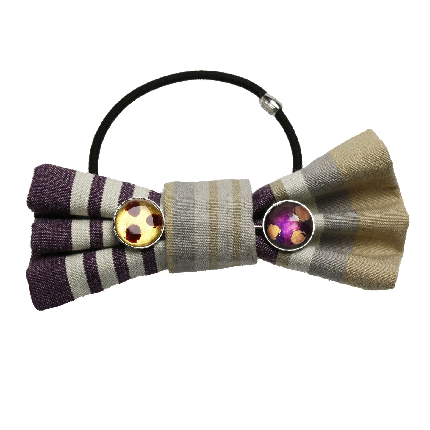 It is a ribbon shape hair elastic using the resin parts from the "Poison Mushroom Series." The striped fabric is shaped into a ribbon, and resin parts are arranged in the middle. Because of its big size, the presence is conspicuous. Ribbons are an eternal crush on women. Please feel free to use it not only as a hair elastic but also as a scarf clasp.
