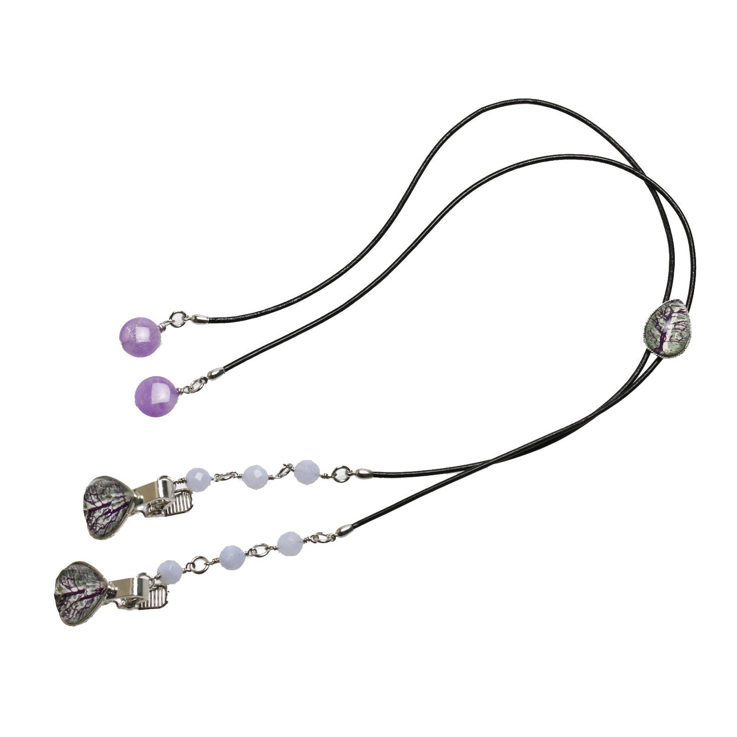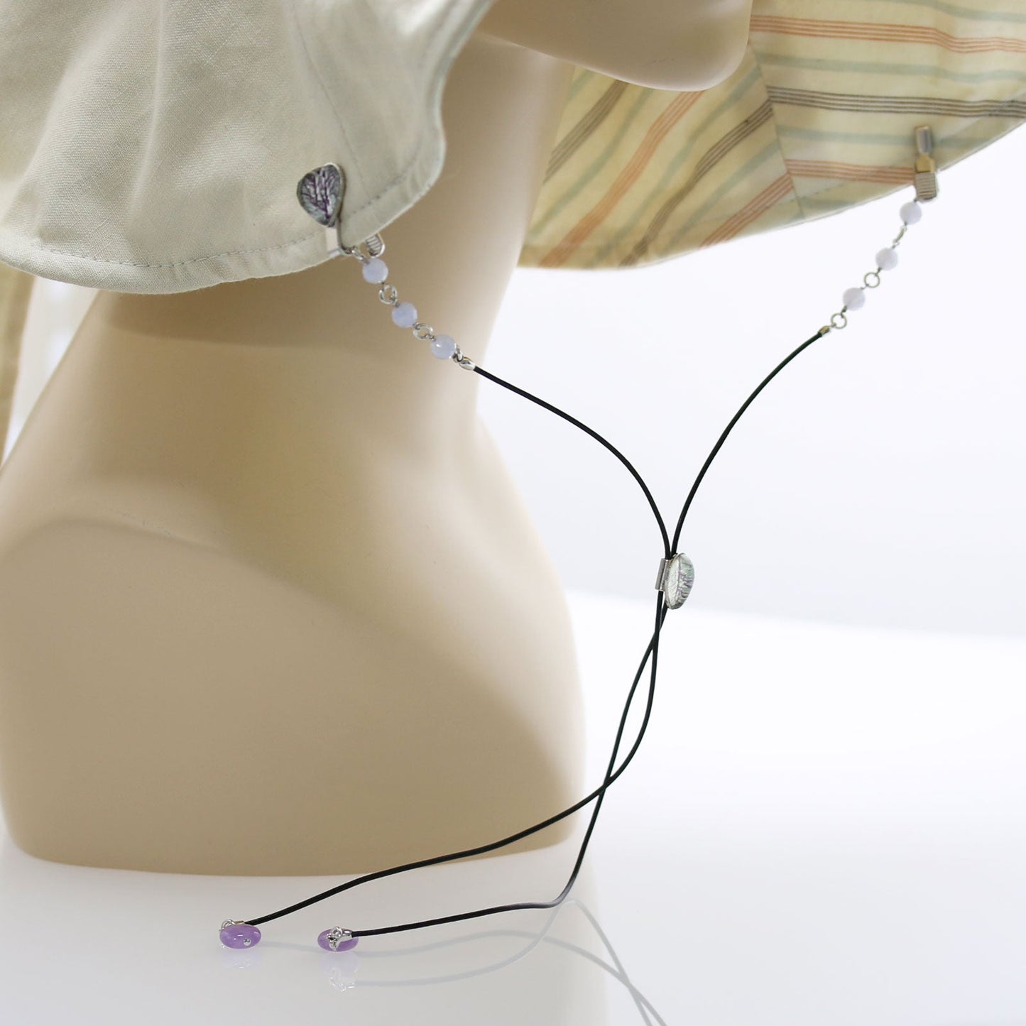 It is a hat clips using the resin parts from the "Forest Series" (Purple). It was a combination of a blue lace and amethyst to match the hue of the resin. Move the circle-type parts up or down to adjust the length of the cord to stop the collar portion of the hat in the clip. Not only in the stop so that hat does not fly, but recommended as a unique stylish accessories.