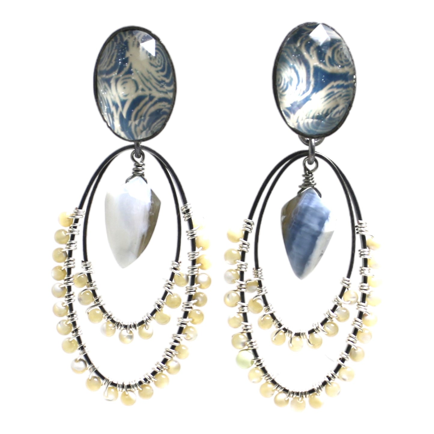 Hoop Stud Earrings Ellipse Blue Mother Of Pearl