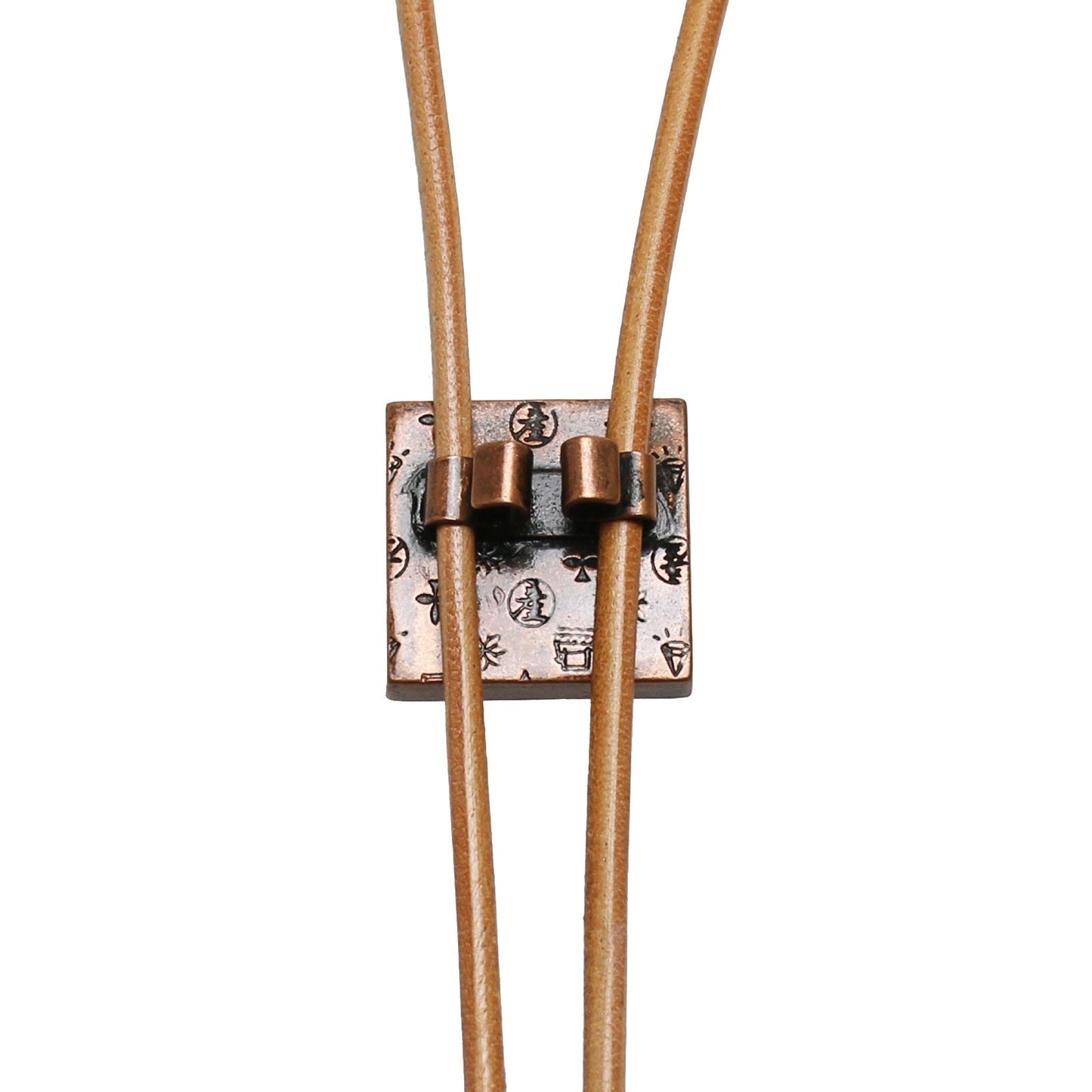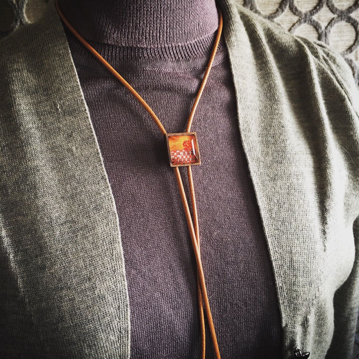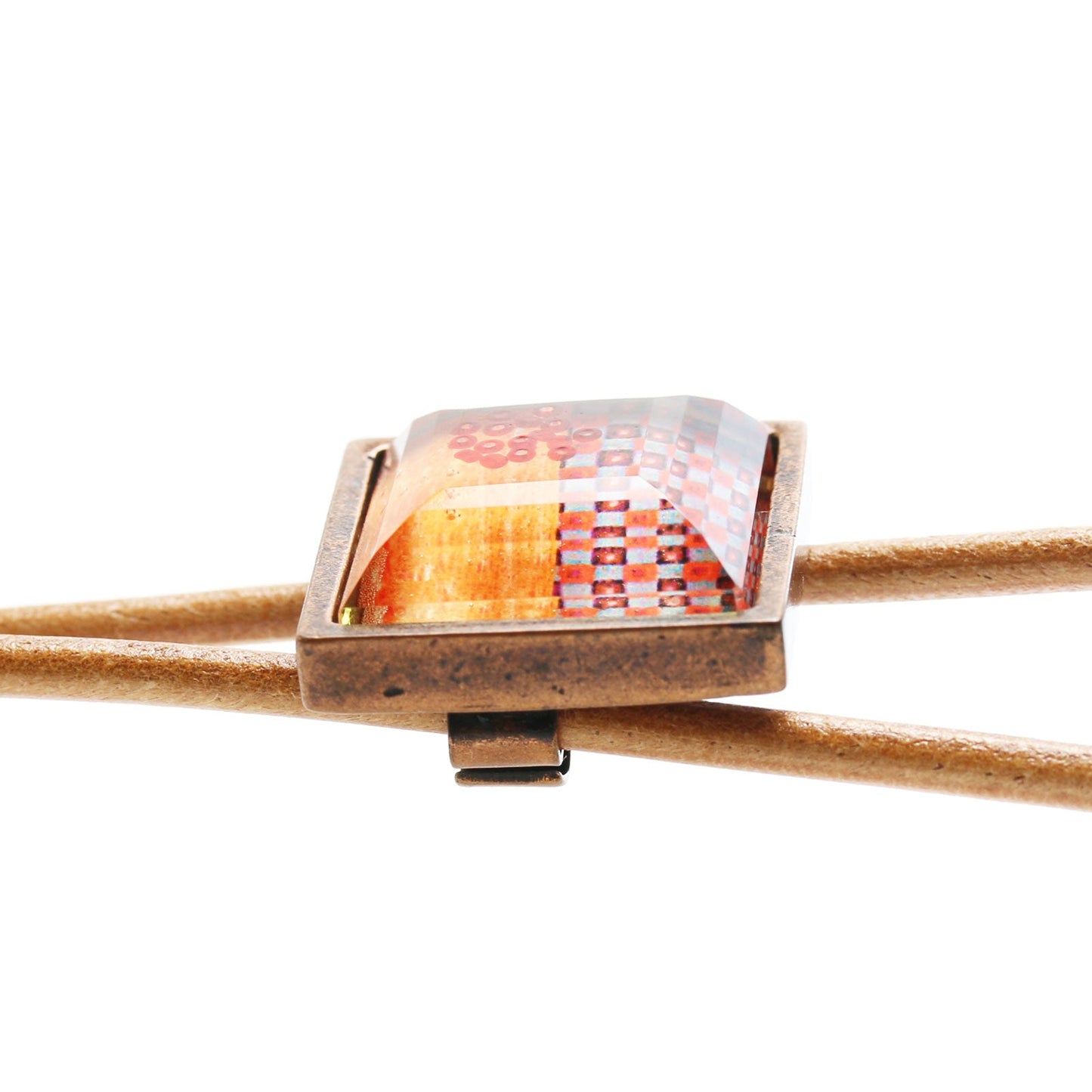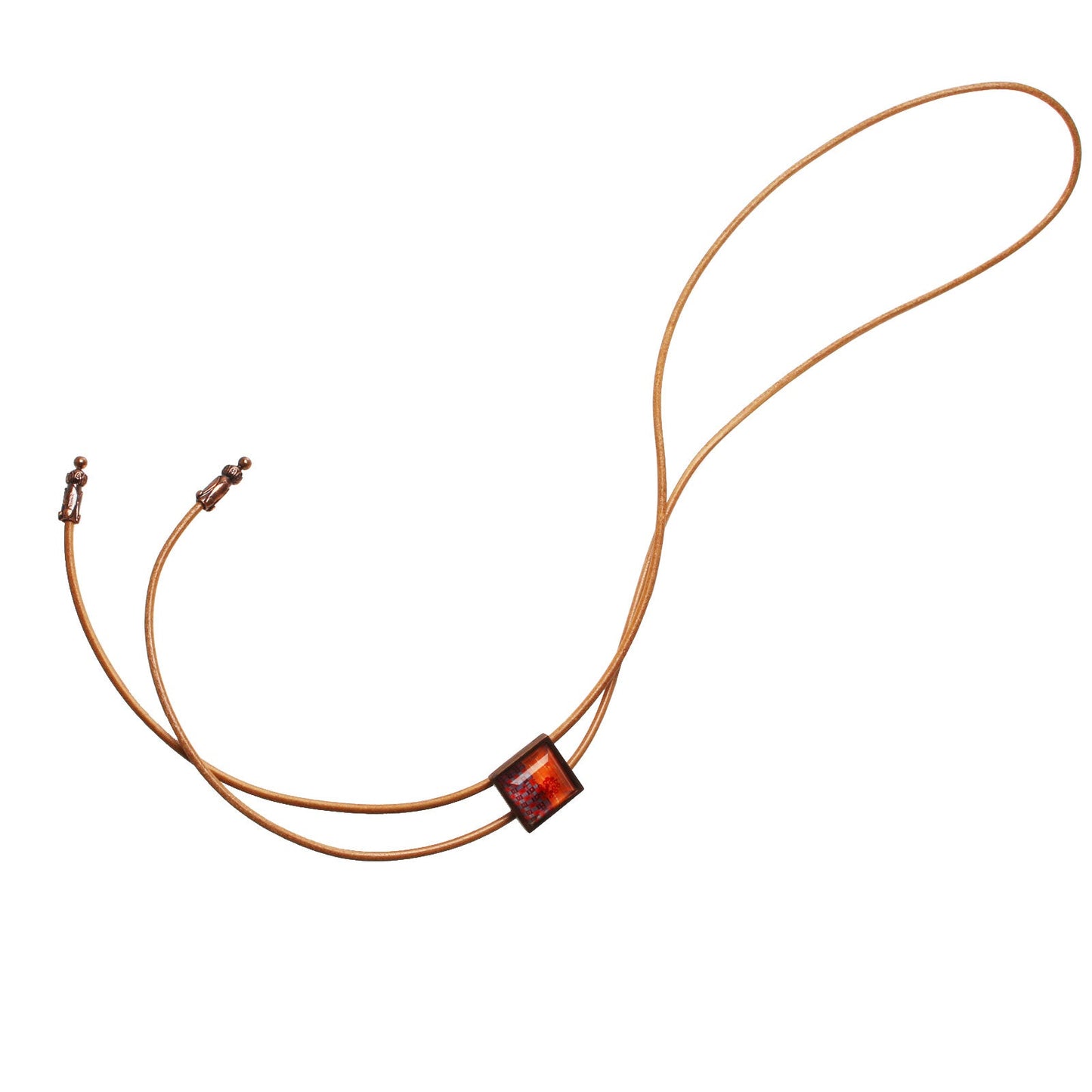 It is a leather strap bolo tie using square resin parts of "Carpet Series" (Orange). Individual orange color attracts eyes. Pleasing to casual clothing accents.