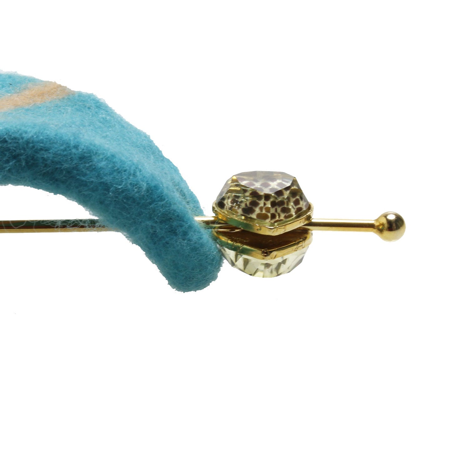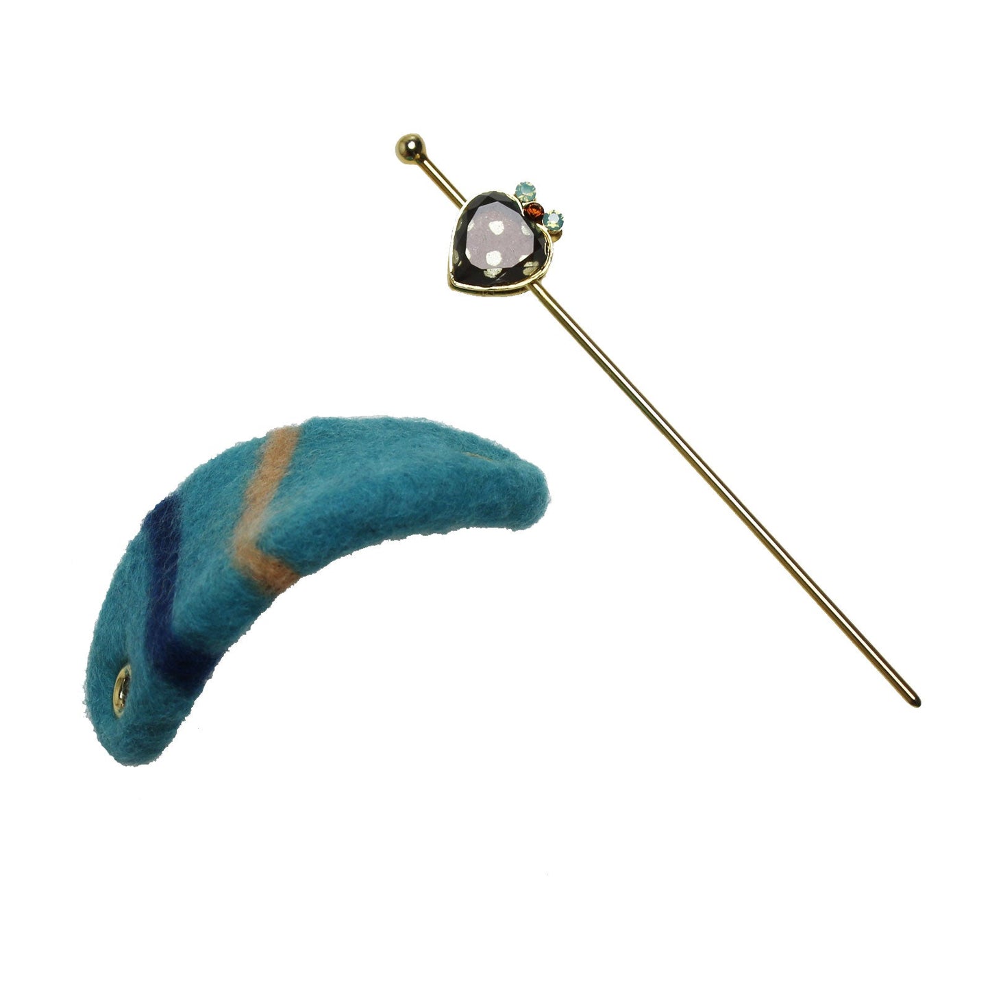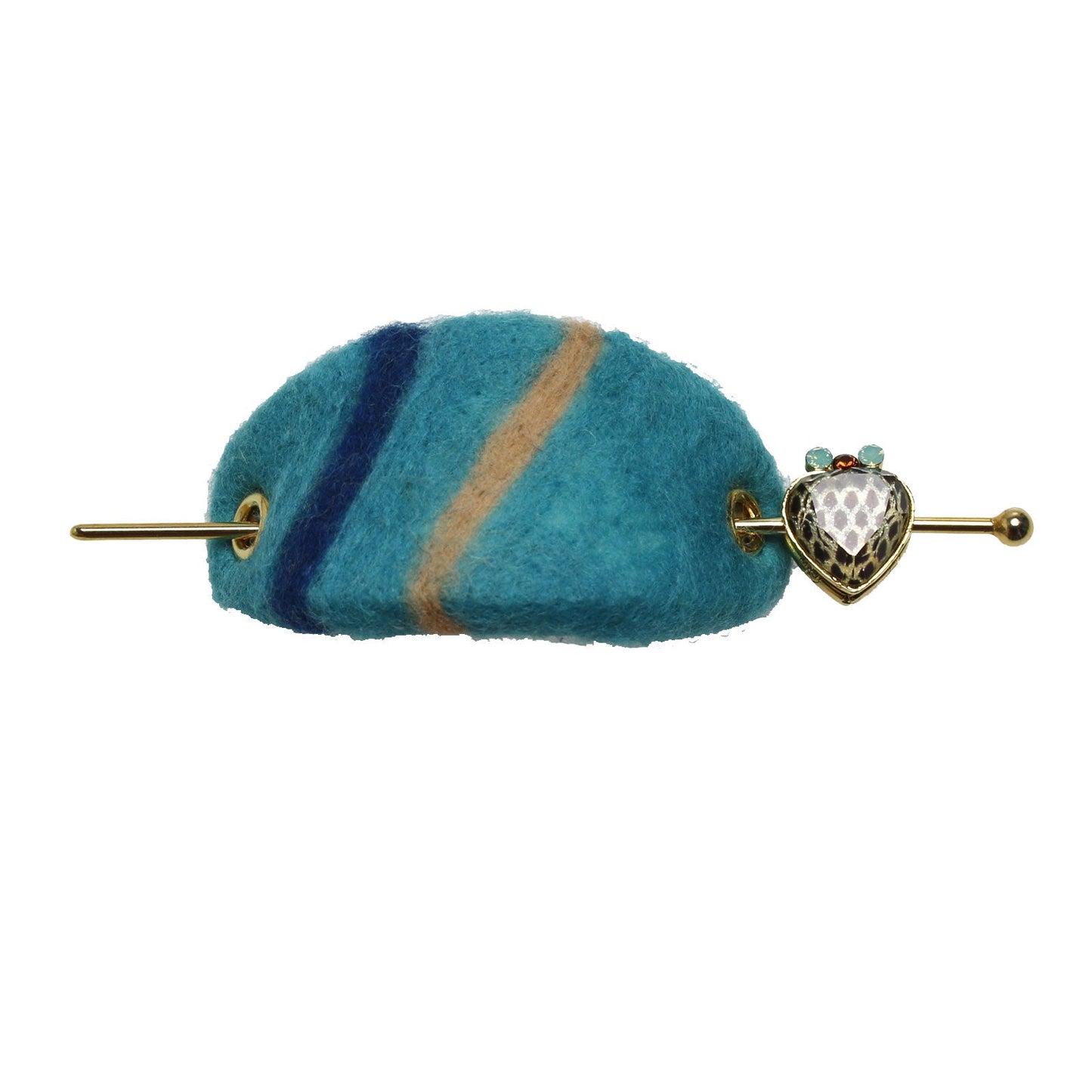 Es un pasador de horquilla de la "Serie Calcetines Azul Marino" fabricado en resina. Ha afieltrado lana azul claro usando una aguja sobre fieltro comprimido y líneas añadidas para acentos. Es un diseño bidireccional que solo puede usarse con una barra para el cabello. Cada una de las partes del corazón de resina tiene un diseño diferente, que también es atractivo.