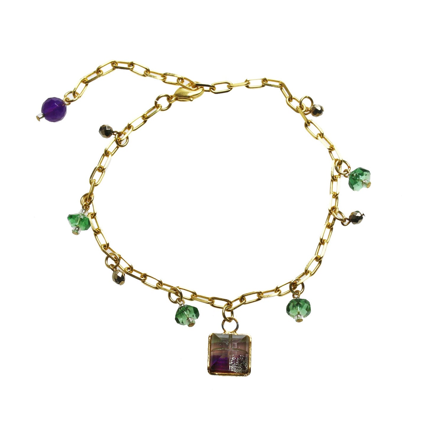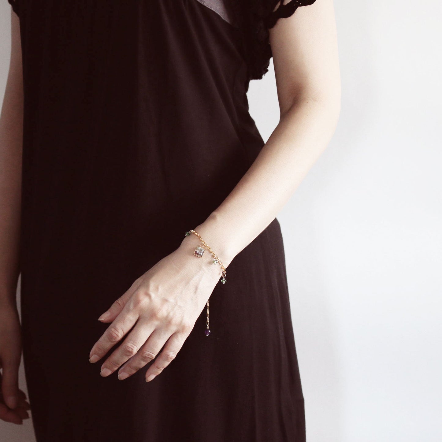 Es una pulsera que utiliza piezas de resina de "Rainbow Series (Purple)". Tire de los ojos con un diseño colorido de diferentes colores de cuentas que cuelgan de una cadena dorada. Recomendado para un hermoso acento casual de la muñeca. La amatista está unida al ajustador.