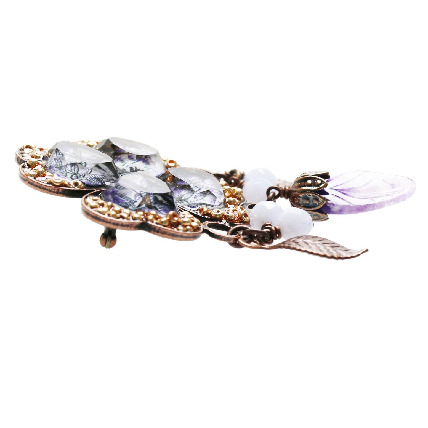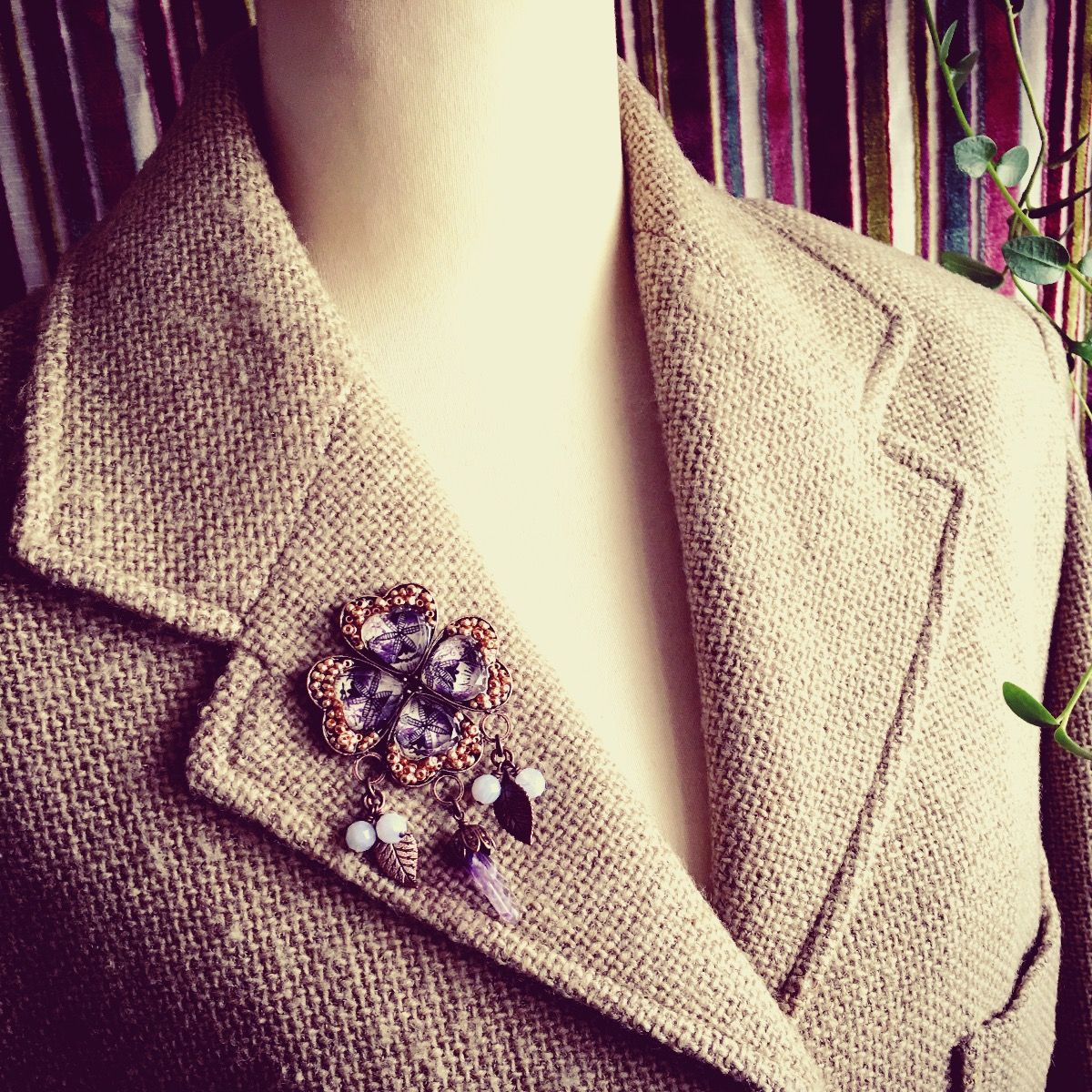 Es un broche con piezas de resina de la "Serie Lily" (Morado). Cordón azul a juego con el color de la resina, es un precioso diseño que se mece amatista en forma de hoja. Recomendado para acento individual del pecho. Es un artículo popular para regalos.