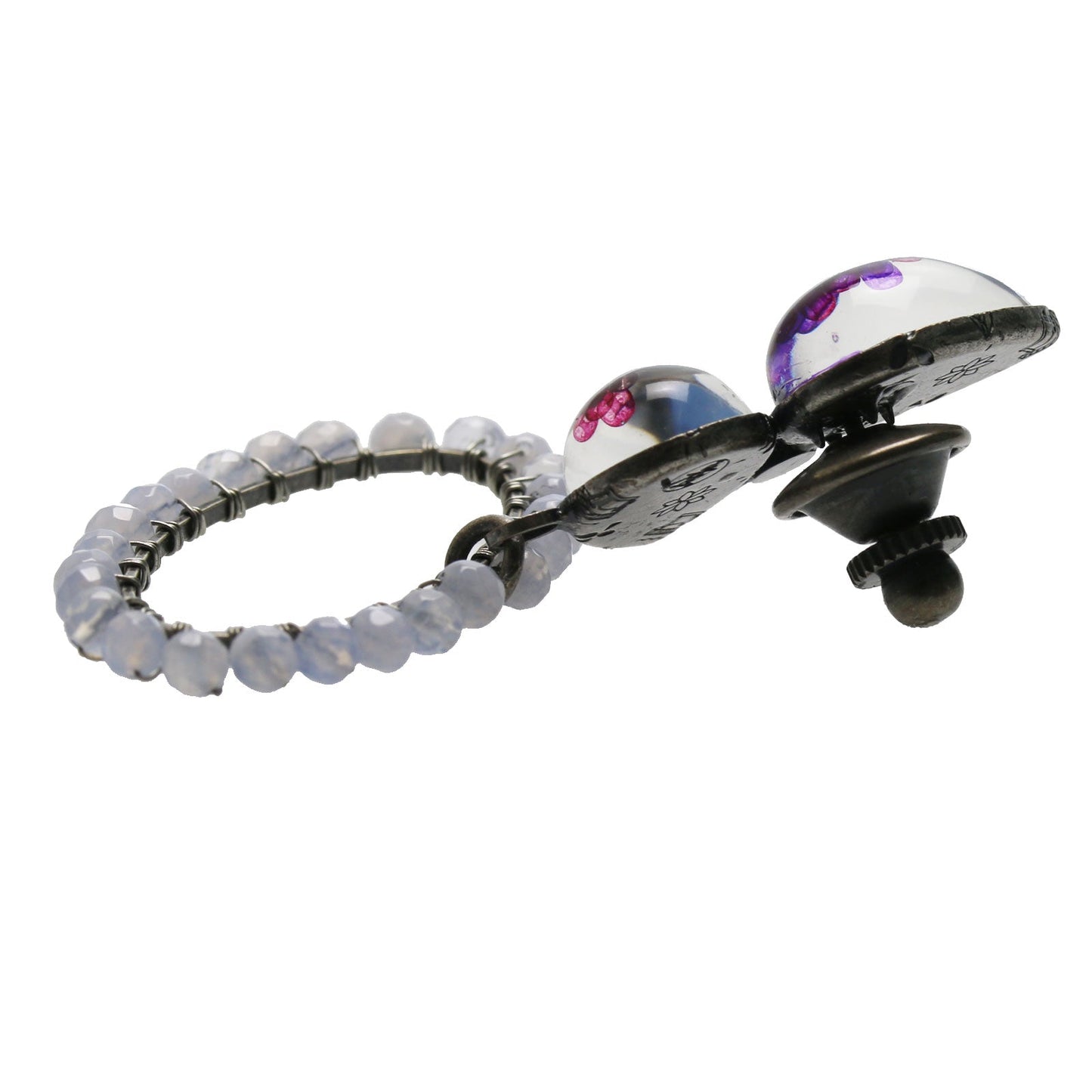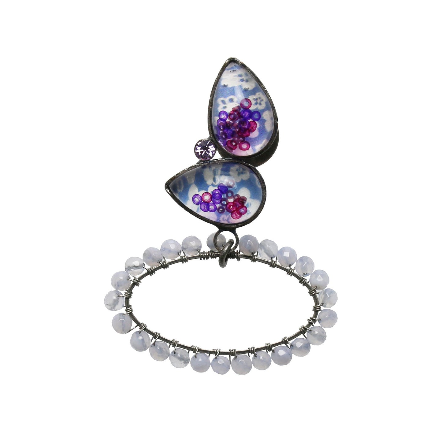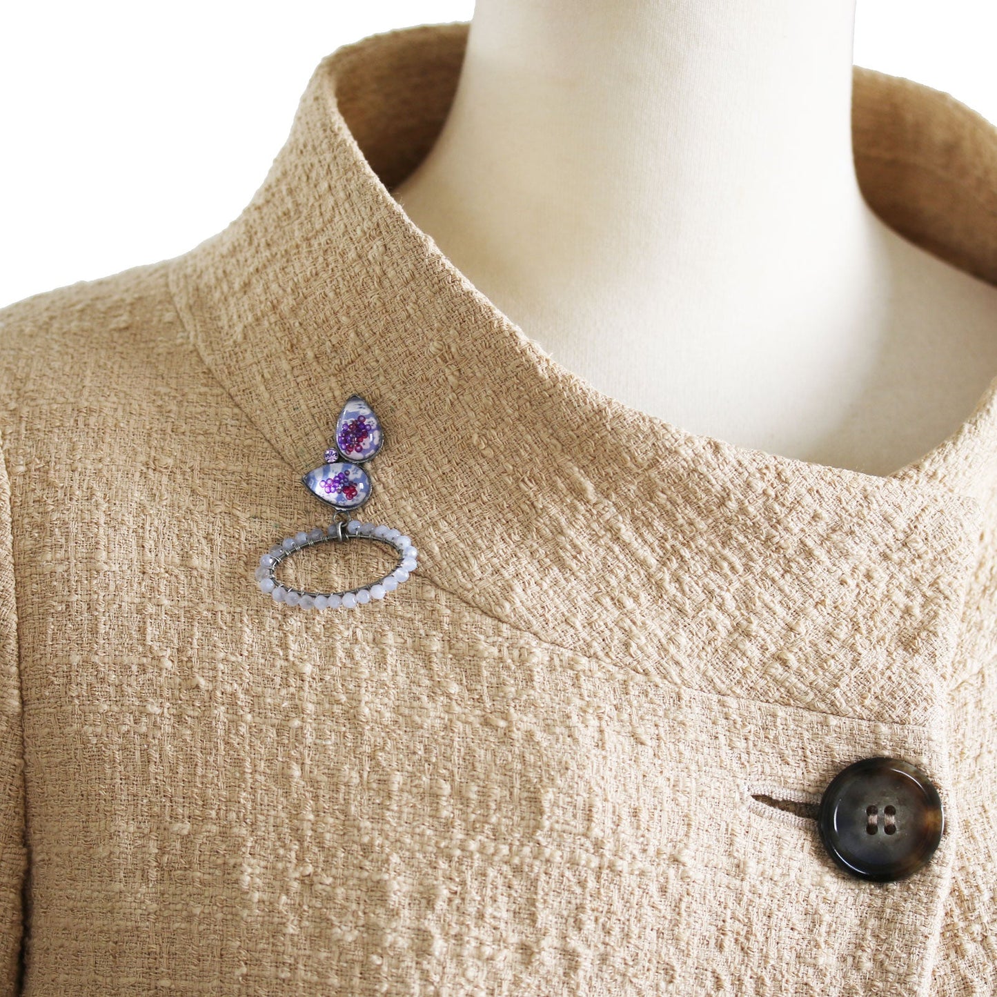 Es un broche de alfiler para sujetar anteojos que utiliza piezas de resina de la "Serie Plum Cake" (Púrpura). Puedes usarlo como portagafas colgando las gafas en la parte de la anilla tejida con encaje azul. También se recomienda para el acento individual del pecho como pin de solapa.