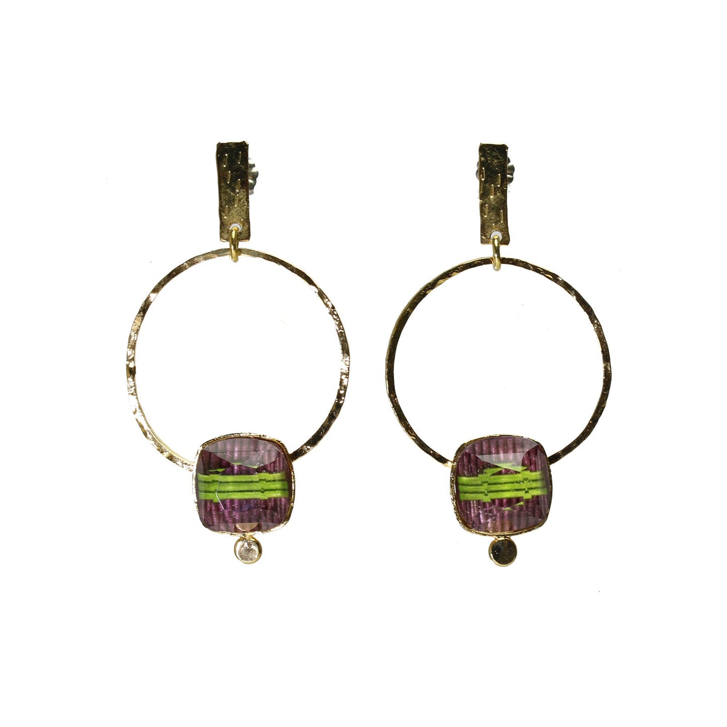 It is a sleek hoop earring using the resin part from the "Mizuhiki Series." The shining gold and unique color of the resin part are eye-catching. The mizuhiki painted purple, pink, and yellow-green line up in the resin. Thus, the transparency stands up more. It is easy to wear because it's light more than it looks. It goes well as daily use or formal.