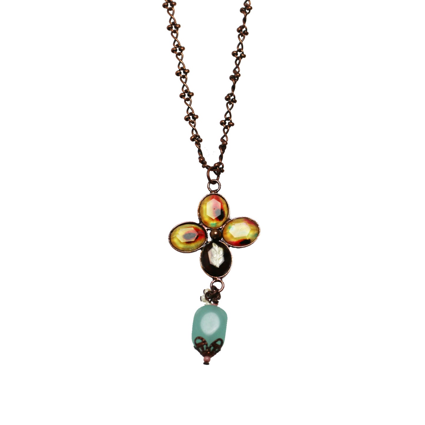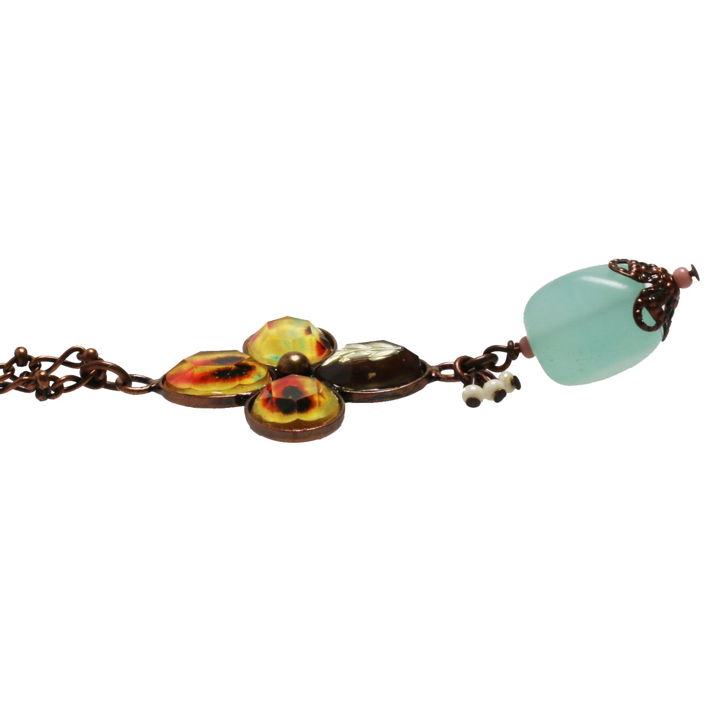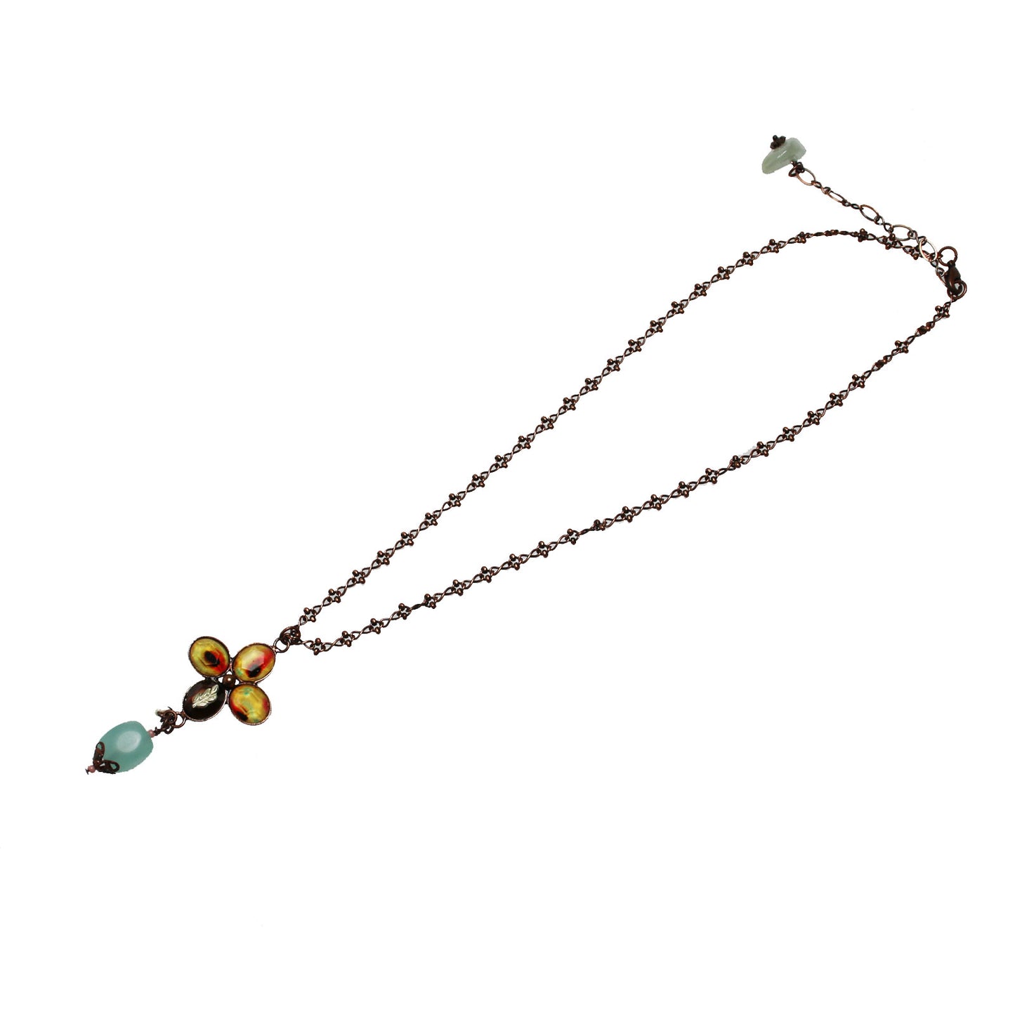It is a necklace using the resin parts from the "Dororon Series" (Pink). One of the flower petals has a silver leaf in the resin. The translucent blue glass hanging below is eye-catching. Enjoy your fashionable look to match your clothes.