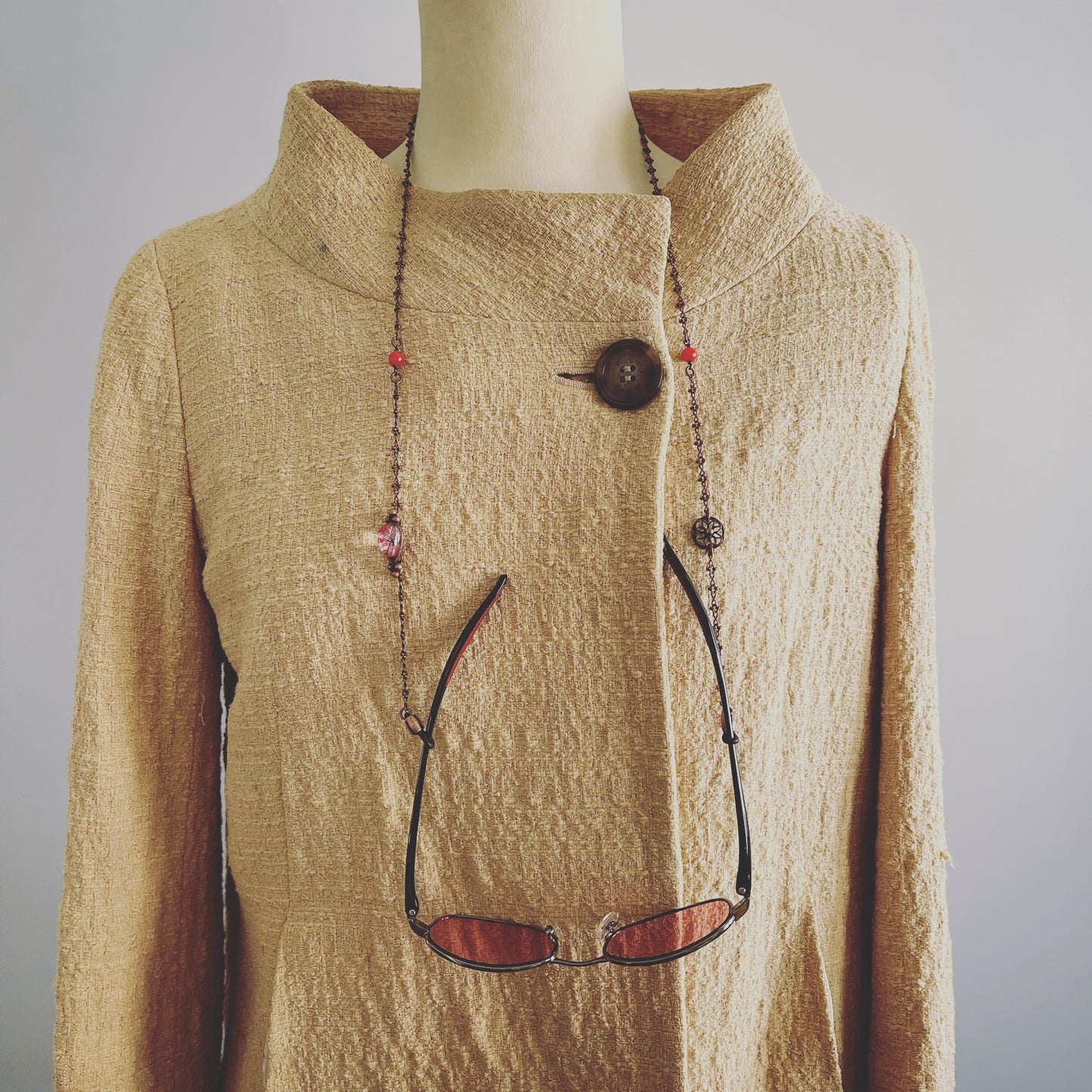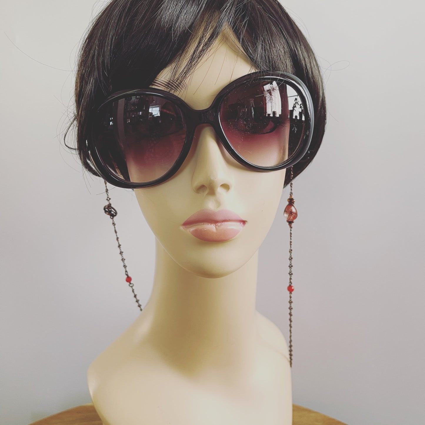 Los anteojos de sol y los anteojos para leer se ponen y se quitan con frecuencia, pero es una molestia guardarlos en un estuche y guardarlos en una bolsa cada vez que se los quita, y tiene que buscar a tientas en su bolso cuando los necesita. Muchas personas los usan en la cabeza como una capa, lo cual es genial, pero no me gusta la sensación de tirantez en mi cabeza. Solía pensar que usar una correa alrededor de mi cuello era un poco incómodo, pero cuando se trata de la incomodidad en mi cabeza vs. mi cuello, mi cabeza es más incómoda... así que durante muchos años usé una correa de gafas para "qué hacer cuando te la quitas".