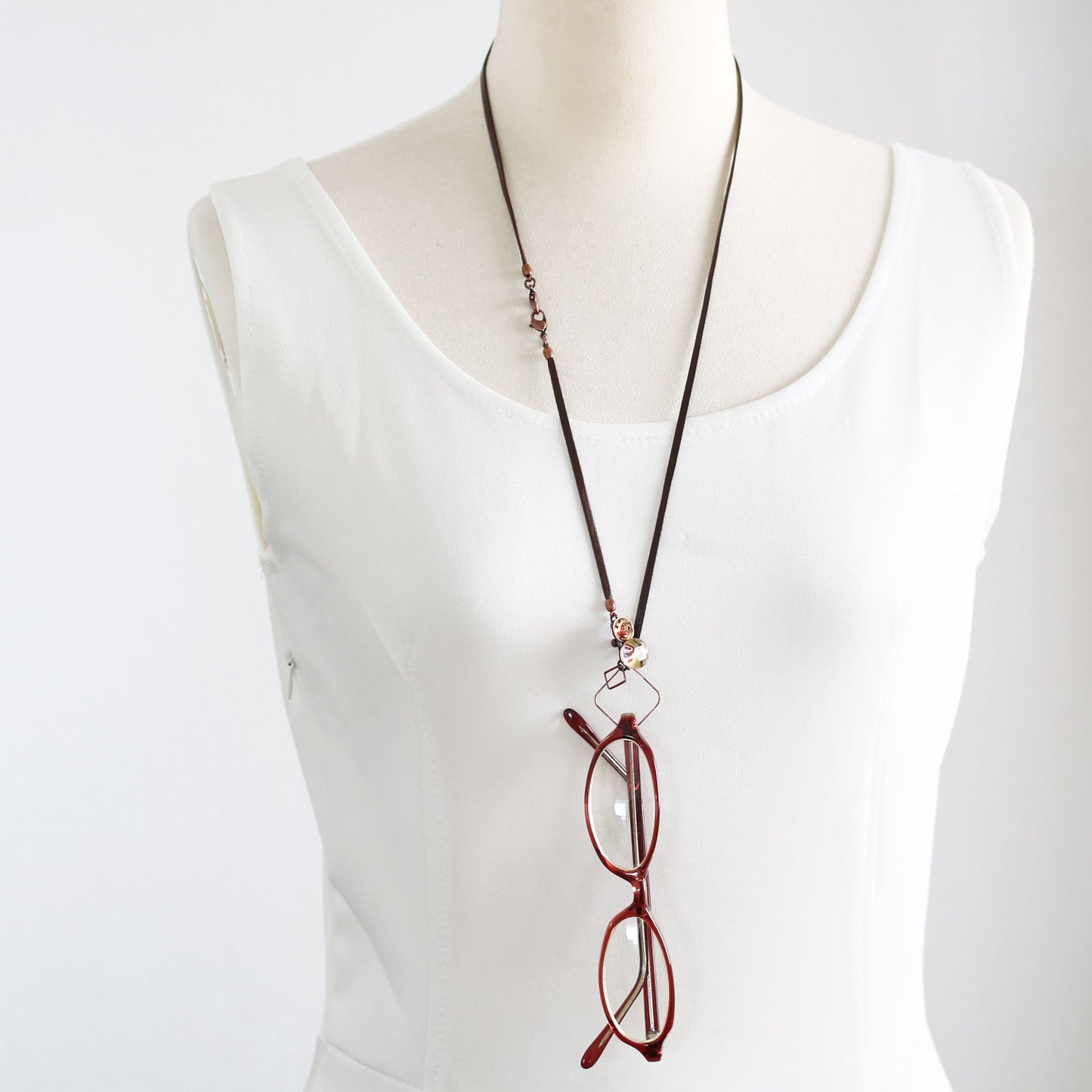 Los anteojos de sol y los anteojos para leer se ponen y se quitan con frecuencia, pero es una molestia guardarlos en un estuche y guardarlos en una bolsa cada vez que se los quita, y tiene que buscar a tientas en su bolso cuando los necesita. Muchas personas los usan en la cabeza como una capa, lo cual es genial, pero no me gusta la sensación de tirantez en mi cabeza. Solía pensar que usar una correa alrededor de mi cuello era un poco incómodo, pero cuando se trata de la incomodidad en mi cabeza vs. mi cuello, mi cabeza es más incómoda... así que durante muchos años usé una correa de gafas para "qué hacer cuando te la quitas".