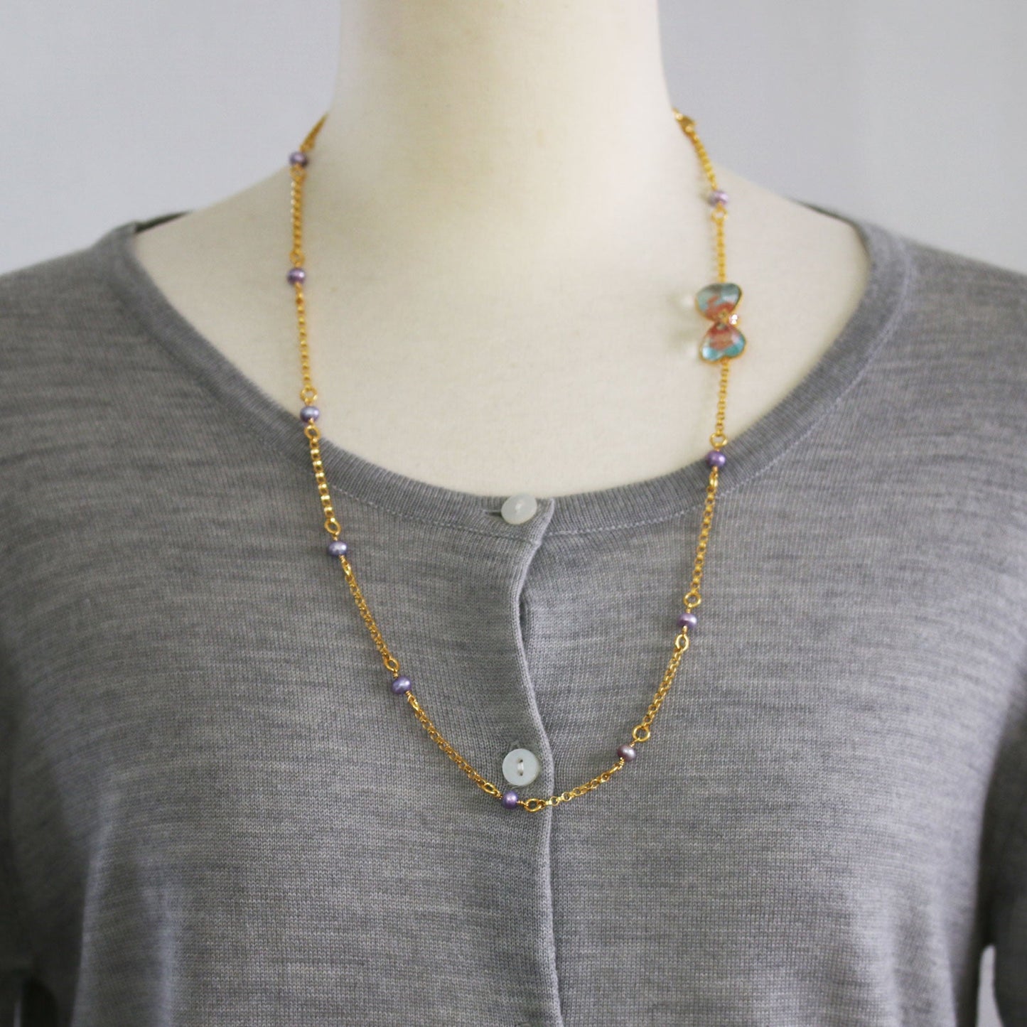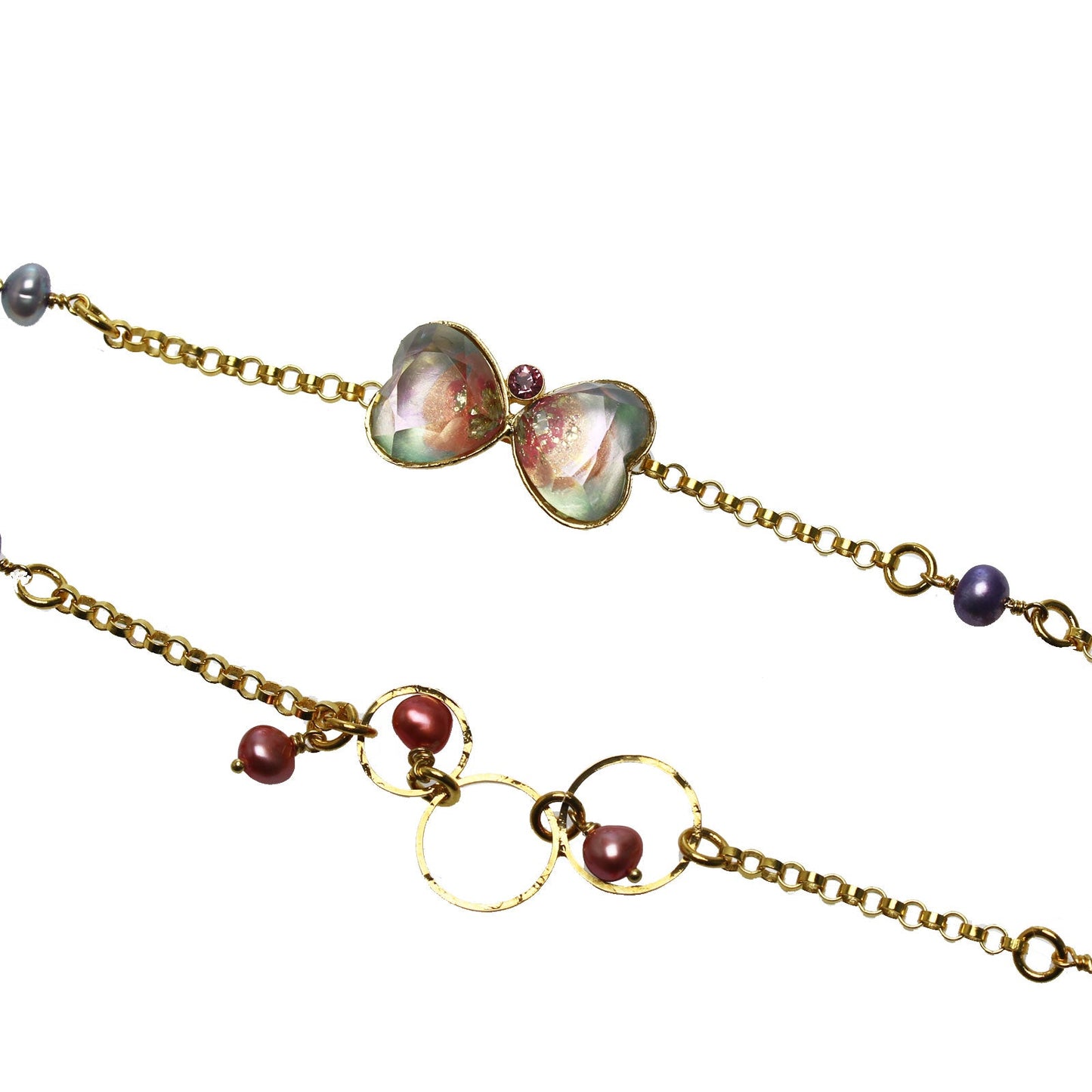 Es un collar de cadena de anteojos que utiliza piezas de resina, de la "Serie Flame (Azul)". Era una combinación de perlas de agua dulce y una cadena de oro de color rosa y púrpura para combinar con el tono de la resina. Las piezas de goma se pueden quitar. La izquierda y la derecha de la decoración son diferentes diseños asimétricos. Se recomienda para un acento único no solo colgar las gafas. Puedes usarlo como collar conectando el cierre.