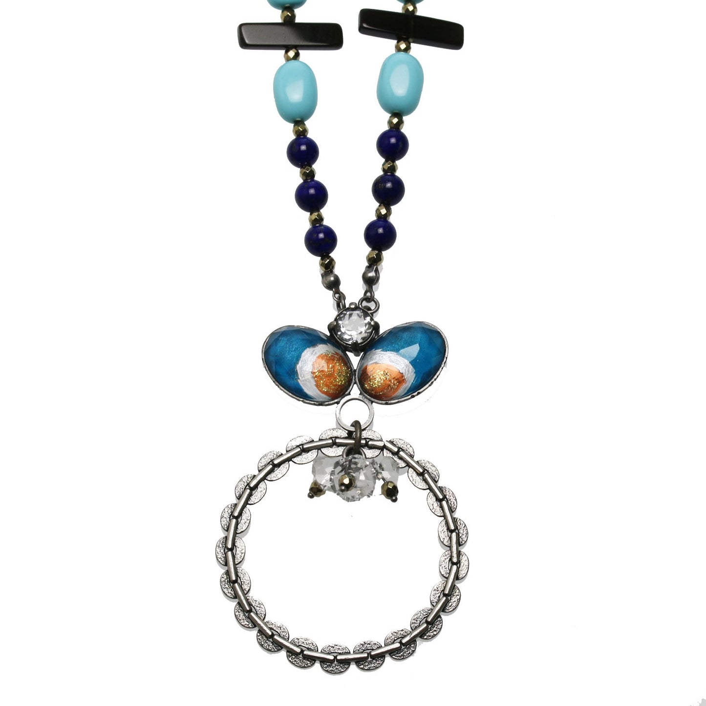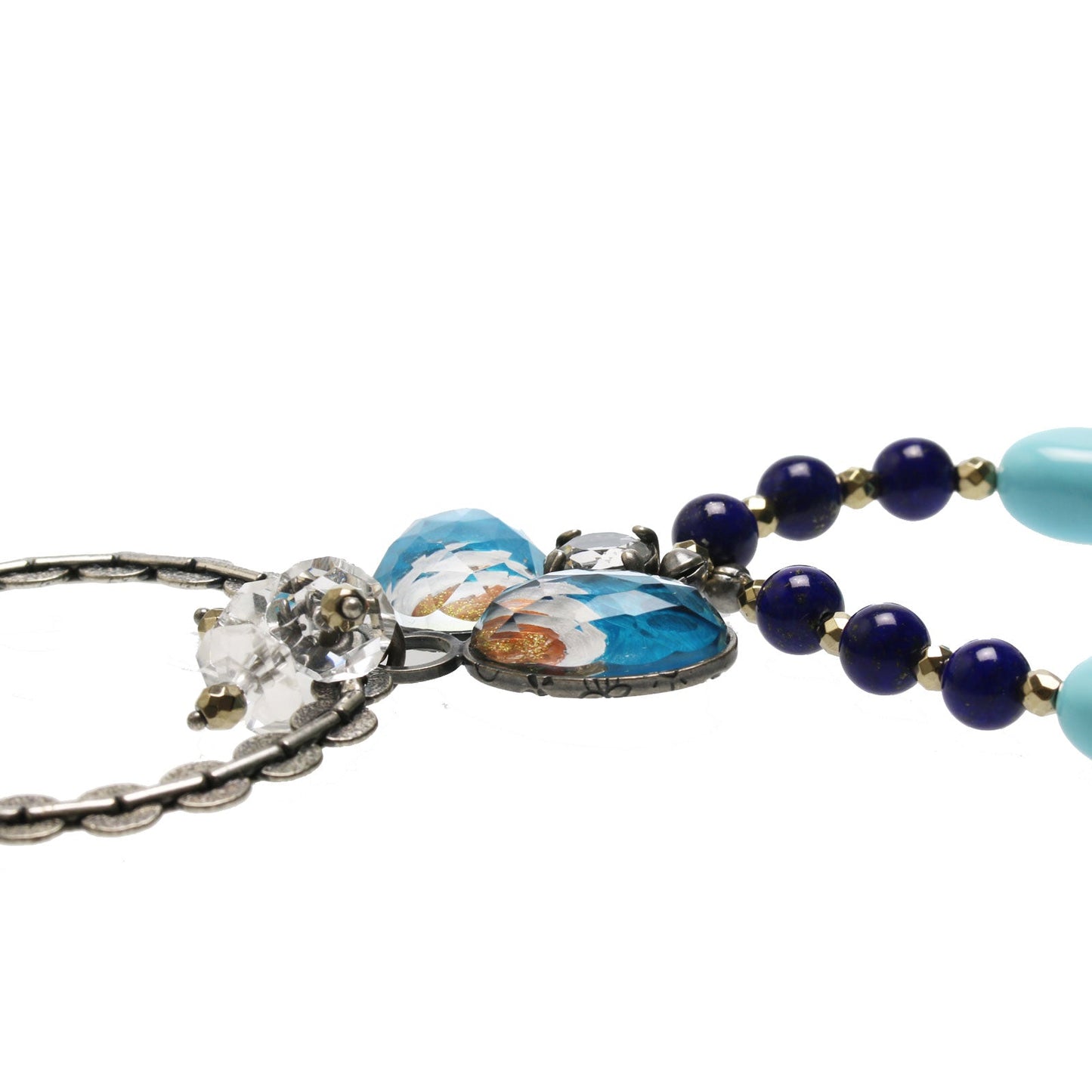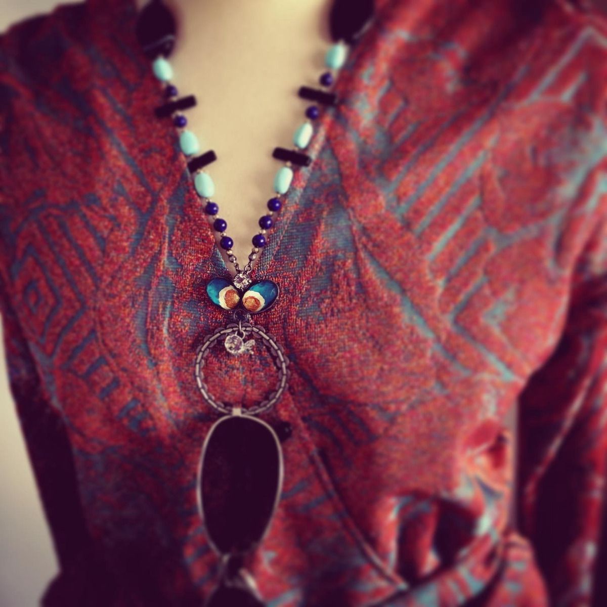 Se trata de un collar portagafas que utiliza las piezas de resina de la "Serie Flame" (Peacock). Puedes colgar las gafas en la parte del anillo. Piedras claras encima de la resina hay un cristal. Conectamos el ágata del Tíbet y el ónix y una turquesa artificial y lapislázuli y una hematita que contiene magnética.
