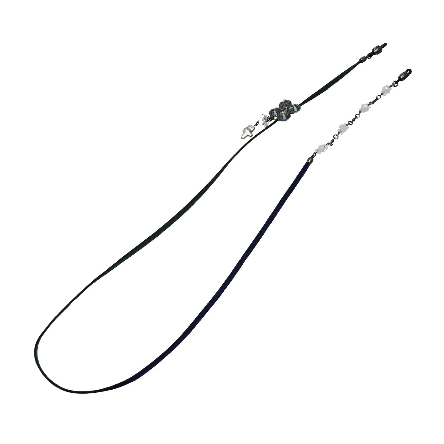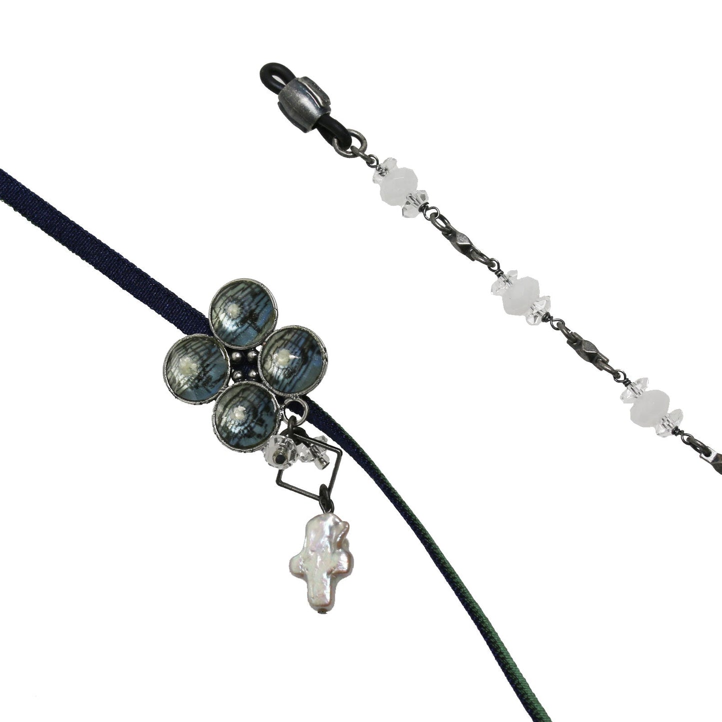 Es una cadena de anteojos. La parte principal tiene "Serie de notas musicales" (Azul) hecha de resina. Por un lado, los cristales y la perla de agua dulce en forma de cruz se cuelgan debajo de la resina. Por otro lado, tiene un precioso diseño que combina los cristales y la cuarcita blanca. La parte decorativa se balancea alrededor de la oreja, creando una atmósfera como si llevara pendientes colgantes. Este producto está hecho intencionalmente para que a la resina se le ponga polvo de plata o de oro como diseño y no se vea bien la nota musical. Debido a que corté la parte de la nota al azar, puede convertirse en un tono ligeramente diferente al de la fotografía.
