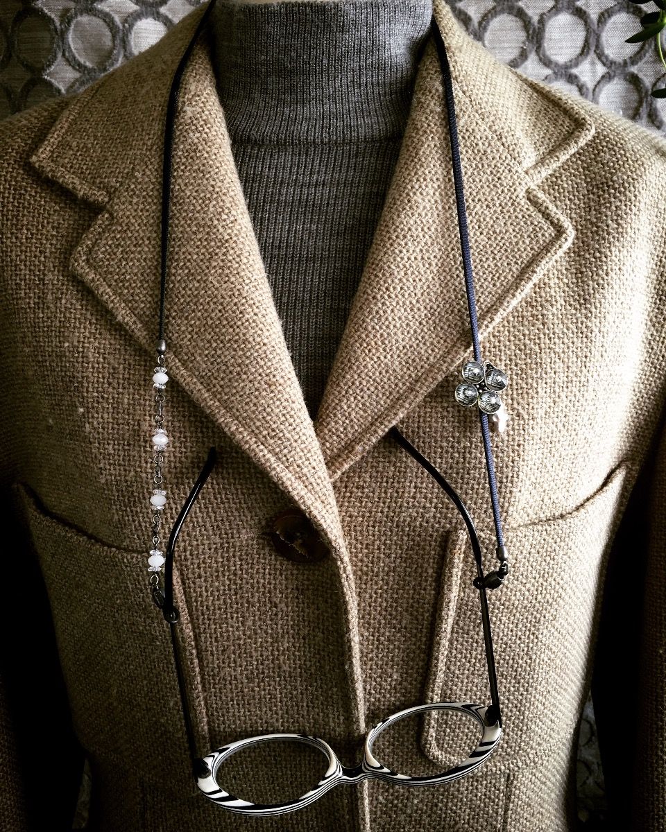 Los anteojos de sol y los anteojos para leer se ponen y se quitan con frecuencia, pero es una molestia guardarlos en un estuche y guardarlos en una bolsa cada vez que se los quita, y tiene que buscar a tientas en su bolso cuando los necesita. Muchas personas los usan en la cabeza como una capa, lo cual es genial, pero no me gusta la sensación de tirantez en mi cabeza. Solía pensar que usar una correa alrededor de mi cuello era un poco incómodo, pero cuando se trata de la incomodidad en mi cabeza vs. mi cuello, mi cabeza es más incómoda... así que durante muchos años usé una correa de gafas para "qué hacer cuando te la quitas".