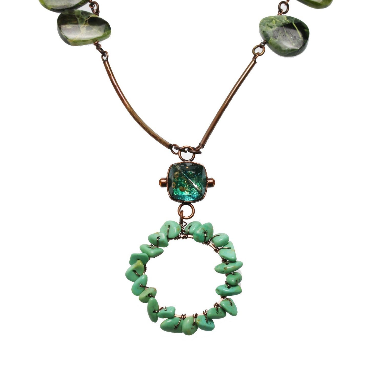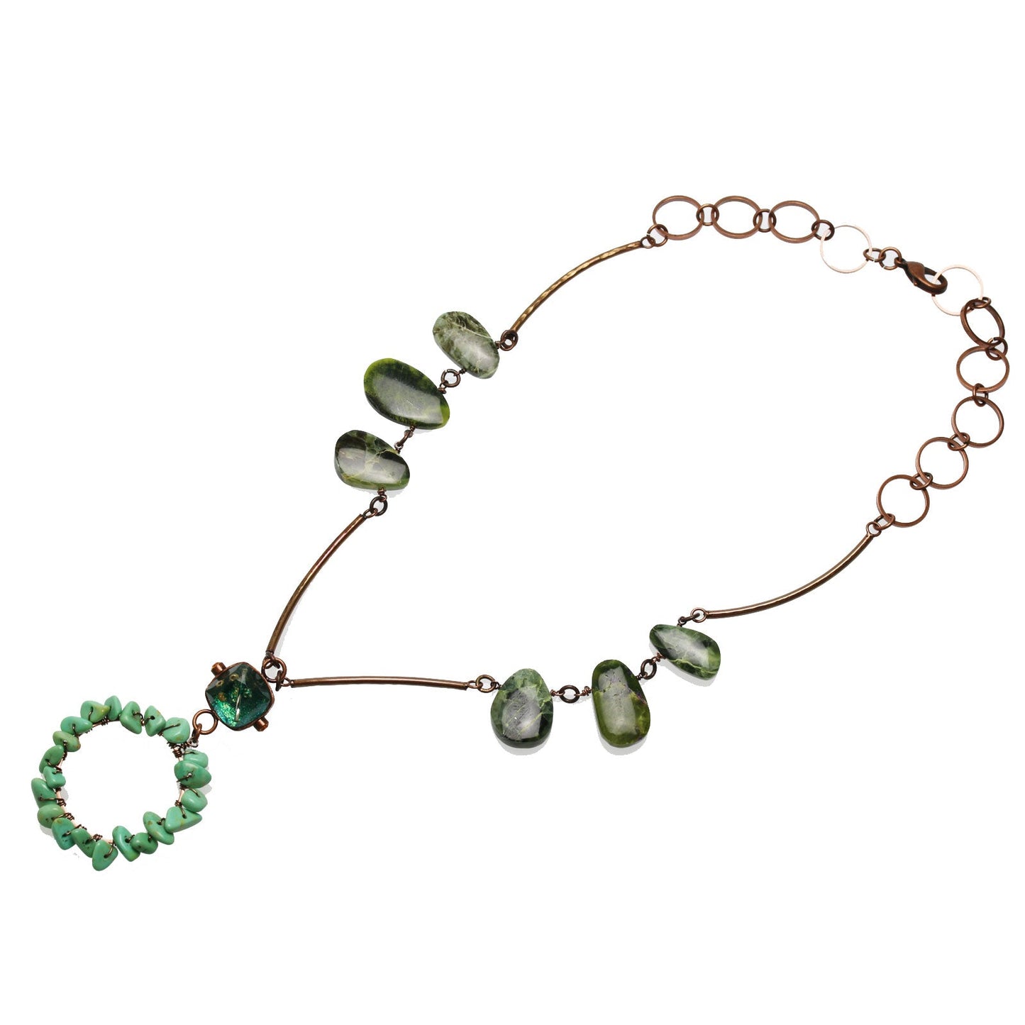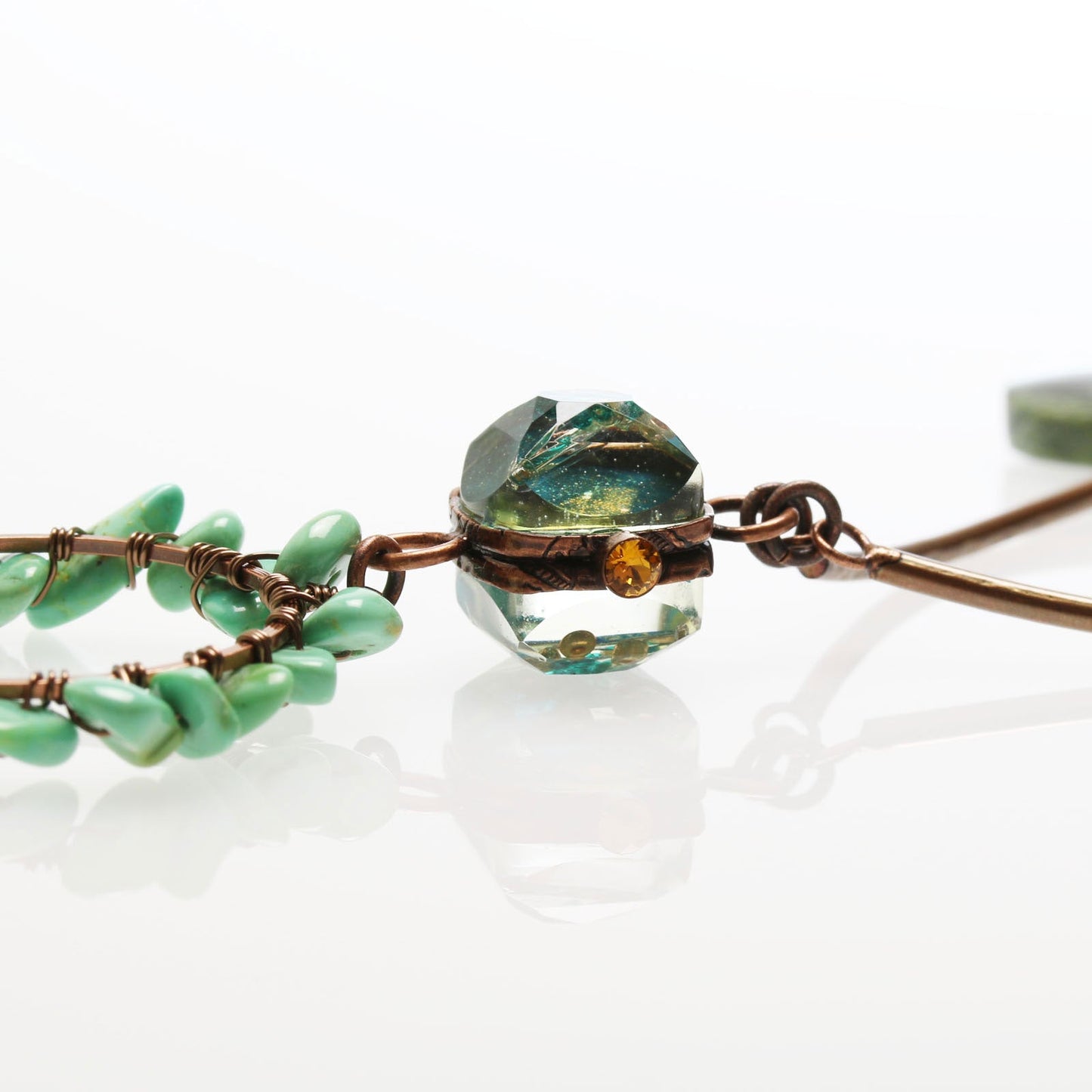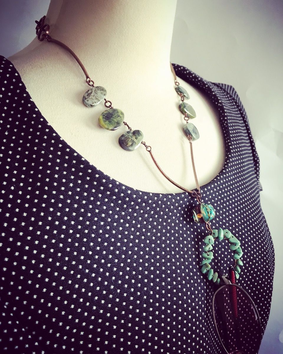 Se trata de un collar portagafas que utiliza las piezas de resina de la "Serie Jewel Box" (Emerald). Por favor, utilice la parte del anillo de punto de las gafas Hook en turquesa. Las piedras verdes son stichtitas.