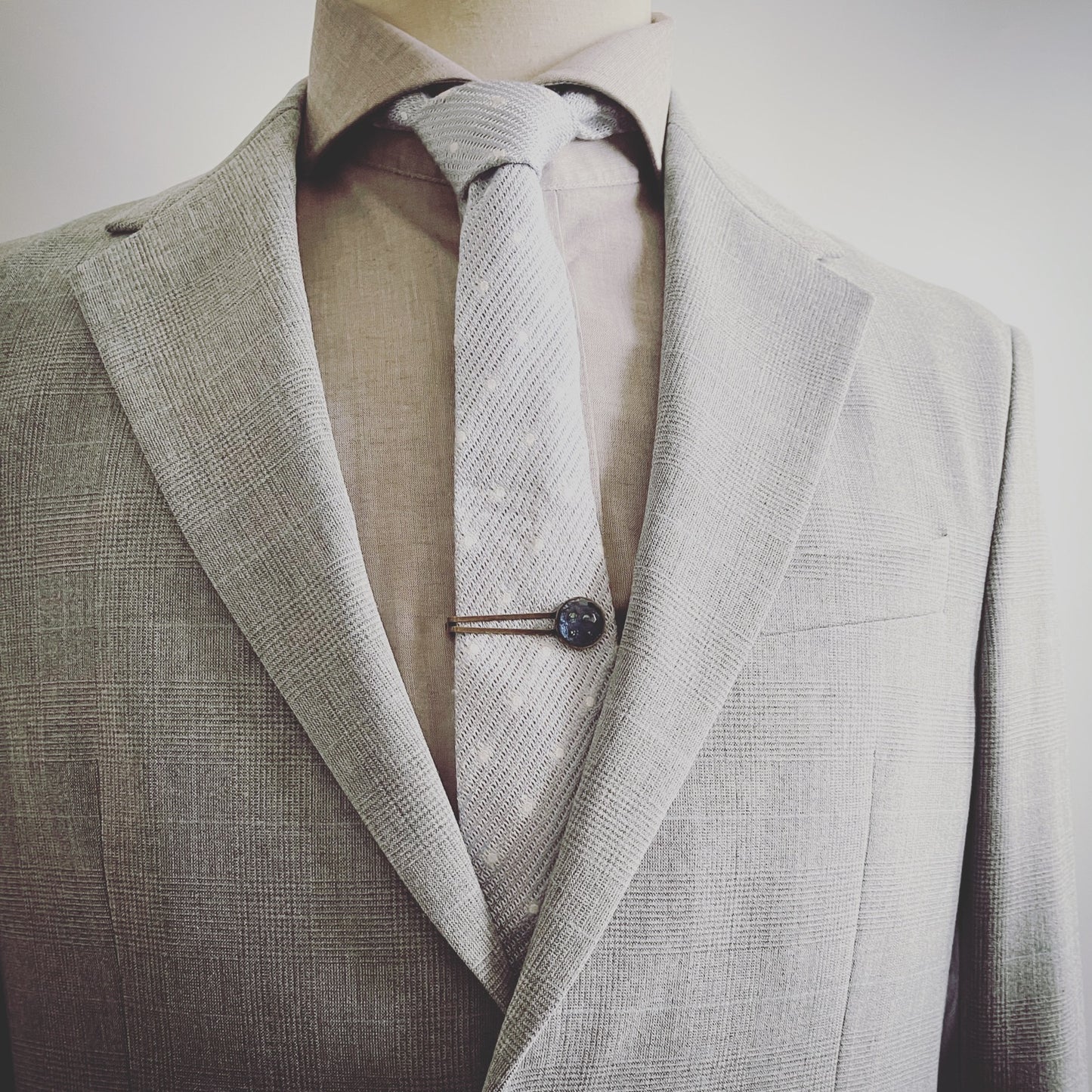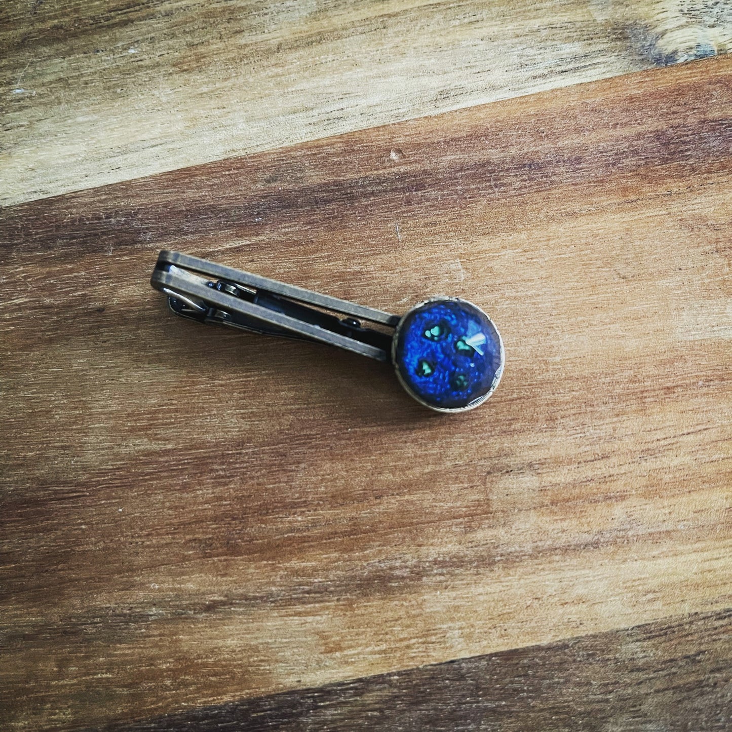 It is a simple tie clip with round resin parts of "Dandy Series". Beautiful blue attracts eyes. You can enjoy the casual fashion of a tie. Resin parts and metal parts are handmade.