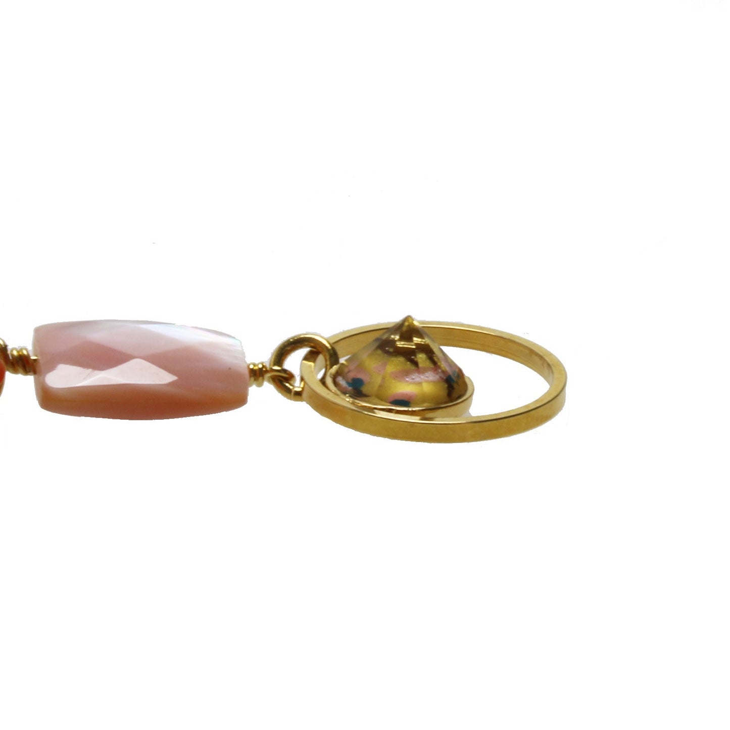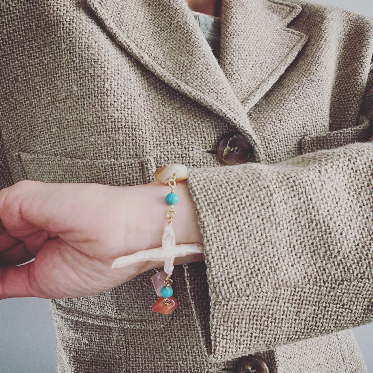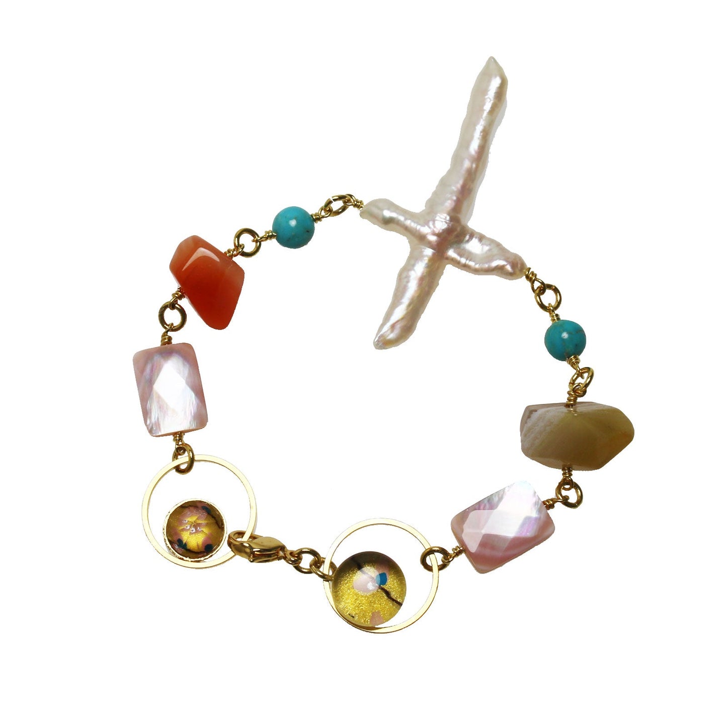 - perla de agua dulce, cornalina, concha, turquesa