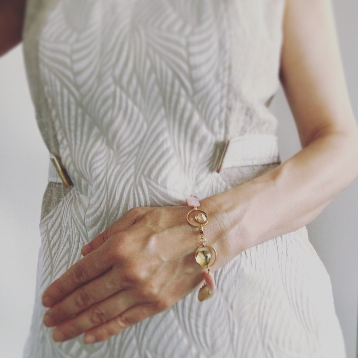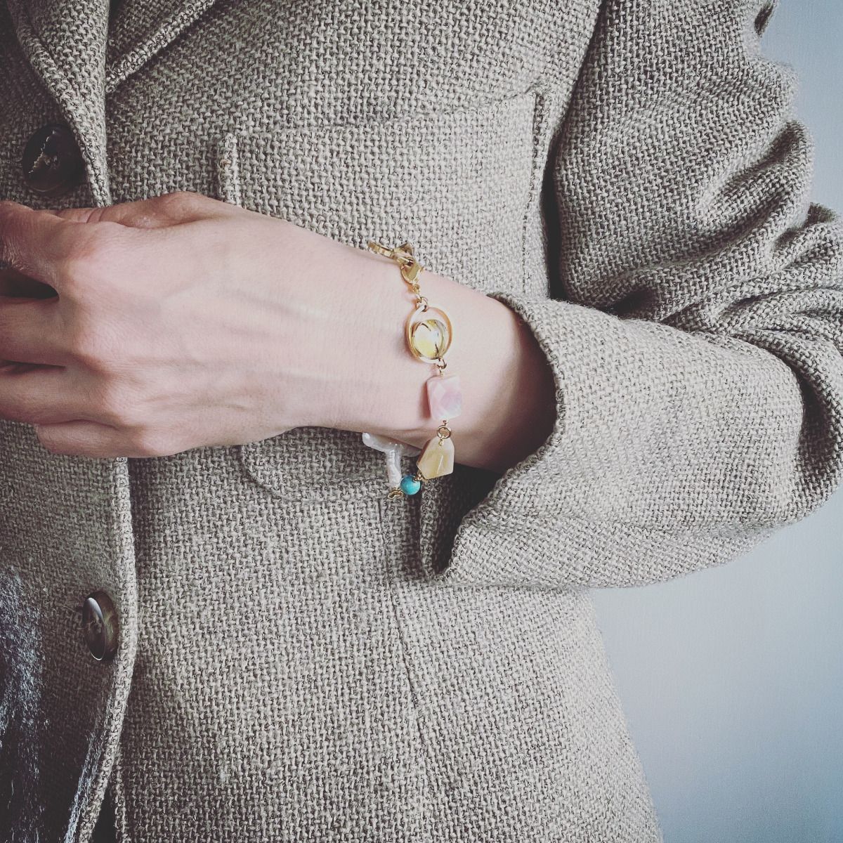 Es una pulsera de la "Serie Vine" (Oro + Azul) fabricada en resina. Dos formas diferentes de resina combinadas con caracolas rosas, cornalinas, turquesas y una perla de agua dulce en forma de cruz. El cierre se mantiene en su lugar con un anillo ornamental de resina. Úsalo como accesorio para complementar un atuendo sencillo.