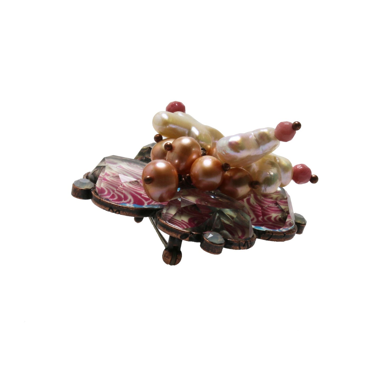 Es un broche de la "Serie Vortex" (Rosa) fabricado en resina. Las tres perlas de agua dulce en forma de cruz, las seis perlas rosadas de agua dulce y las tres rodonitas cuelgan en el centro de la resina. Tiene un diseño elegante y espléndido.