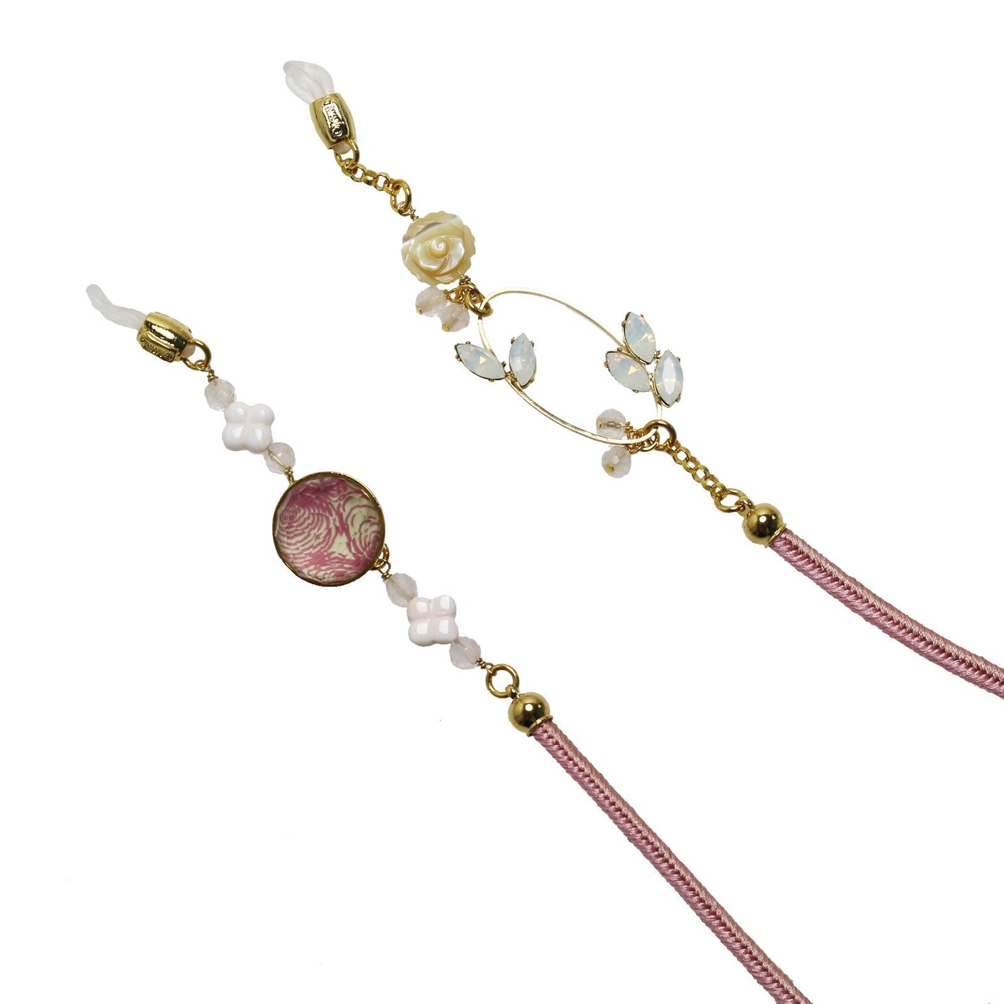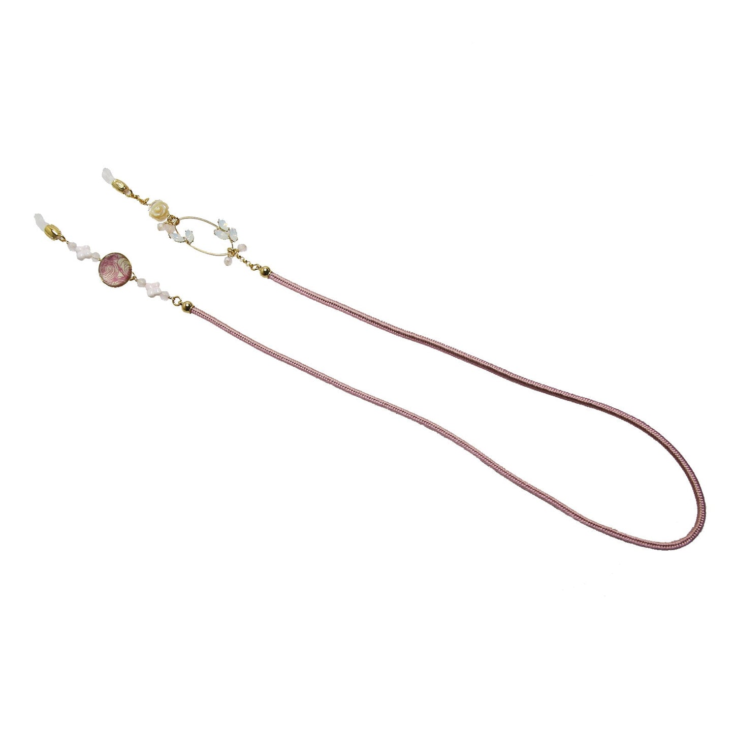 Es una cadena para gafas de la "Serie Vortex" (Rosa) fabricada en resina. Pedimos especialmente el cordón de seda a los artesanos de Kioto y lo combinamos con nácar, conchas y cuarzo rosa para que combinara con el color de la resina. Tiene un diseño impactante con pedrería talla marquesa. Los adornos se balancean alrededor de las orejas, dando al usuario la sensación de llevar pendientes.