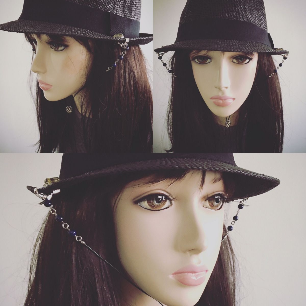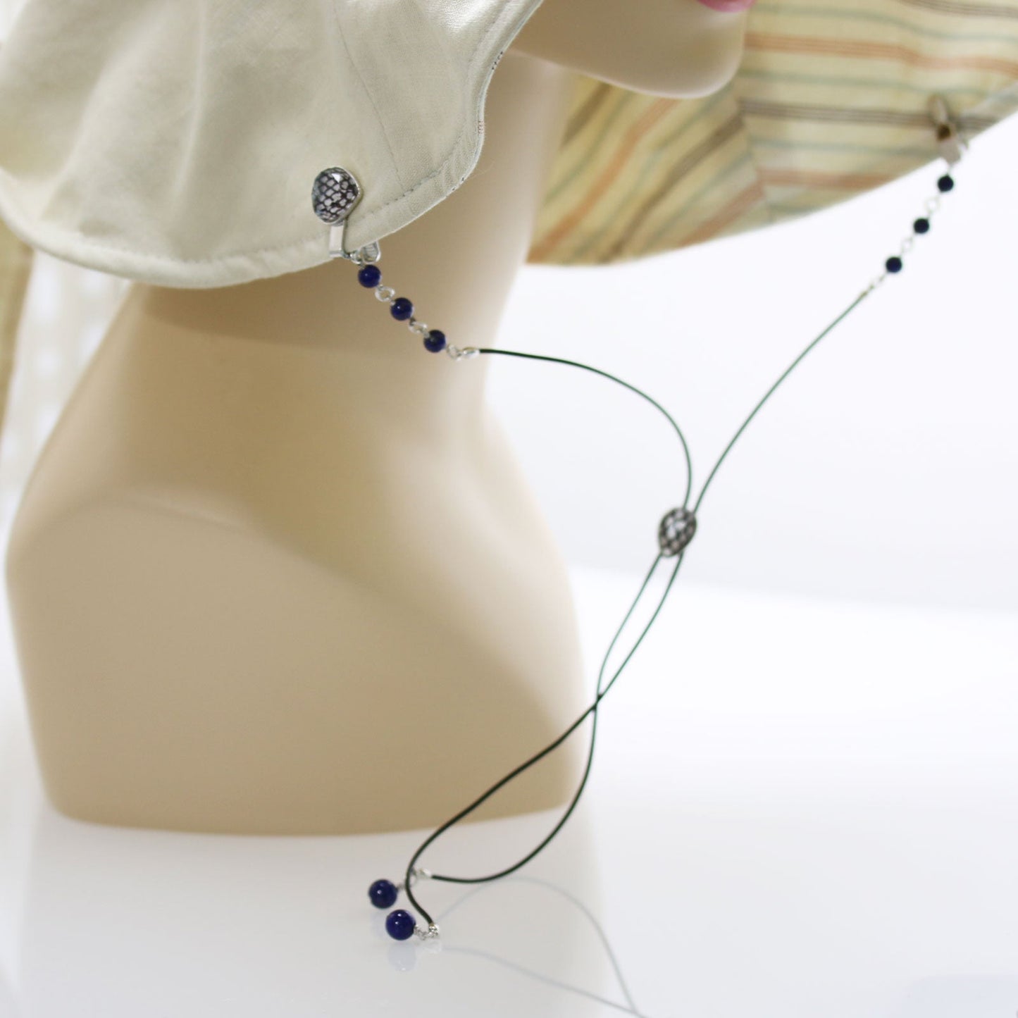 It is a hat clips using the resin parts, from the "Navy Blue Socks Series". Move the drop-type parts up or down to adjust the length of the cord to stop the collar portion of the hat in the clip. Not only in the stop so that hat does not fly, but recommended as a unique stylish accessories.