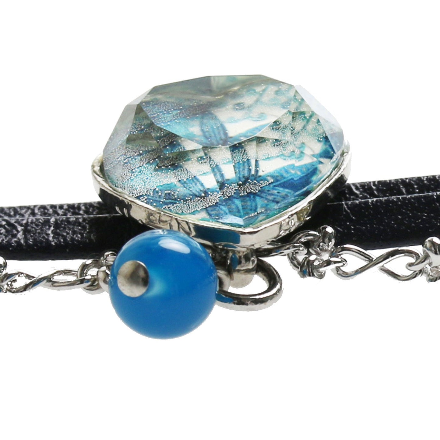 Es una tobillera que utiliza piezas de resina de "Lily Series" (Azul). Precioso diseño con correa de piel y cadena para duplicar. Combinamos ágata (tintura) según el color de la resina. Recomendado para acento único de sus pies.