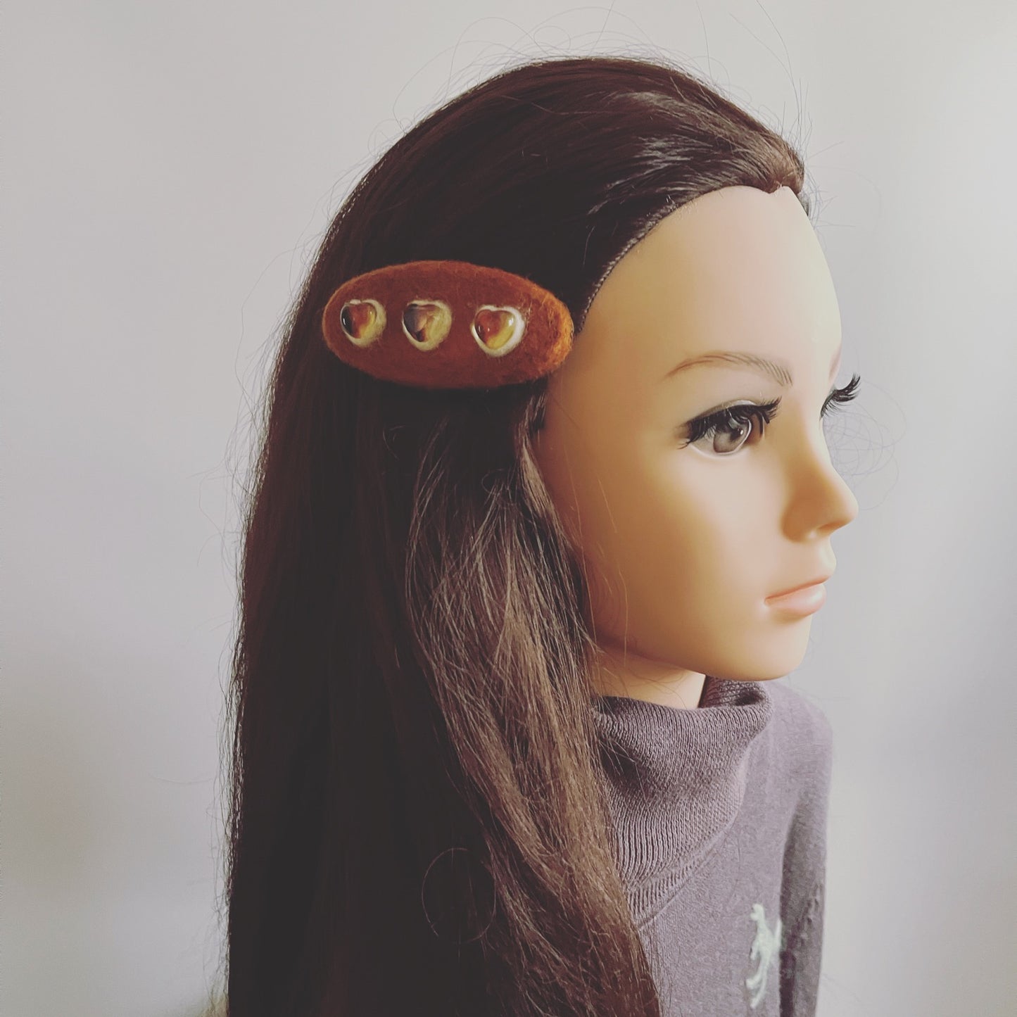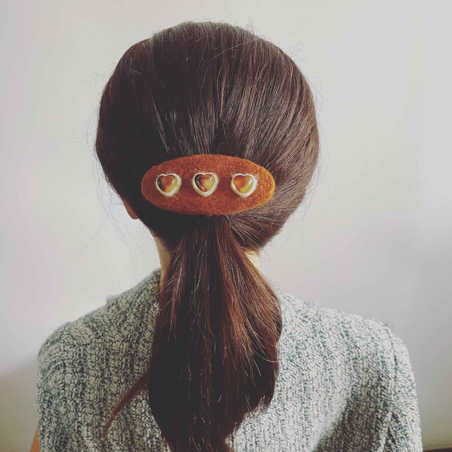 Es un pasador que utiliza piezas de resina de la "Serie Calico Cat". Es fácil de coordinar con tonos elegantes. Al acento individual del peinado por favor. La cantidad a detener es aproximadamente la mitad. También se recomienda mantenerlo como sello después de empacar con caucho. Utilizando el fieltro comprimido como base, afieltramos con lana cruda. Es un diseño cálido.